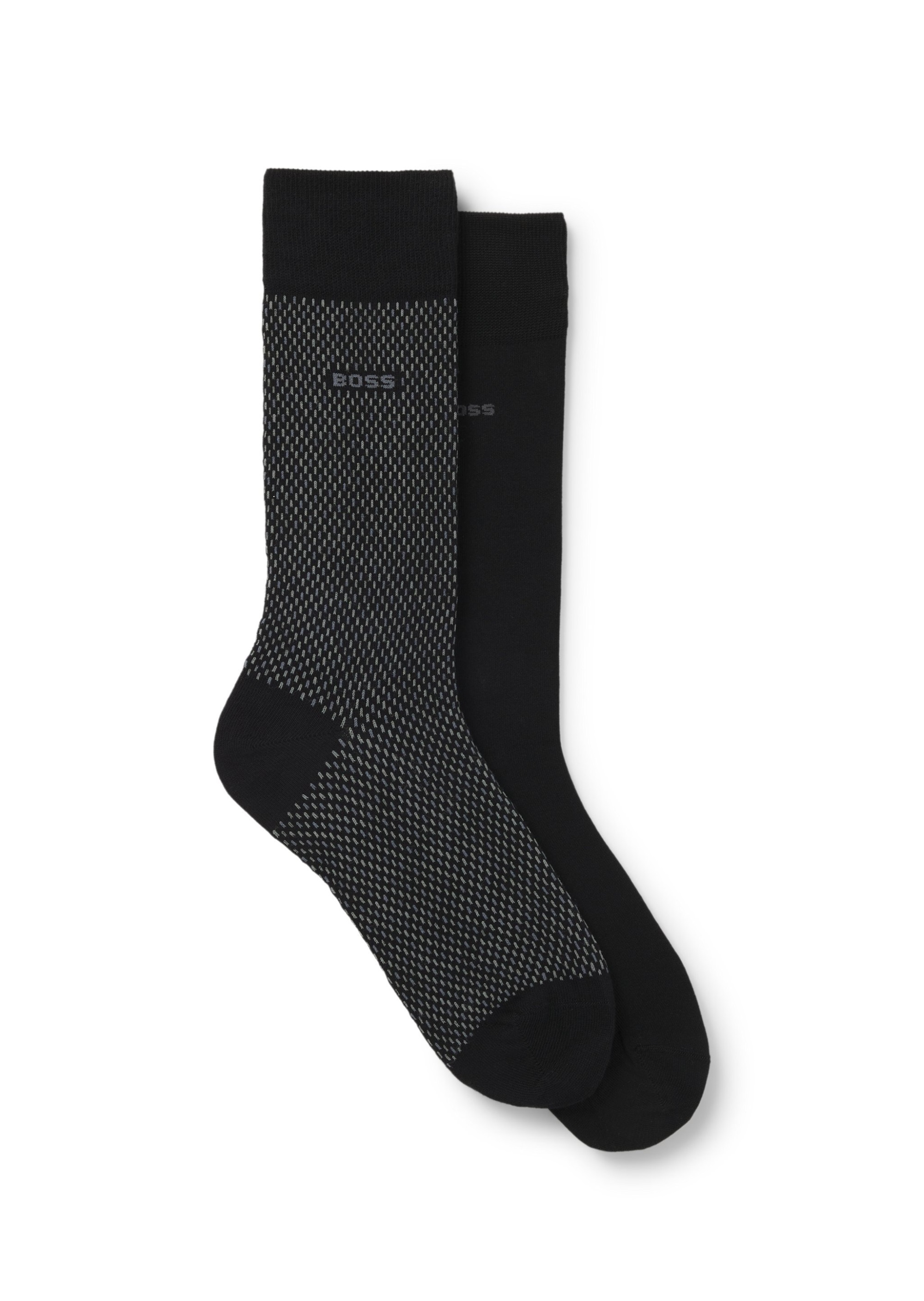Набор из двух пар чёрных носков BOSS: одна пара с тонким узором, другая однотонная, обе дополнены лаконичным фирменным логотипом. Изготовлены из эластичного смесового хлопка с плотной фактурой и усиленными участками в области пятки и носка для уверенной посадки и долговечности. Отличаются универсальным кроем и текстурой, гармонируют с классической и повседневной обувью, подчёркивая сдержанную роскошь гардероба.