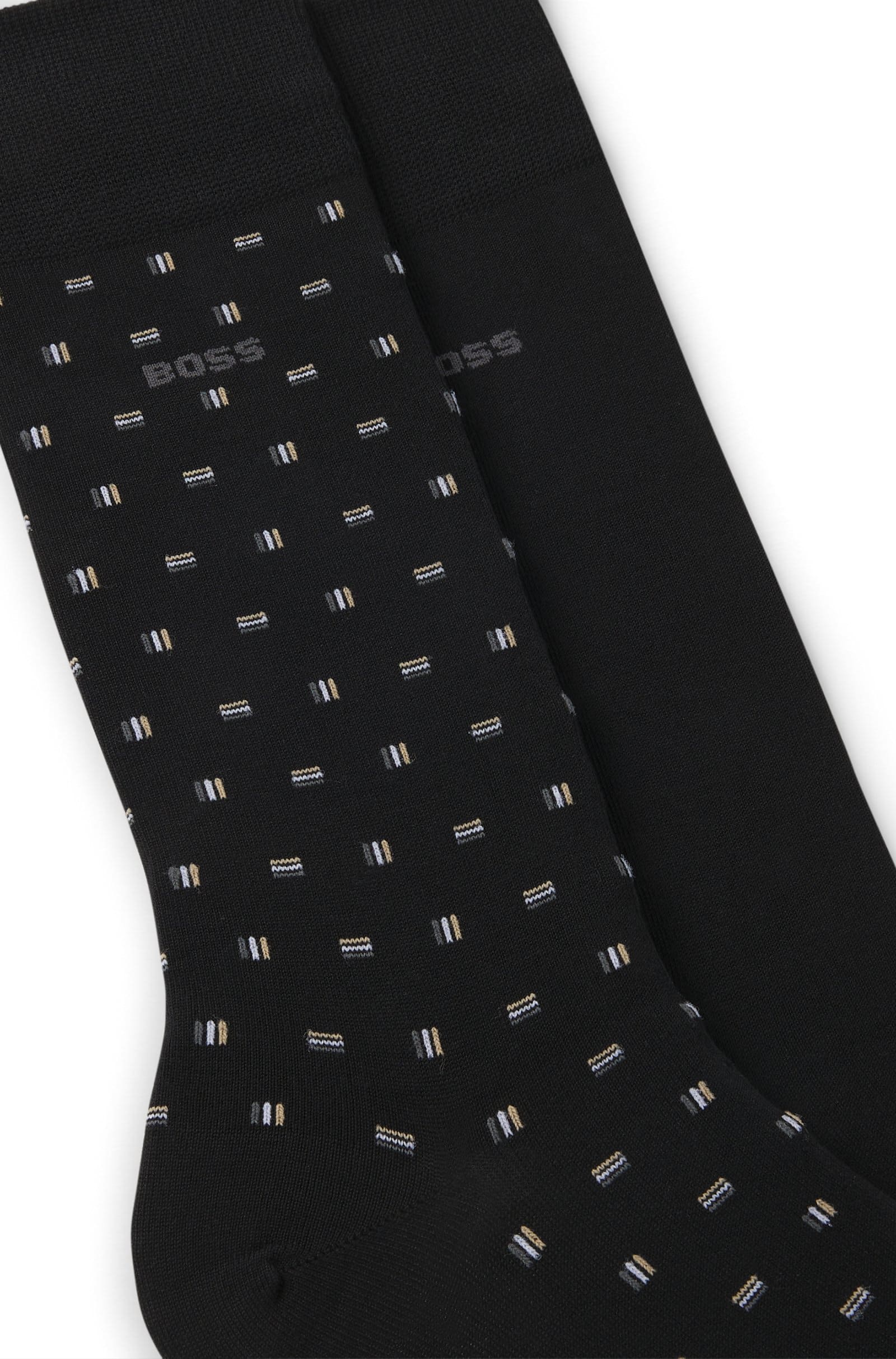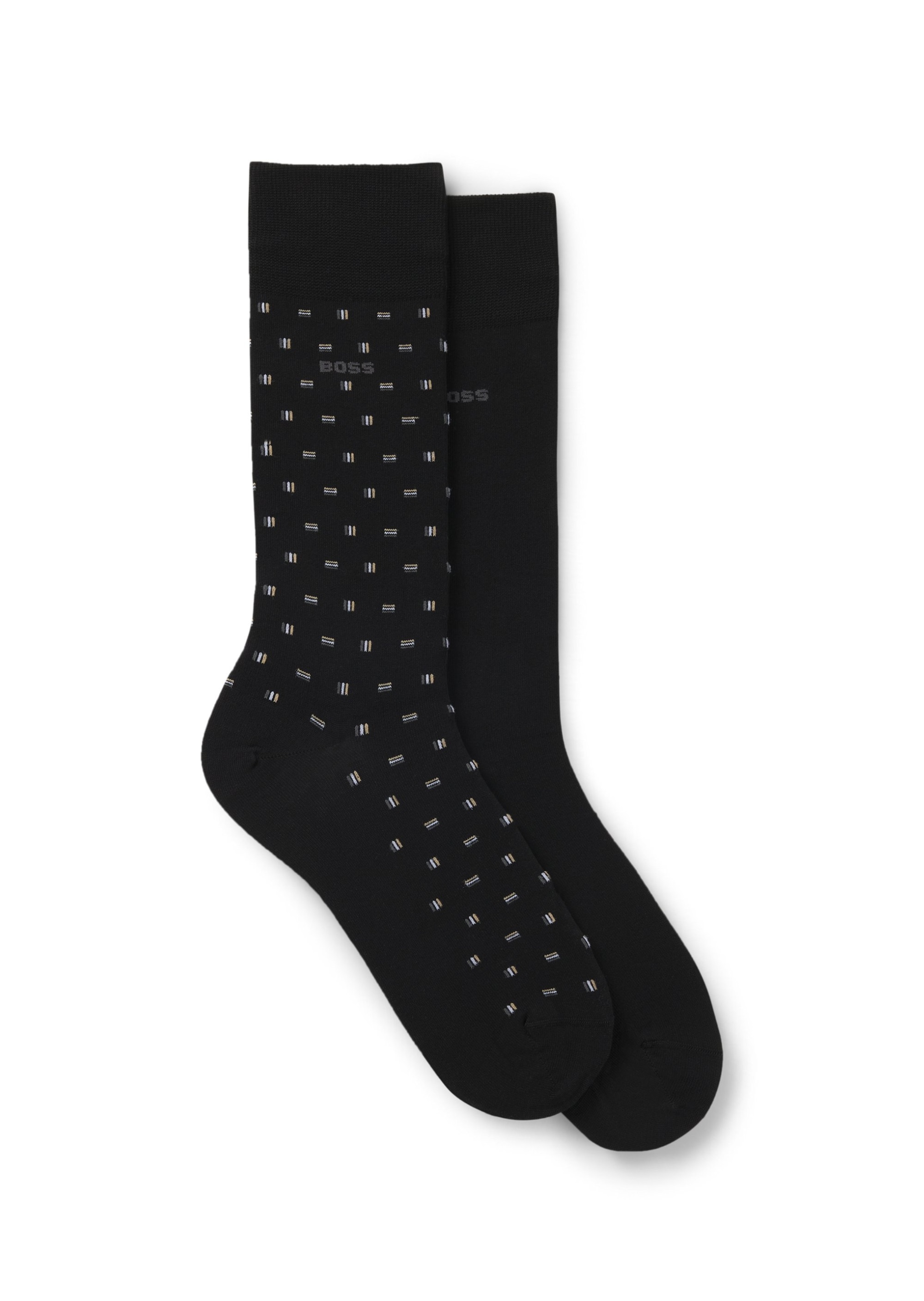 Две пары чёрных носков BOSS — одна выполнена с лаконичным узором, другая однотонная, обе украшены тонким фирменным логотипом. Изготовлены из мерсеризованного хлопково-смешанного полотна с усиленными участками пятки и носка для долговечности и мягкости. Отличаются классическим кроем и минималистичной эстетикой. Стильно сочетаются с классической обувью и повседневной обувью BOSS, становясь незаметным акцентом роскоши и надёжным дополнением гардероба.