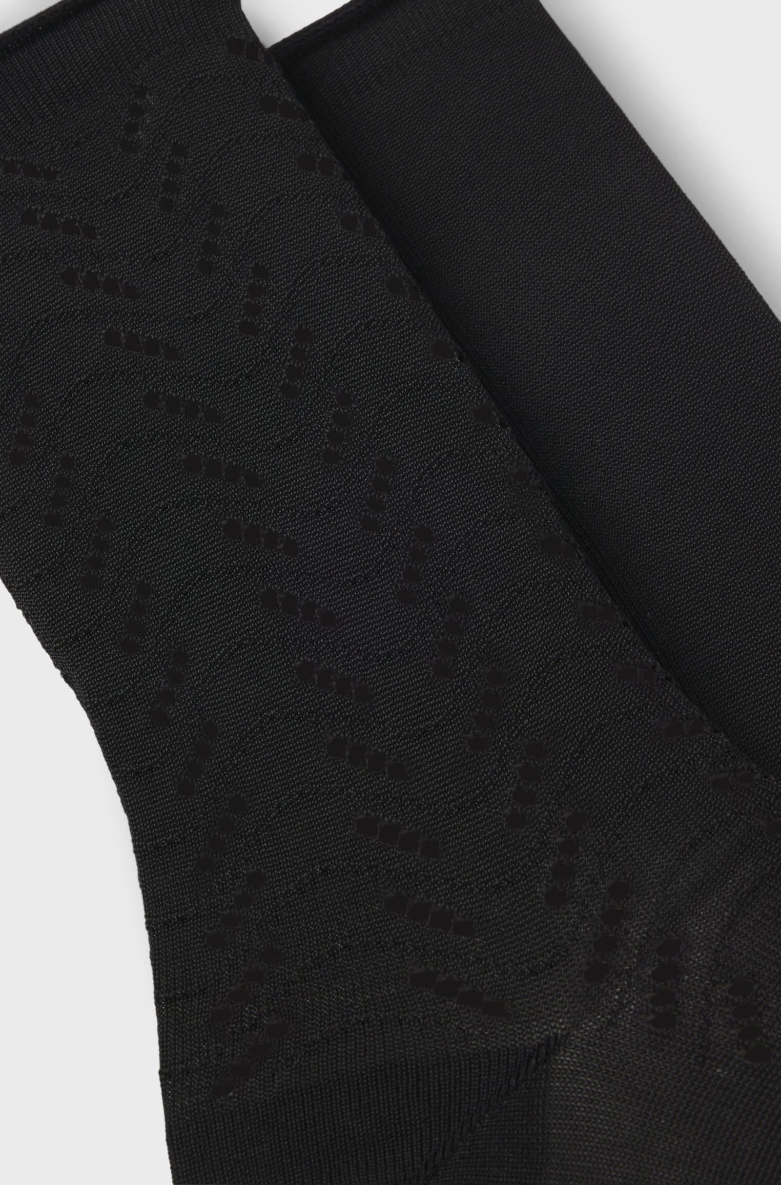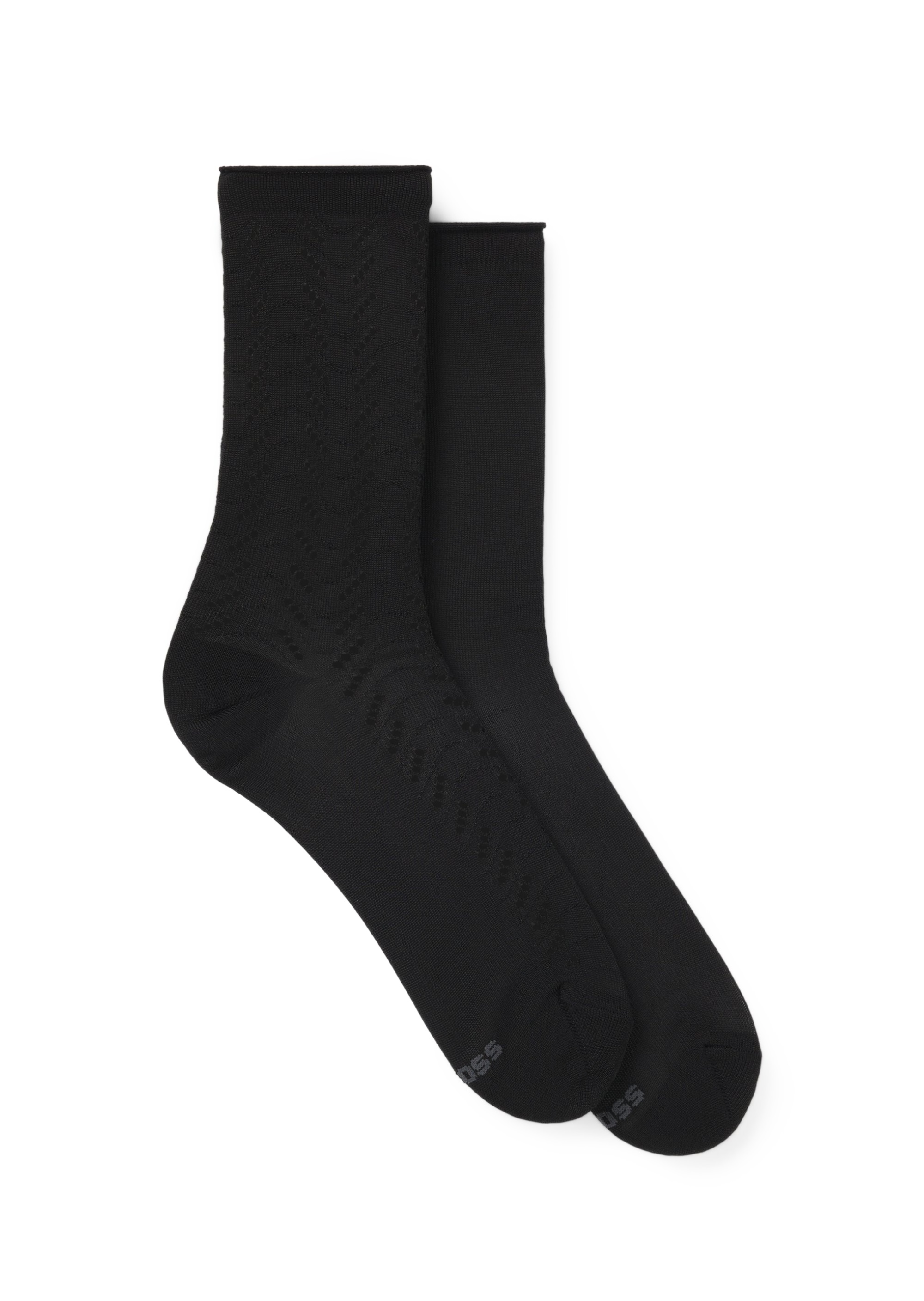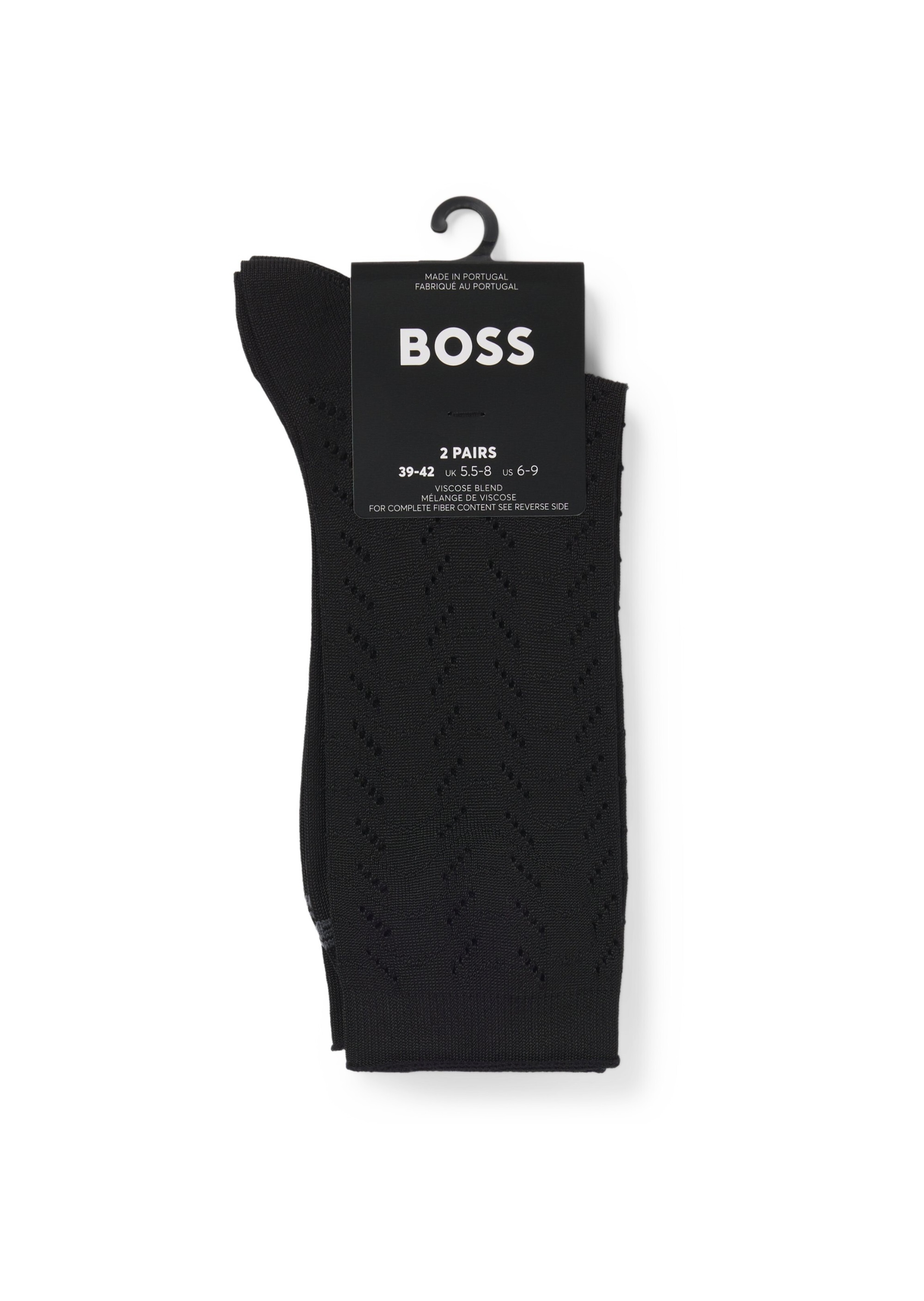 Носки BOSS в наборе из двух пар чёрного цвета выполнены из мягкого смесового трикотажа на основе вискозы и полиамида. Одна пара представлена в однотонном исполнении, другая украшена изящным узором «шеврон». Материал из целлюлозных волокон обеспечивает воздухопроницаемость и комфорт в течение дня. Длина до середины голени делает их универсальными в сочетании с классической или повседневной обувью. Практичный комплект, сочетающий функциональность и фирменный стиль бренда.