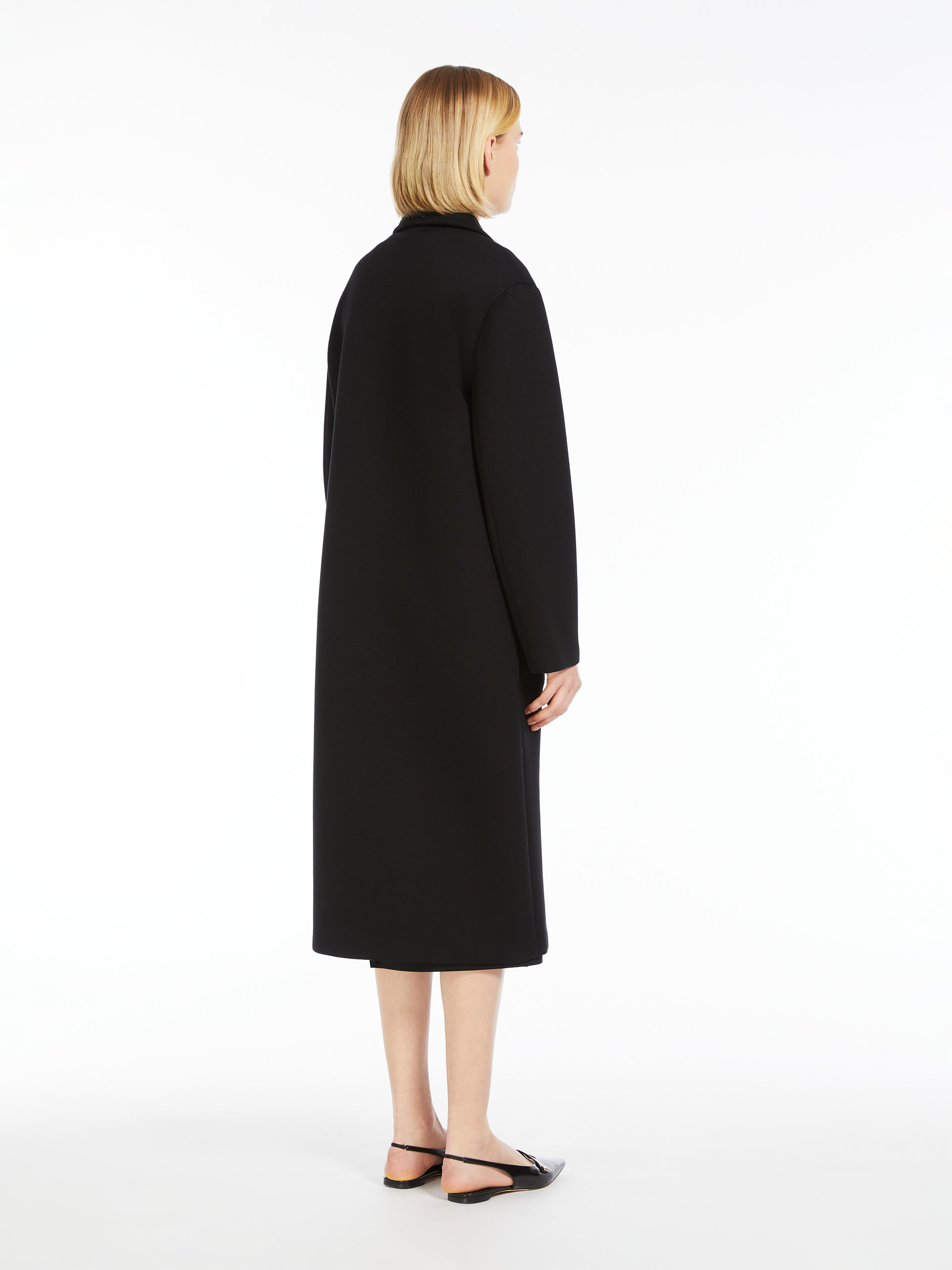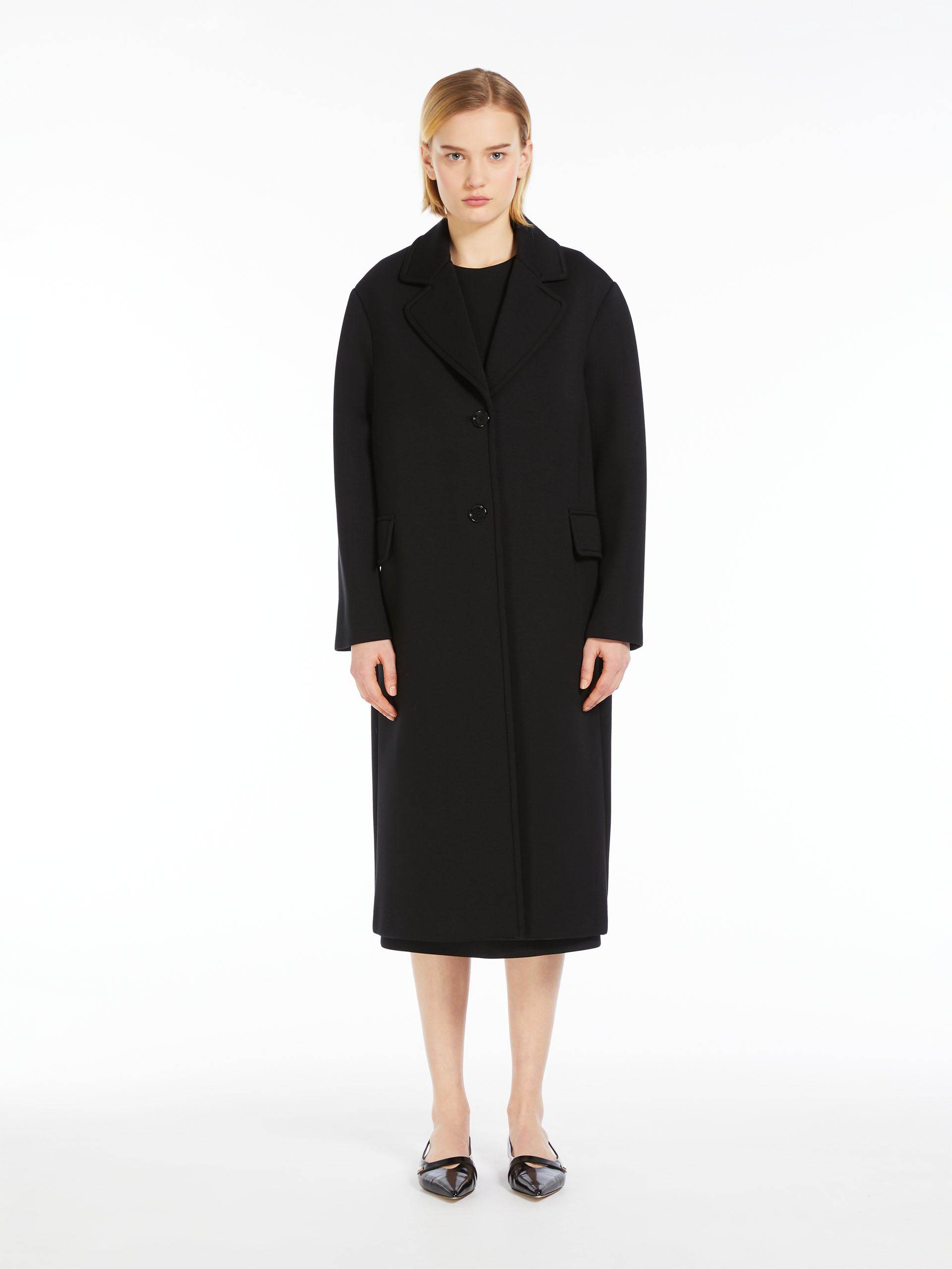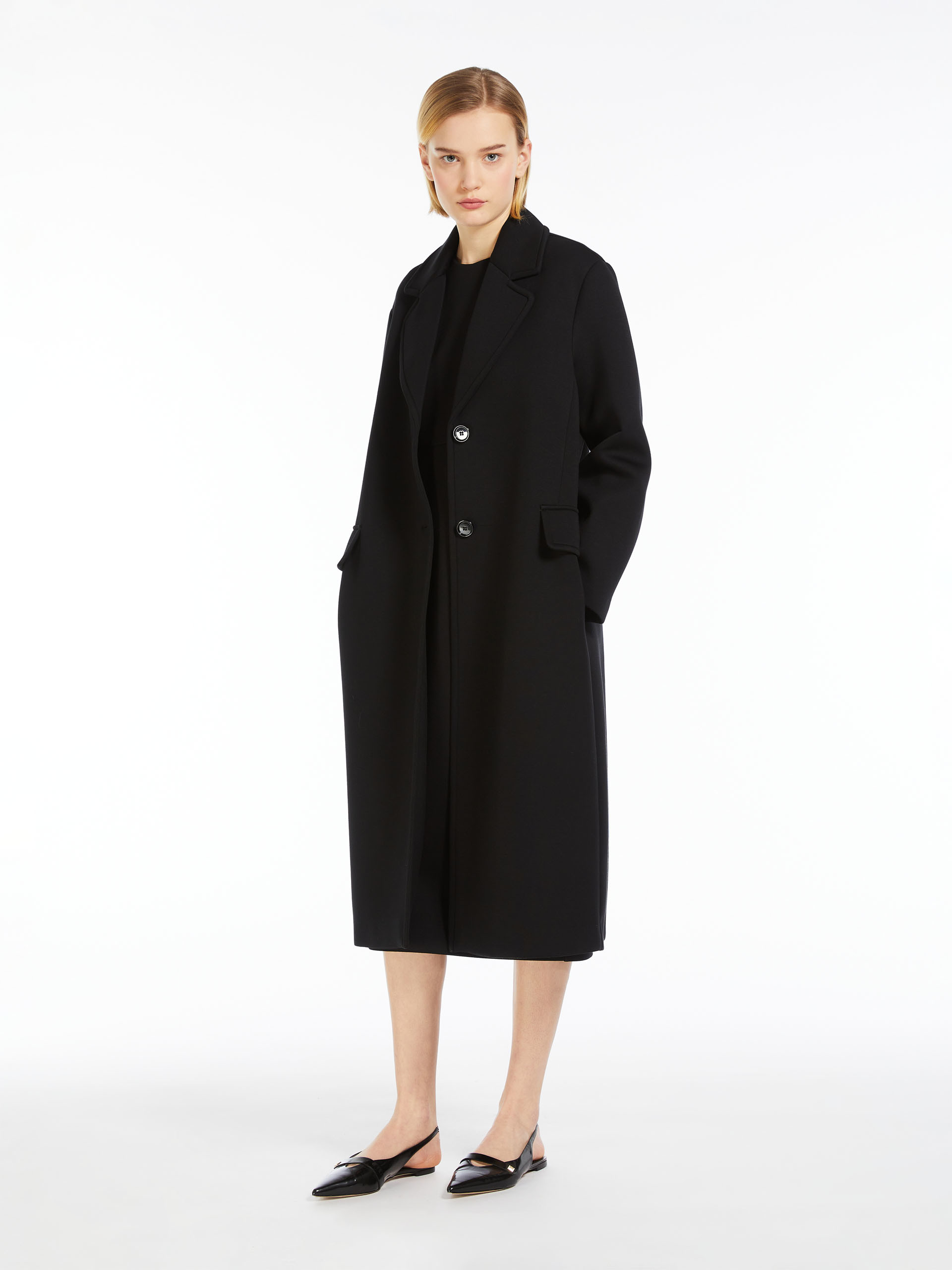 Однобортное пальто миди из мягкого клееного вискозного трикотажа. Прямой крой с воротником с лацканами, спущенными плечами и вставными боковыми карманами с клапаном спереди. Застежка на две пуговицы.