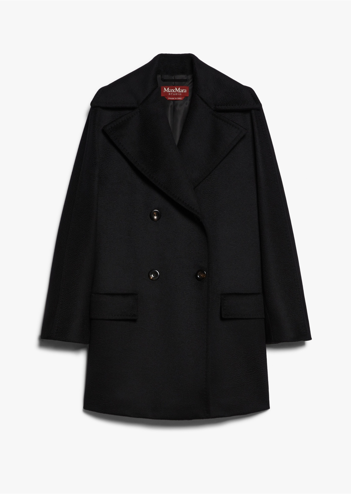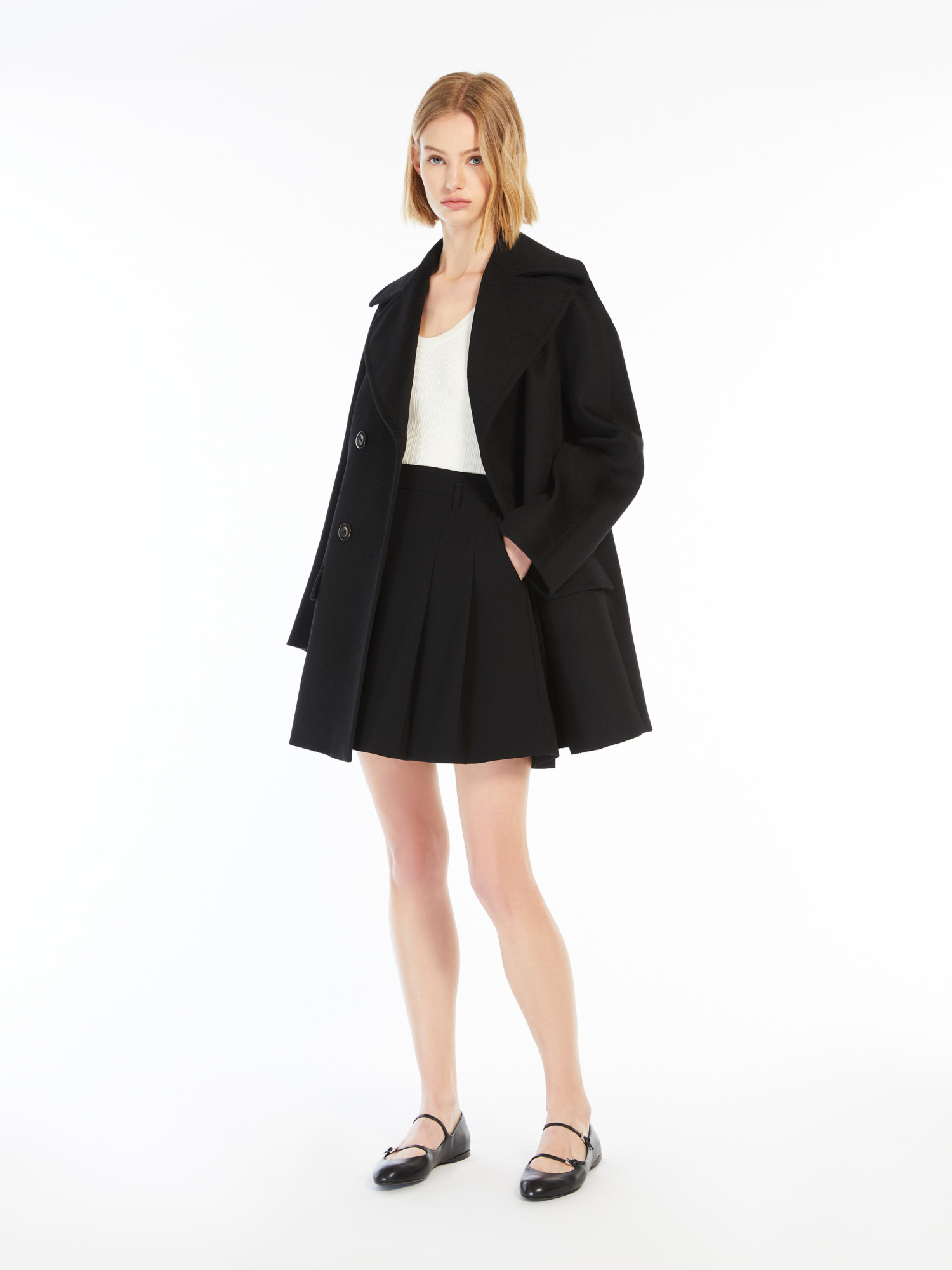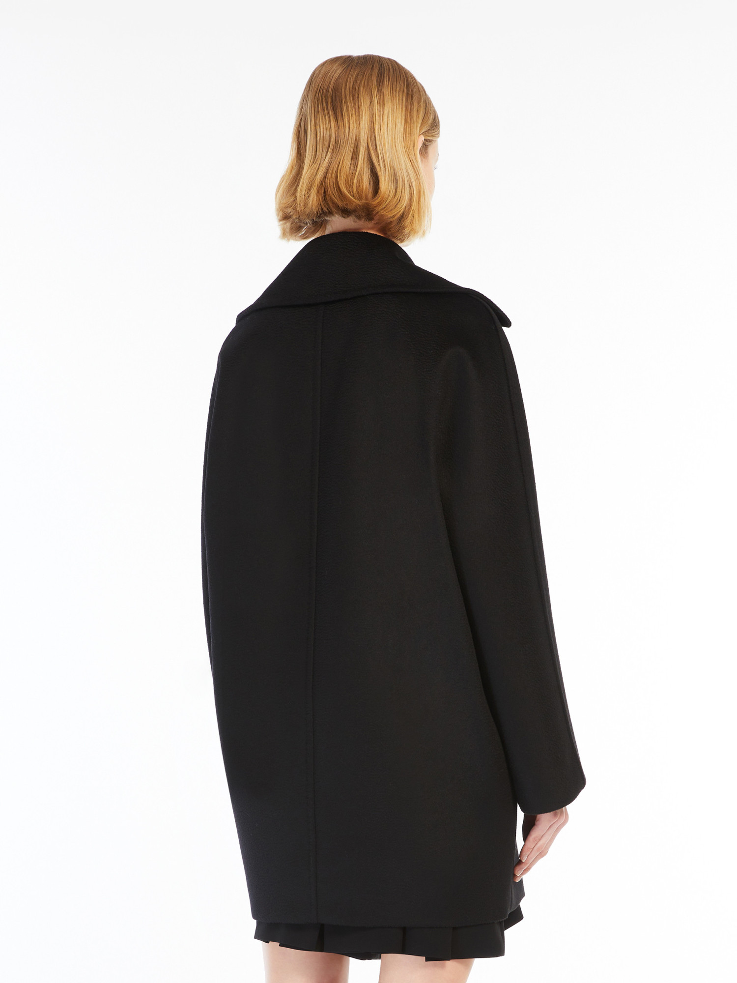 Пальто, выполнено из роскошной драповой шерсти, с широким воротником с лацканами и длинными рукавами-кимоно. Модель на подкладке отличается удобной посадкой, дополнена прорезными карманами и накладным клапаном спереди. Застежка спереди на четыре видимые пуговицы.