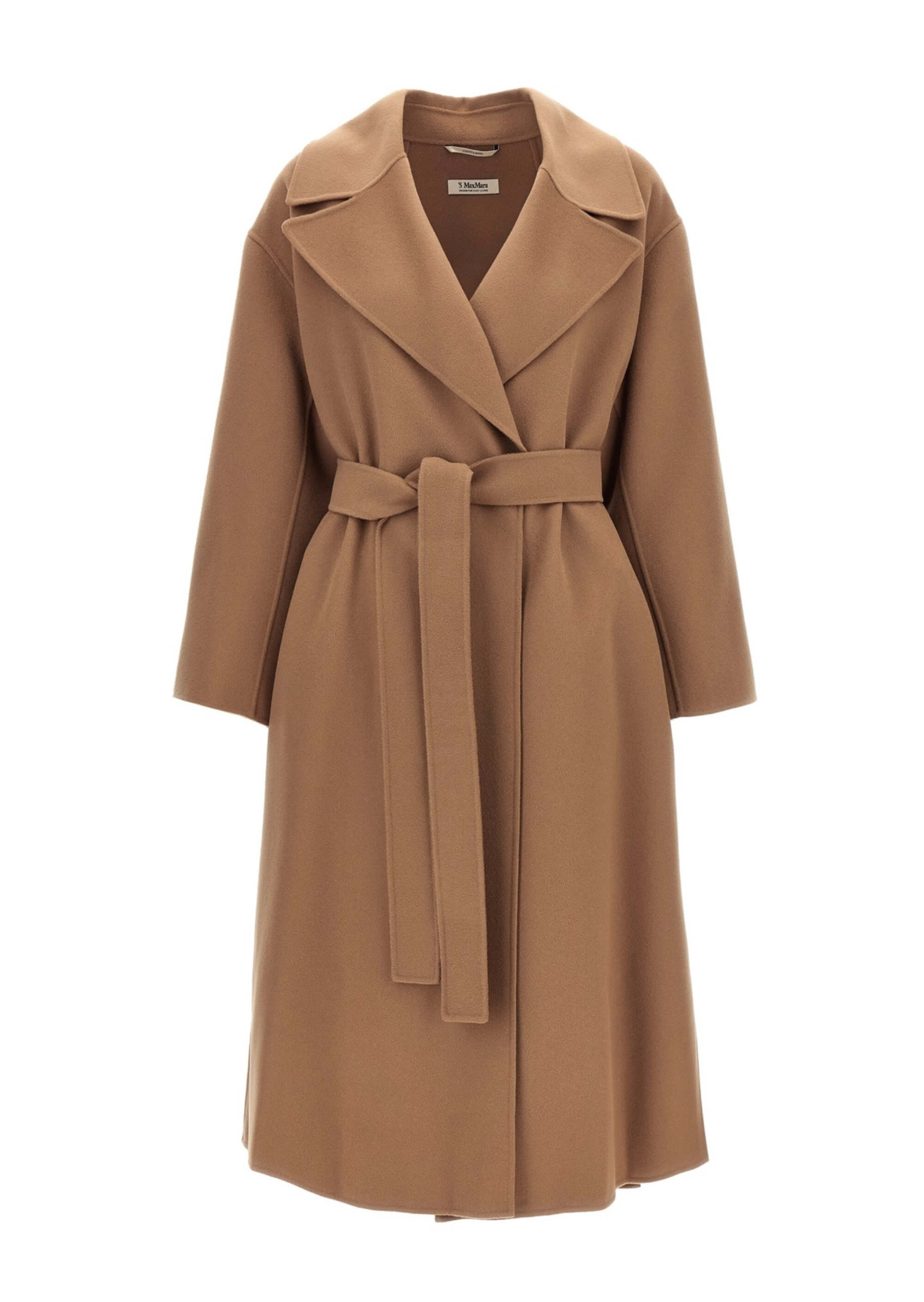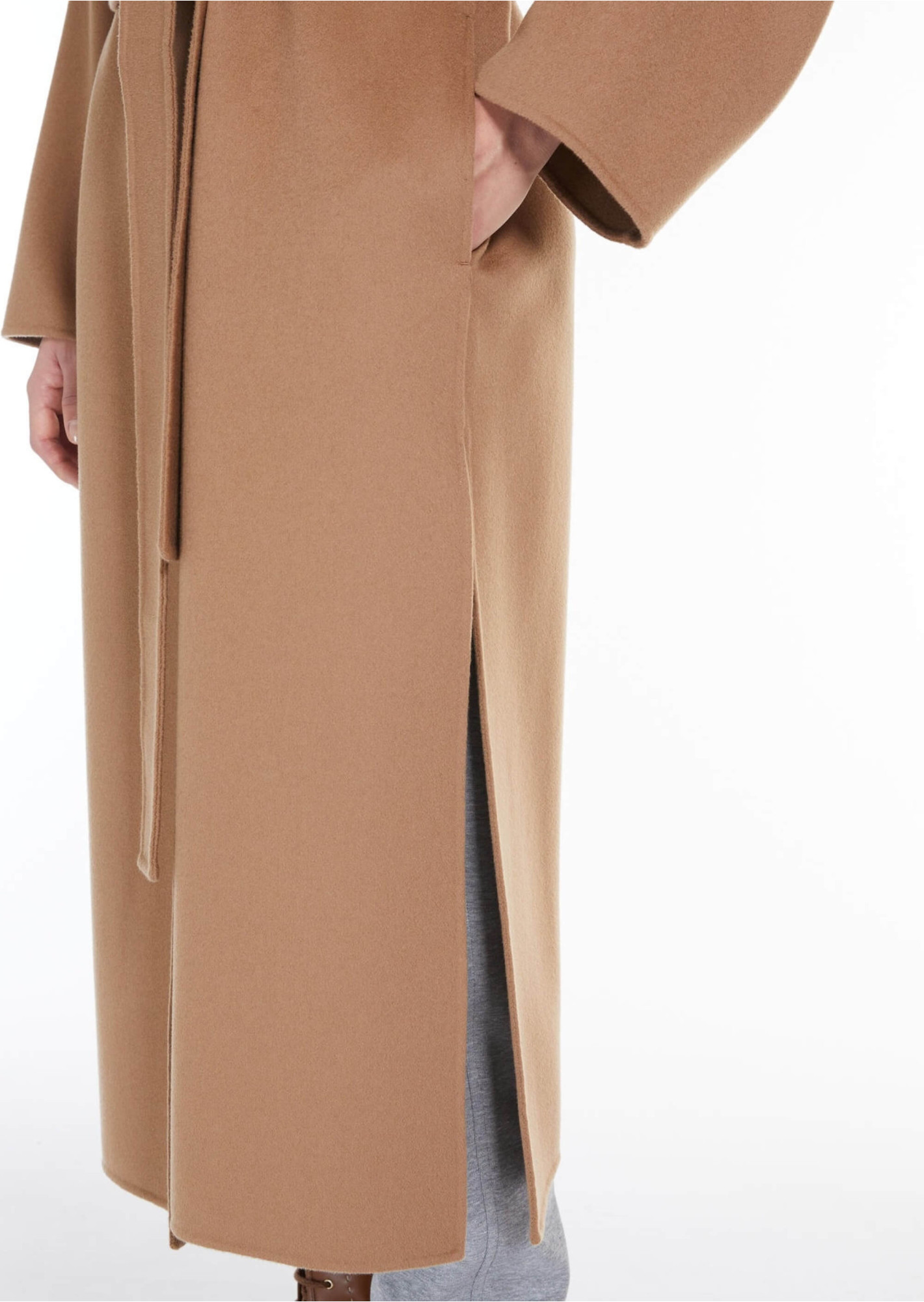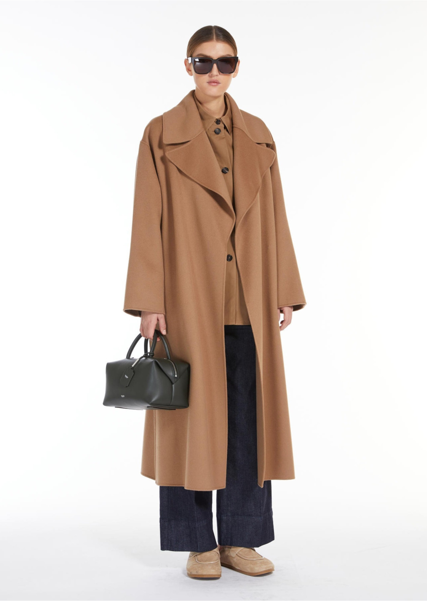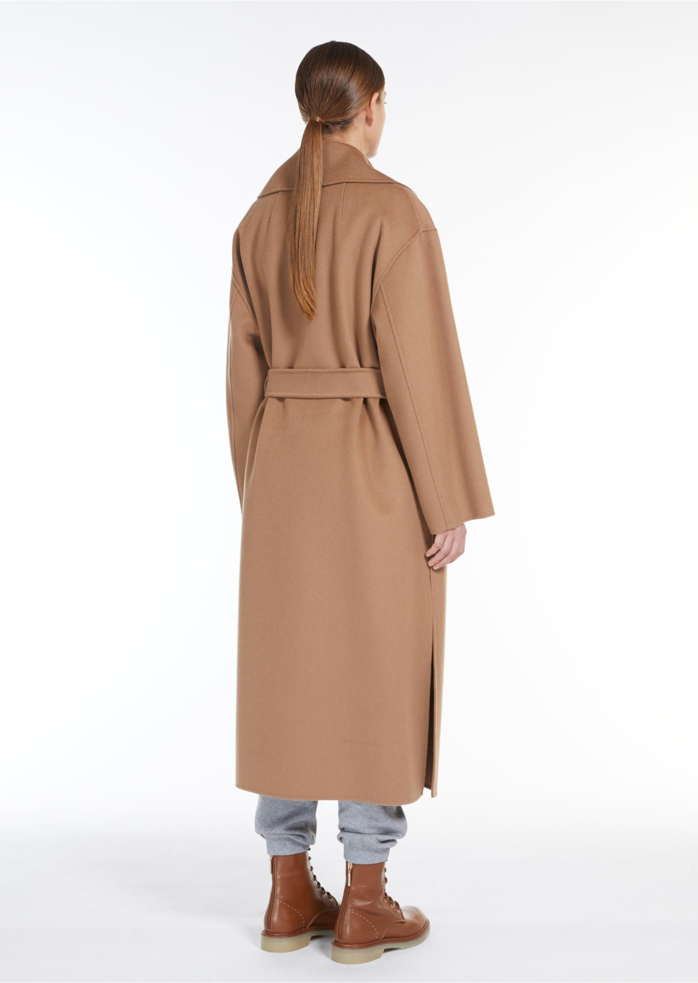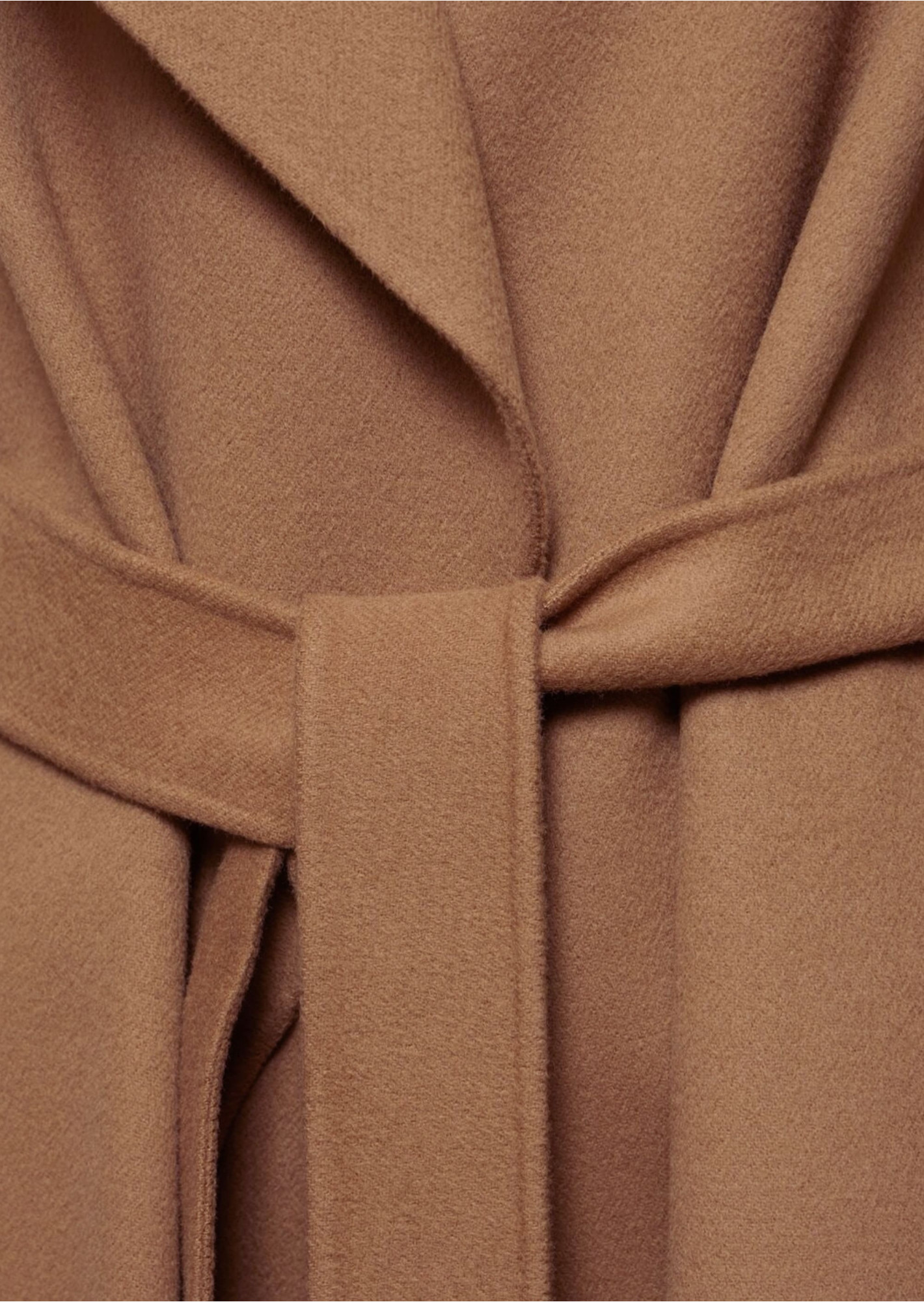 Длинное пальто, выполнено из тонкой двусторонней ткани из чистой шерсти. Этот фасон отличается слегка расклешенным книзу силуэтом, широким воротником с лацканами и карманами в боковых швах. Ремень в тон подчеркивает линию талии.