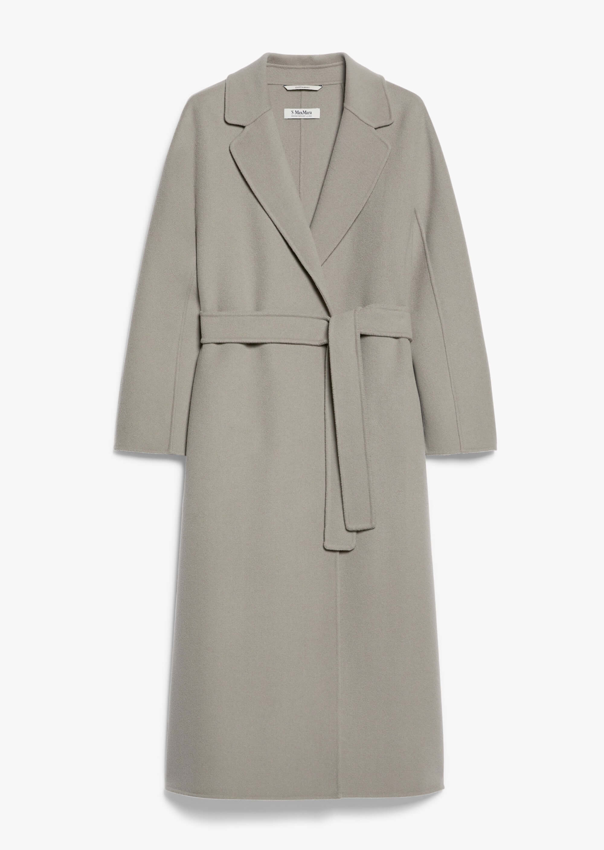 Пальто миди прямого кроя, слегка расклешенное к низу, выполнено из тонкой двусторонней ткани из чистой шерсти. Модель без подкладки имеет воротник с лацканами, карманы в боковых швах и рукава-кимоно. Ремень в тон подчеркивает фигуру.