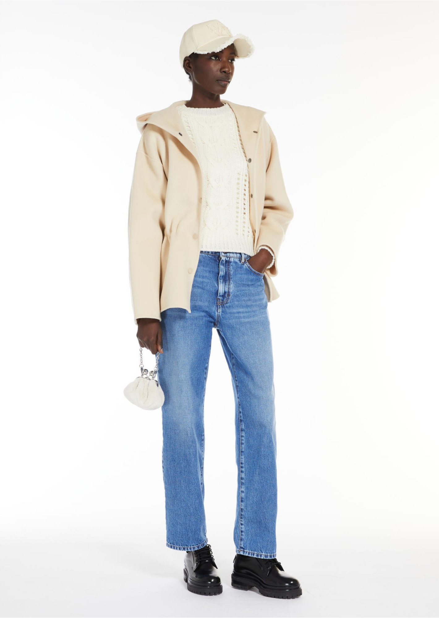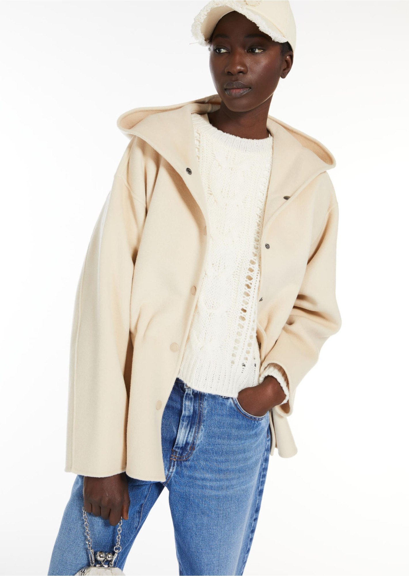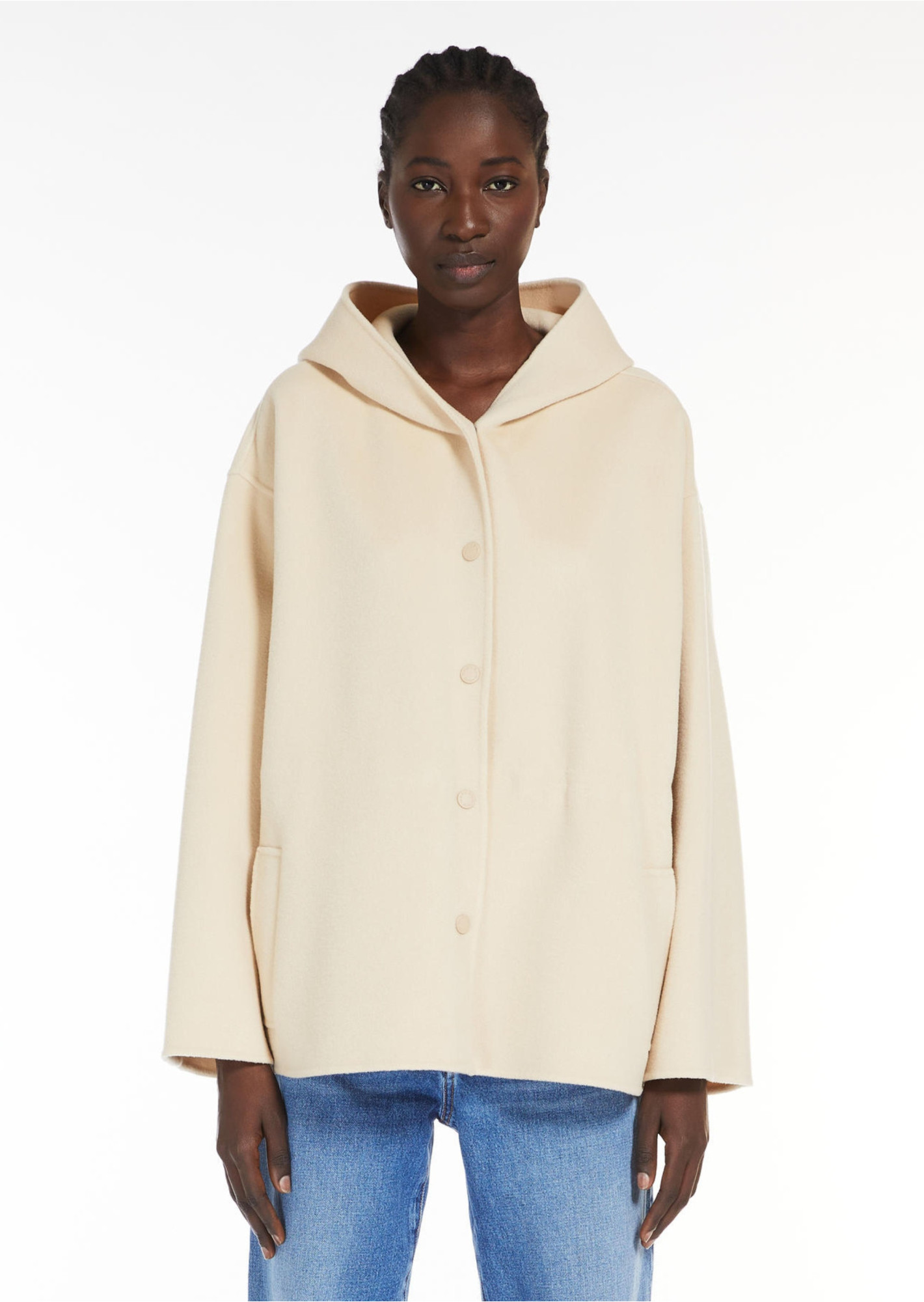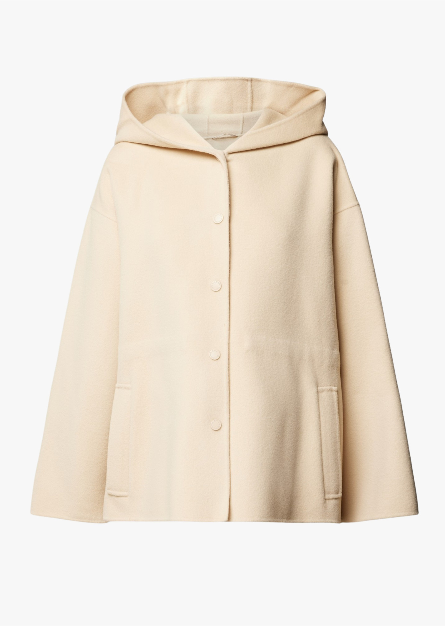 Пальто с капюшоном, выполнено из тонкой двусторонней ткани из чистой шерсти. Модель без подкладки, дополнена длинными заниженными втачными рукавами. Талия регулируется шнурком, боковые прорезные карманы.