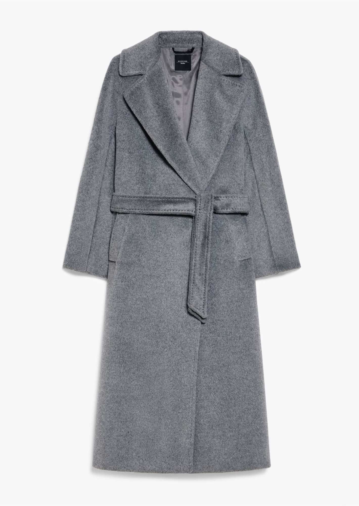 Длинное пальто с запахом из смеси шерсти и альпаки. Модель на подкладке, расклешенного кроя, с широким воротником с лацканами, длинными рукавами-кимоно и прорезными карманами. Центральная шлица сзади. Закрученная застежка и пояс в тон подчеркнут женственный силуэт.