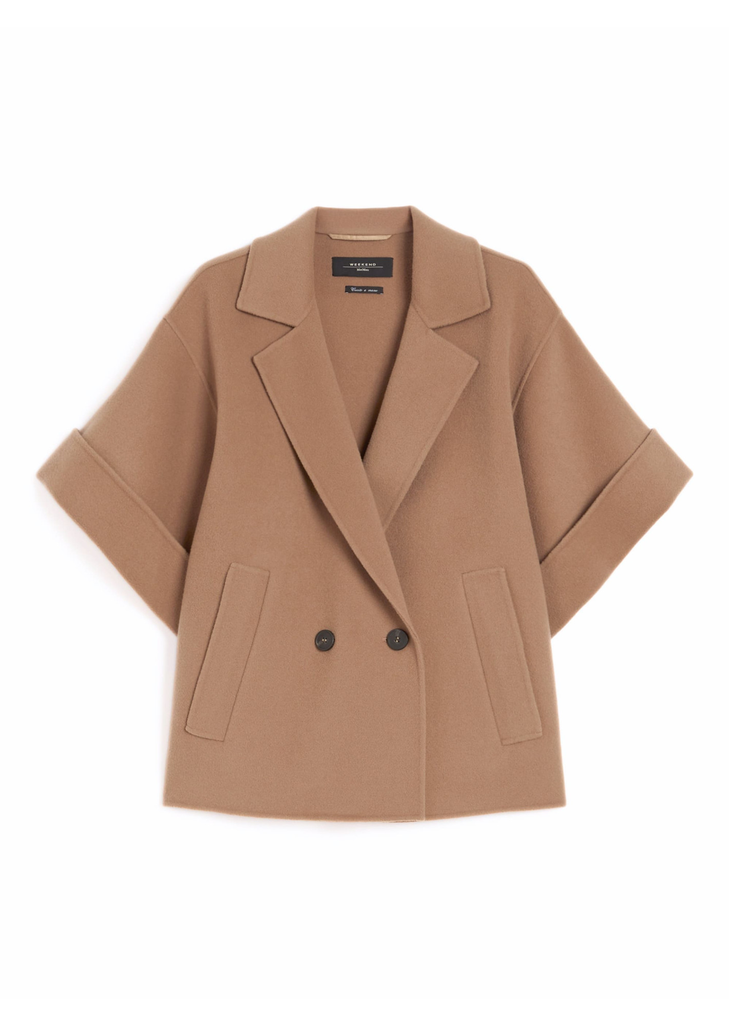 Короткое двубортное пальто Weekend Max Mara из плотного валяного сукна из 100% чистой шерсти. Выполнено вручную в технике двойного полотна, что обеспечивает мягкость, лёгкость и благородную посадку. Прямой свободный силуэт с заниженной линией плеч и укороченными рукавами с отворотом создаёт актуальный объём и графичность. Глубокий лацкан, открытая застёжка на две пуговицы и вертикальные прорезные карманы подчёркивают сдержанный стиль. Тёплый ореховый оттенок гармонично сочетается с джинсами, брюками и трикотажем, создавая выразительный образ для прохладного сезона. Это пальто воплощает минимализм и мастерство пошива Weekend Max Mara — выбор для ценителей натуральных тканей и архитектурного кроя.