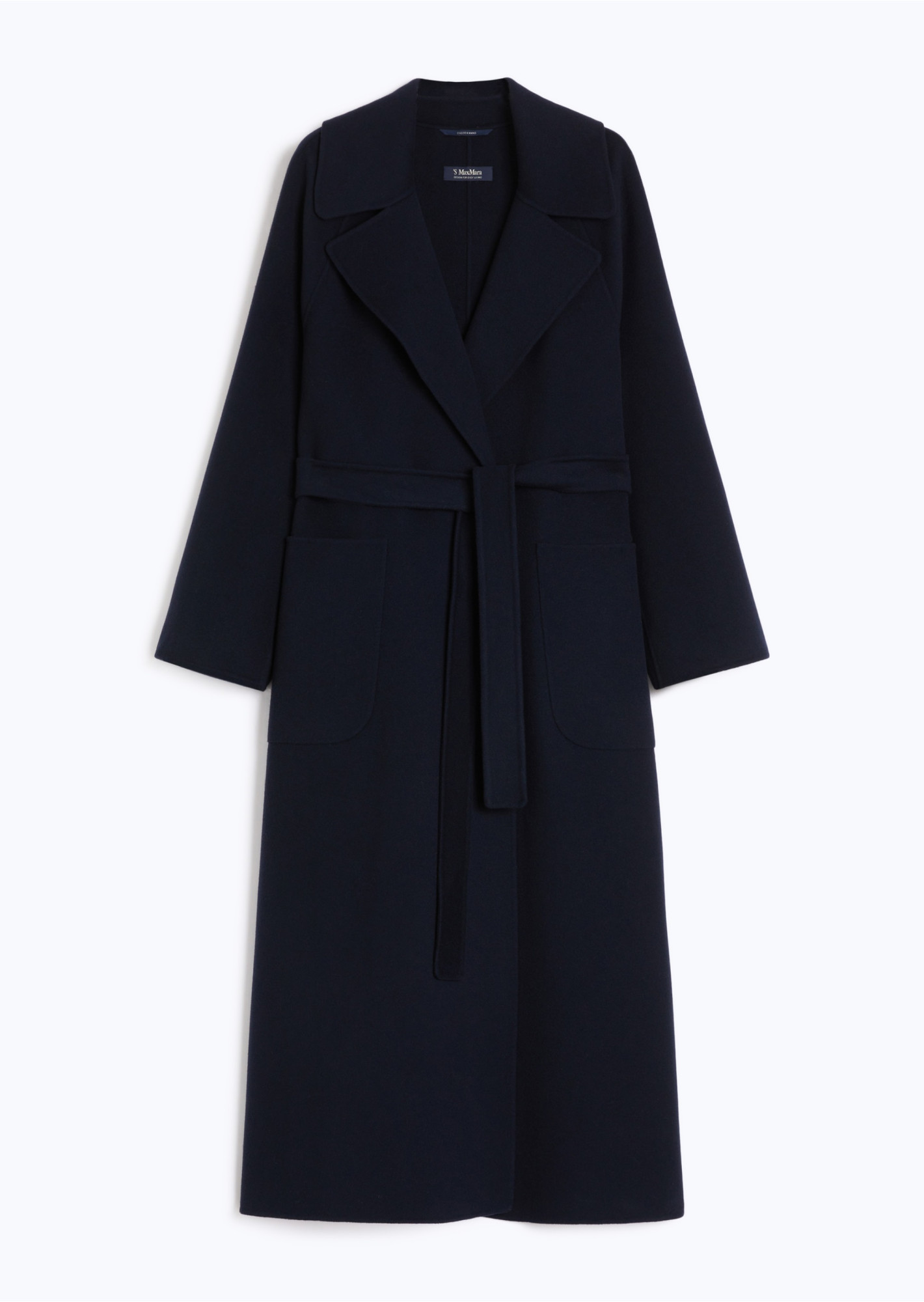 Длинное черное пальто Max Mara S из чистой шерсти с объёмным запахом и поясом на талии. Ручная сборка, двусторонняя ткань и мягкая посадка по фигуре. Широкий лацкан, рукава-реглан, накладные карманы и центральная шлица сзади подчёркивают архитектурность силуэта. Сочетается с трикотажем, прямыми брюками, платьями миди и высокими сапогами. Актуальная классика для холодного сезона — тёплое, пластичное и выразительное.