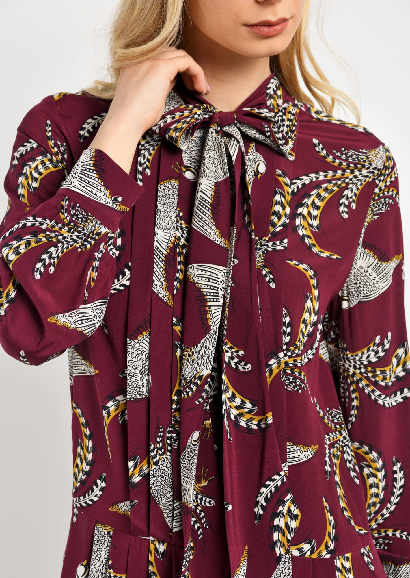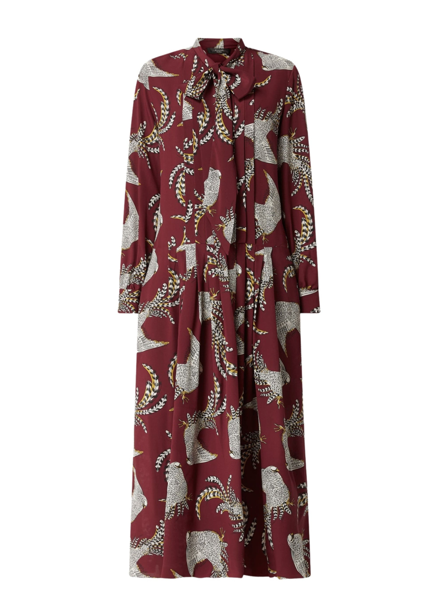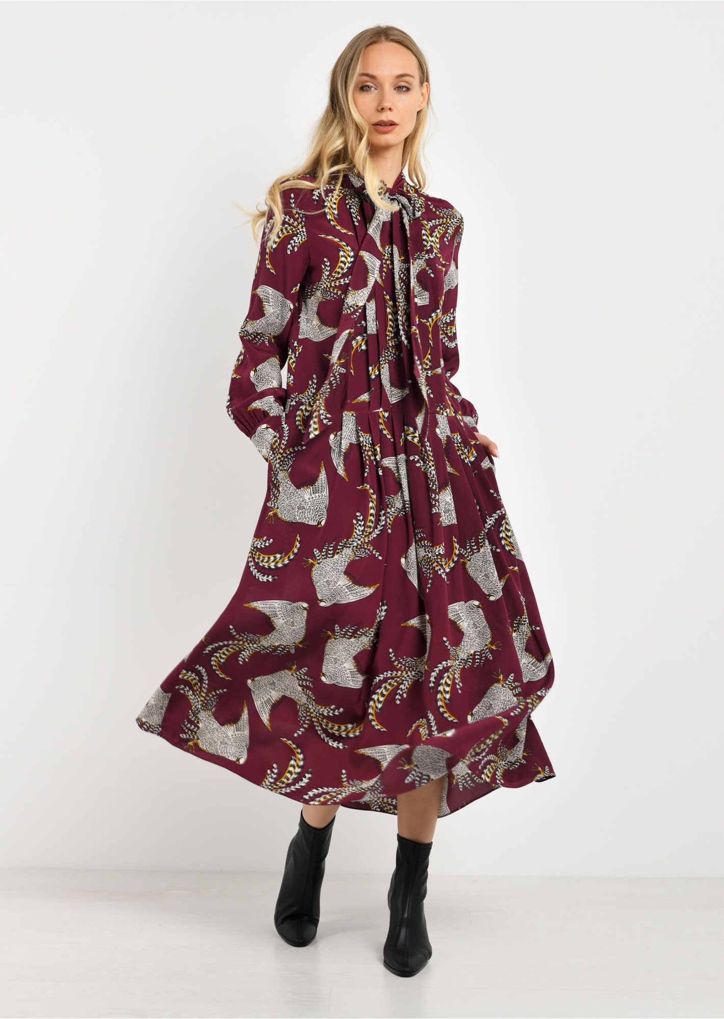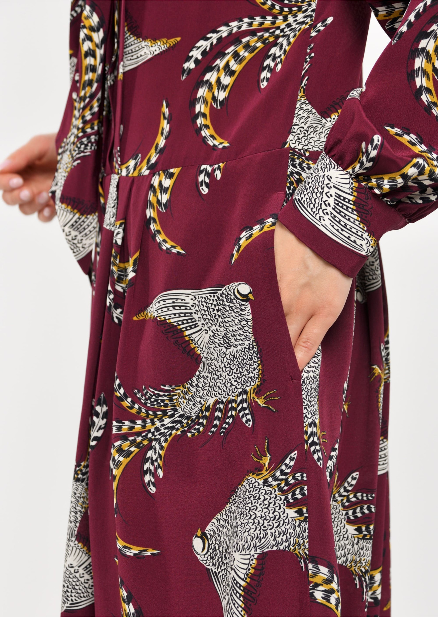 Платье-рубашка миди из чистого шелкового крепдешина с принтом, воротником-стойкой, боковыми карманами и врезными рукавами с манжетами. Расклешенный фасон без подкладки с полной расклешенной юбкой. Застежка на потайные пуговицы спереди и соответствующий пояс