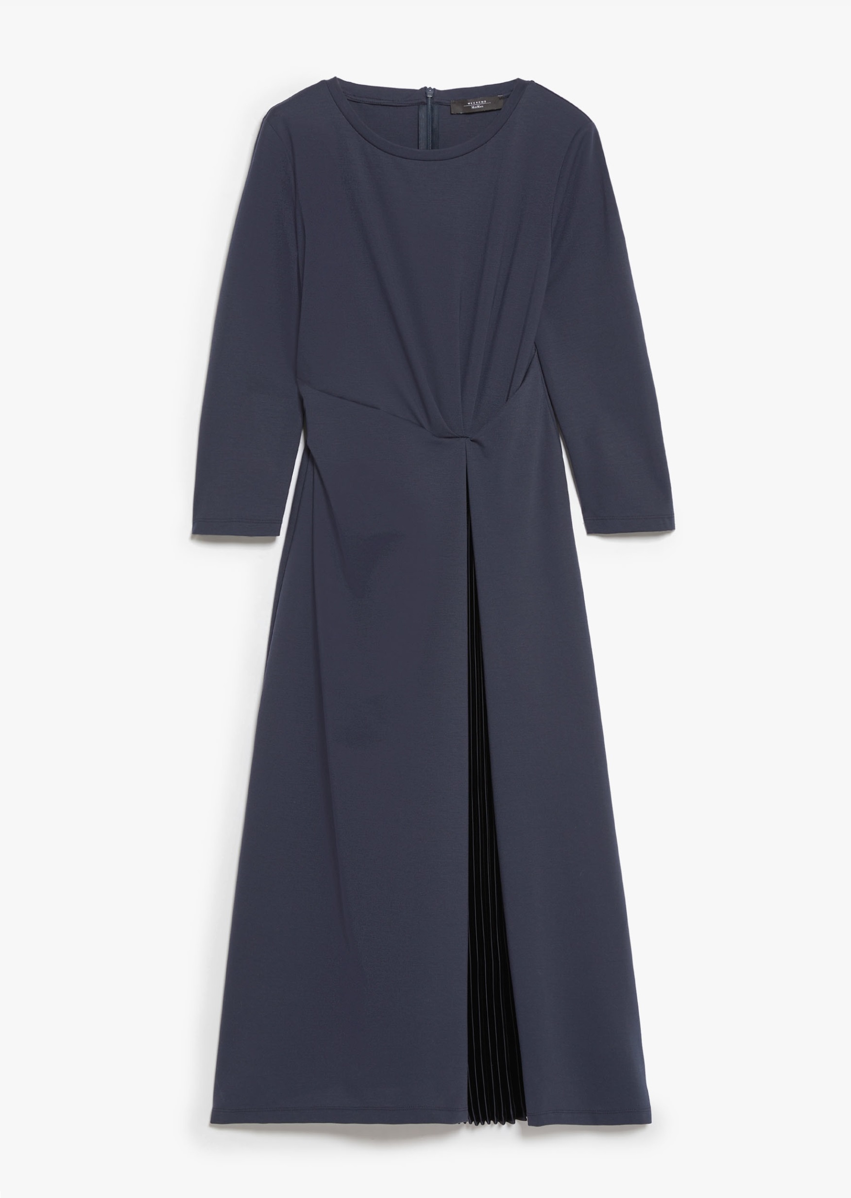 Длинное платье с круглым вырезом из мягкого трикотажа из лиоцелла имеет свободный крой и расклешенный. Линия талии подчеркнута ассиметричными складками под грудью и атласной изнаночной складкой, которая придает юбке небольшой объем. Имеет 3/4 рукава.