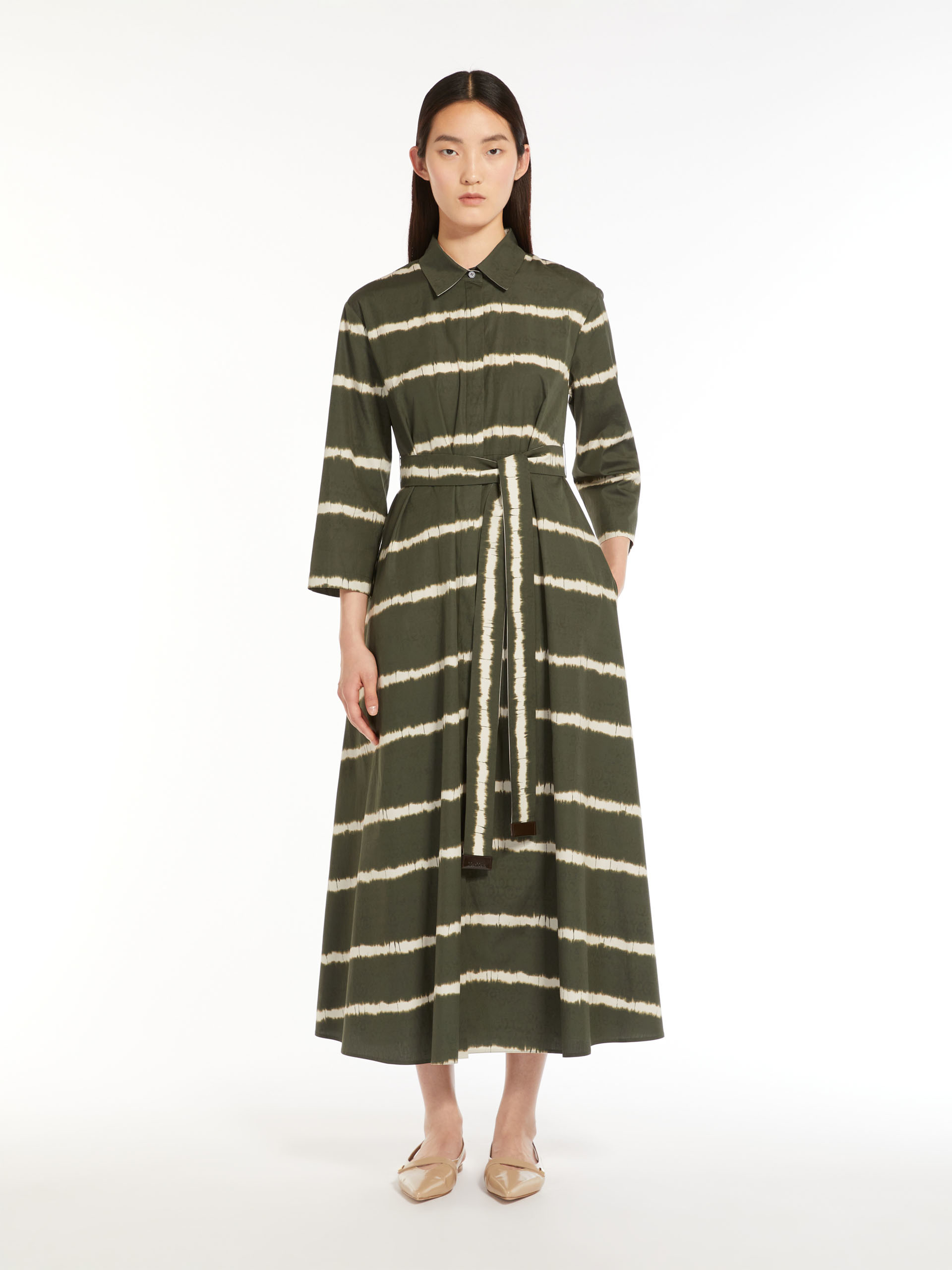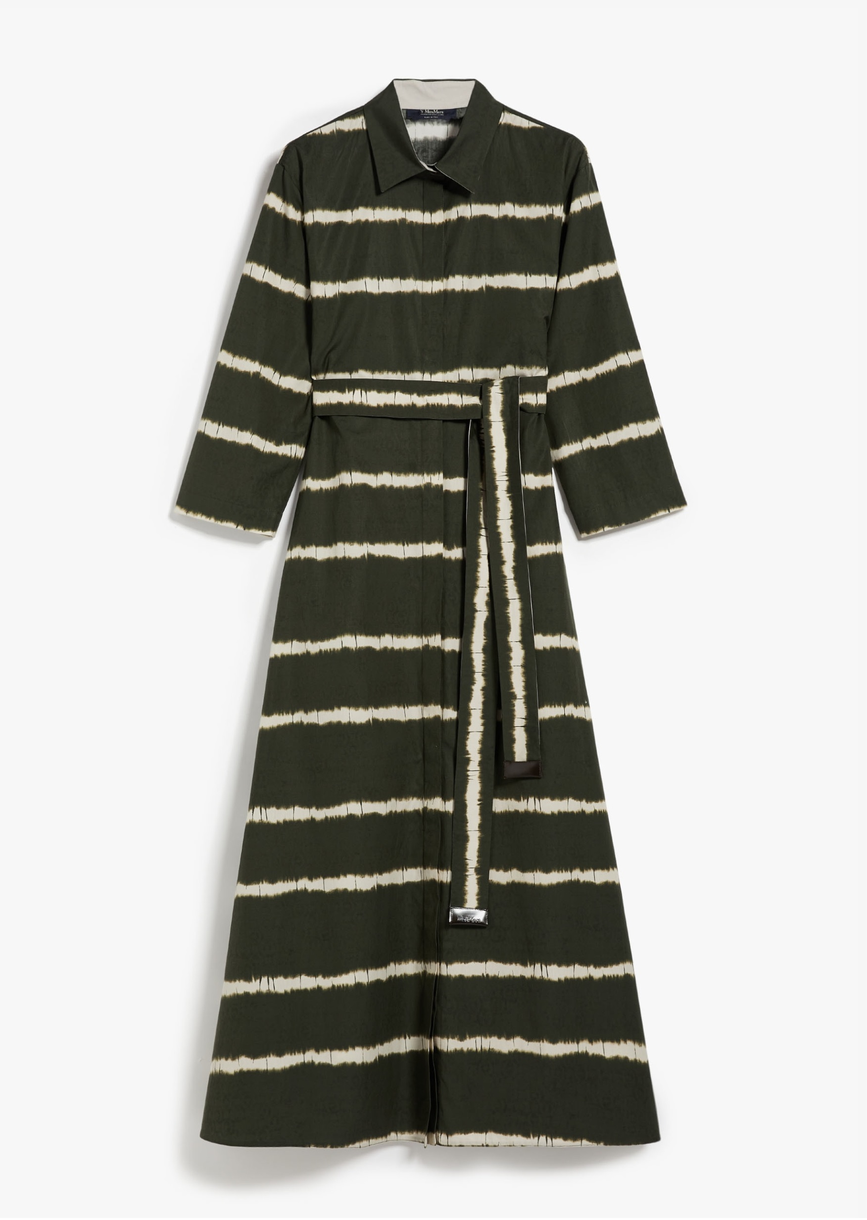 Платье-рубашка миди из поплина из чистого хлопка с вездесущим принтом тай-дай и подходящим двусторонним кожаным поясом, подчеркивающим линию талии. Фасон имеет классический рубашечный воротник, длинные рукава и вставные боковые карманы. Потайная застежка на пуговицы спереди.