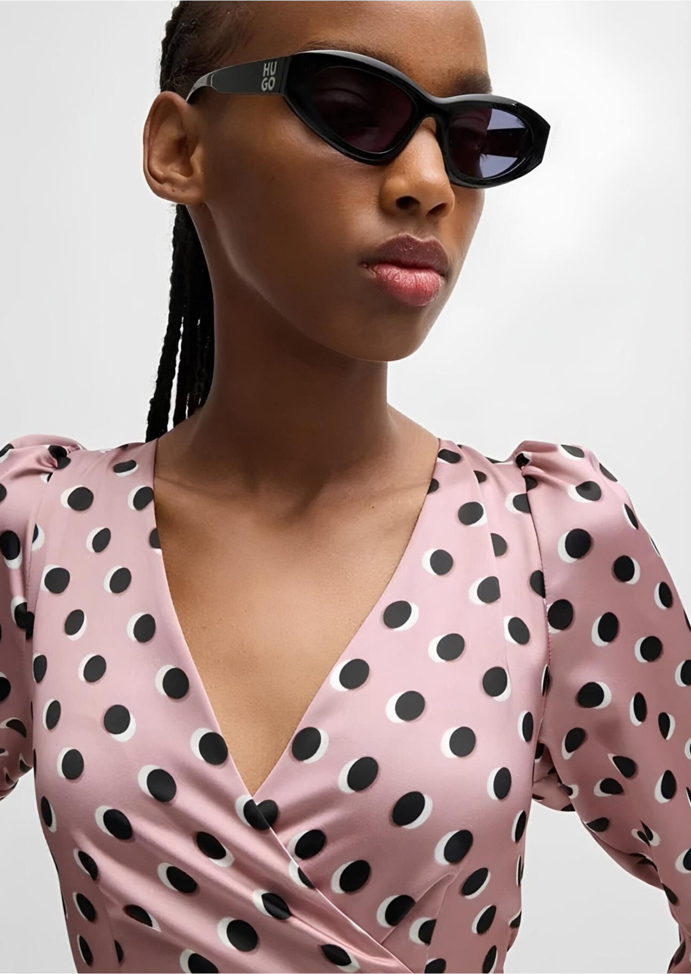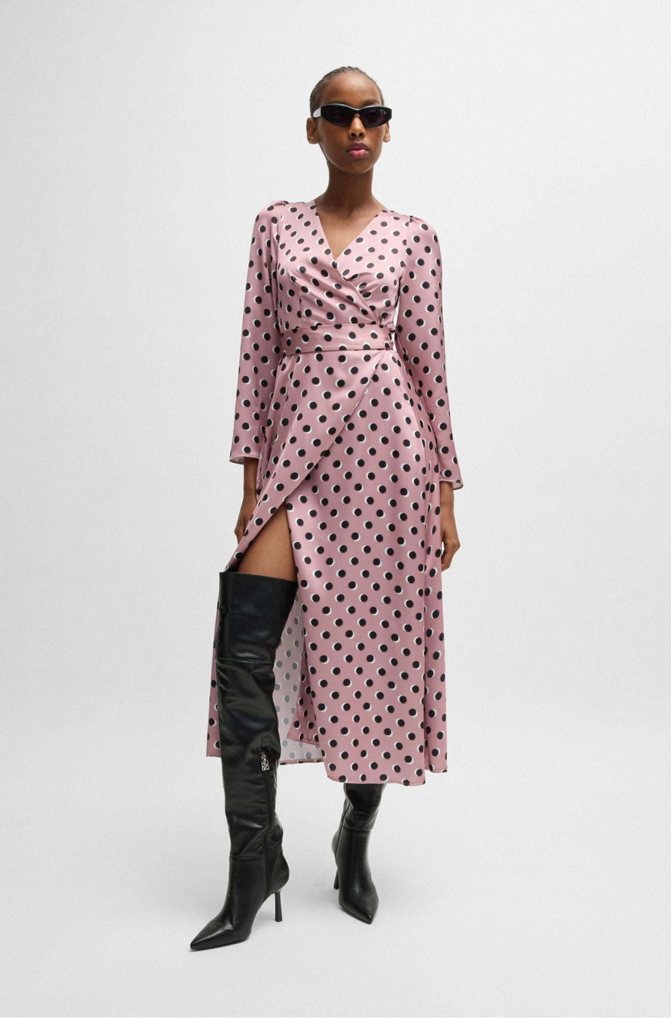 Платье-макси от HUGO - воплощение непревзойденного стиля. Модель с длиннымирукавами и V-образным вырезом. Изготовлена из атласного крепа. Платье розового цвета в черный горошек подчеркнет фигуру.