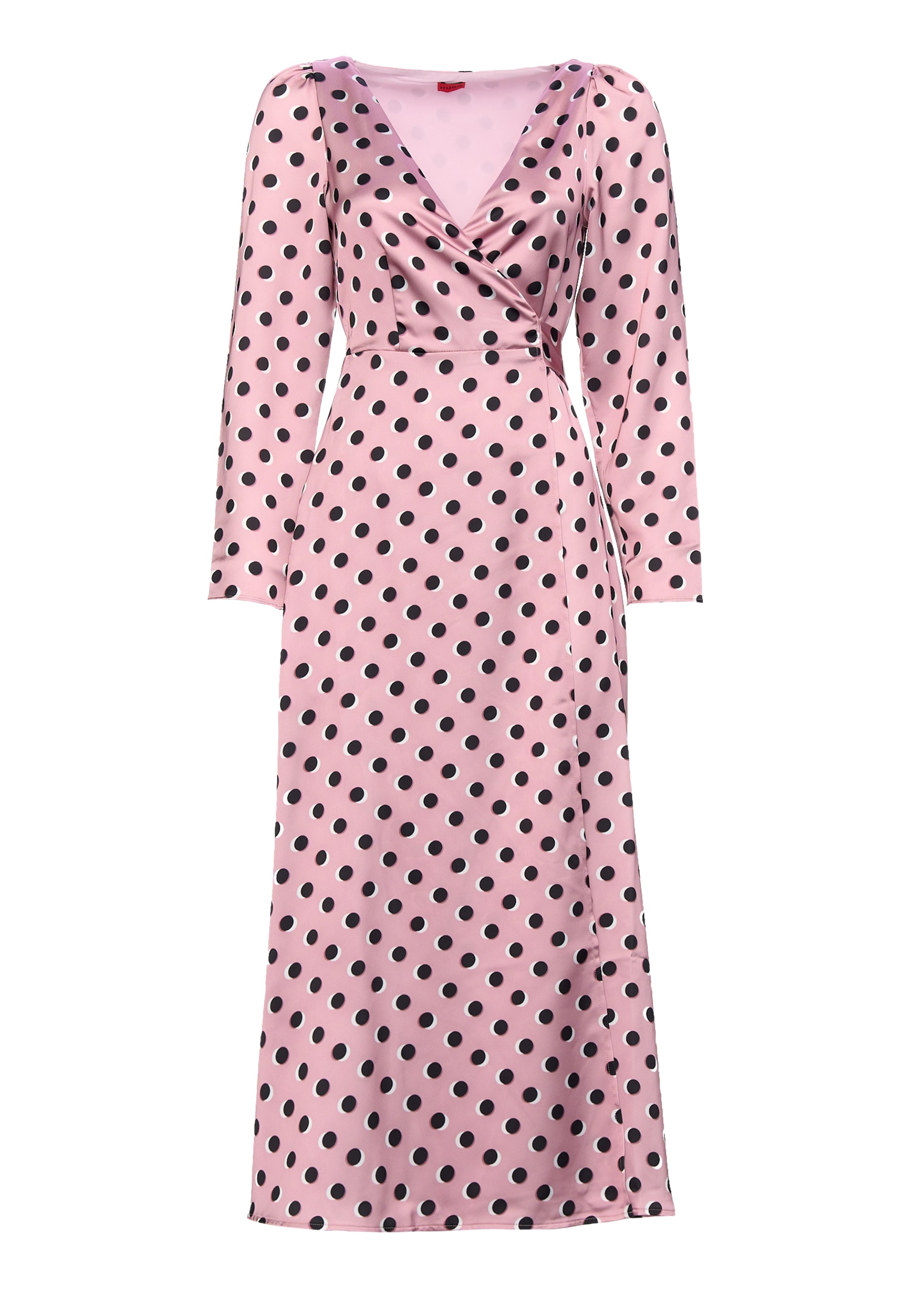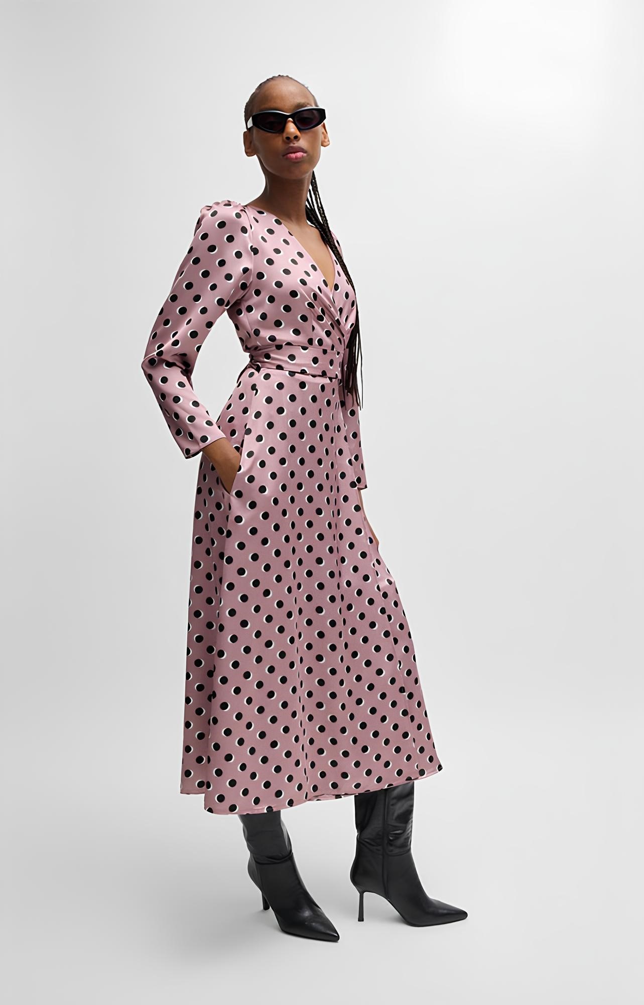 Платье-макси от HUGO - воплощение непревзойденного стиля. Модель с длиннымирукавами и V-образным вырезом. Изготовлена из атласного крепа. Платье розового цвета в черный горошек подчеркнет фигуру.