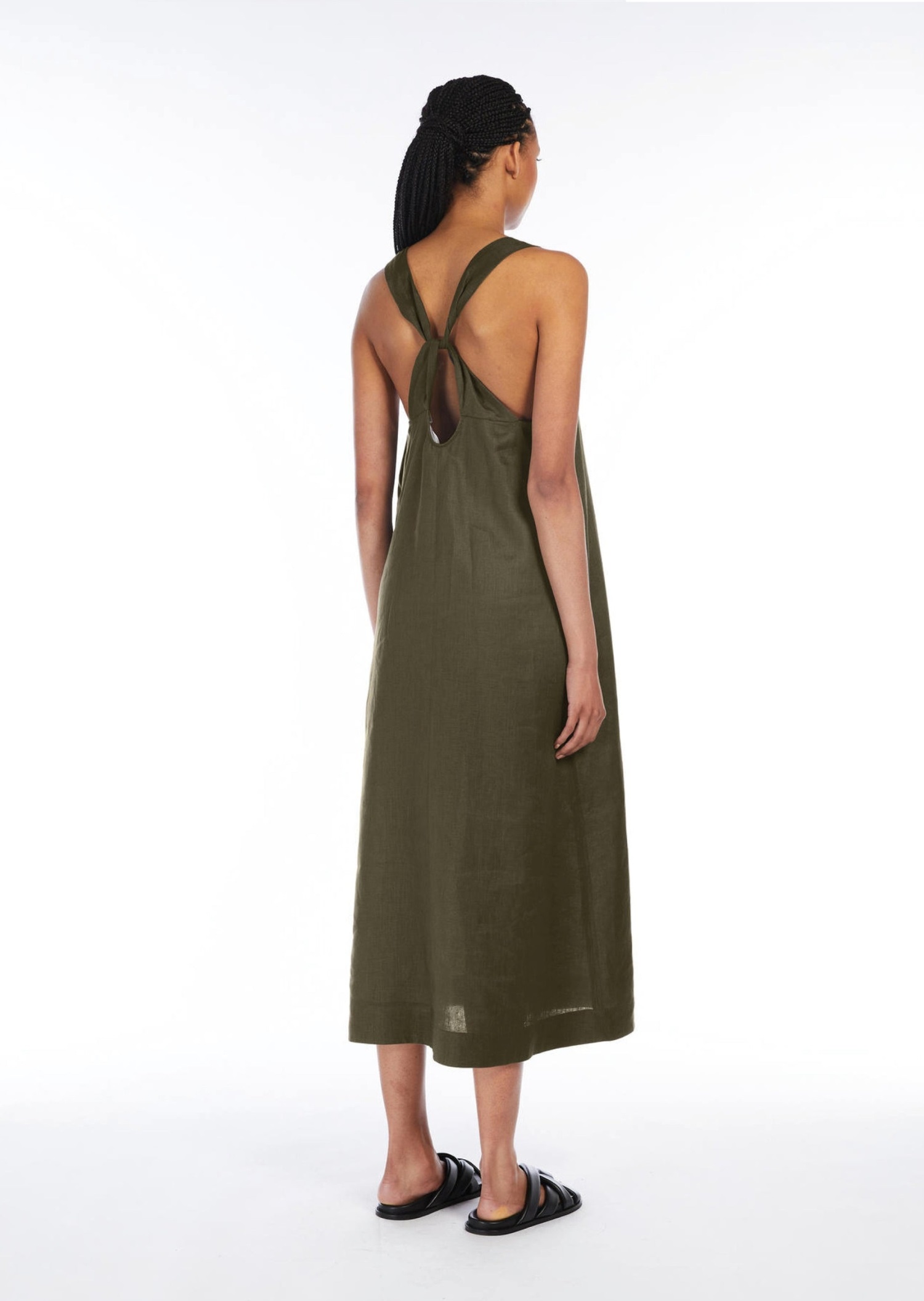 Лаконичное платье миди в насыщенном зеленом цвете, выполнено из мягкой ткани с прямым кроем. Оборудовано рубашечным воротником, застёжкой на пуговицы и длинными рукавами с манжетами. Линию талии акцентирует тонкий пояс в тон. Сочетается с минималистичной обувью — лоферами, сандалиями или мюлями, а также с базовыми аксессуарами. Подходит для создания сдержанных повседневных, деловых и вечерних образов.
