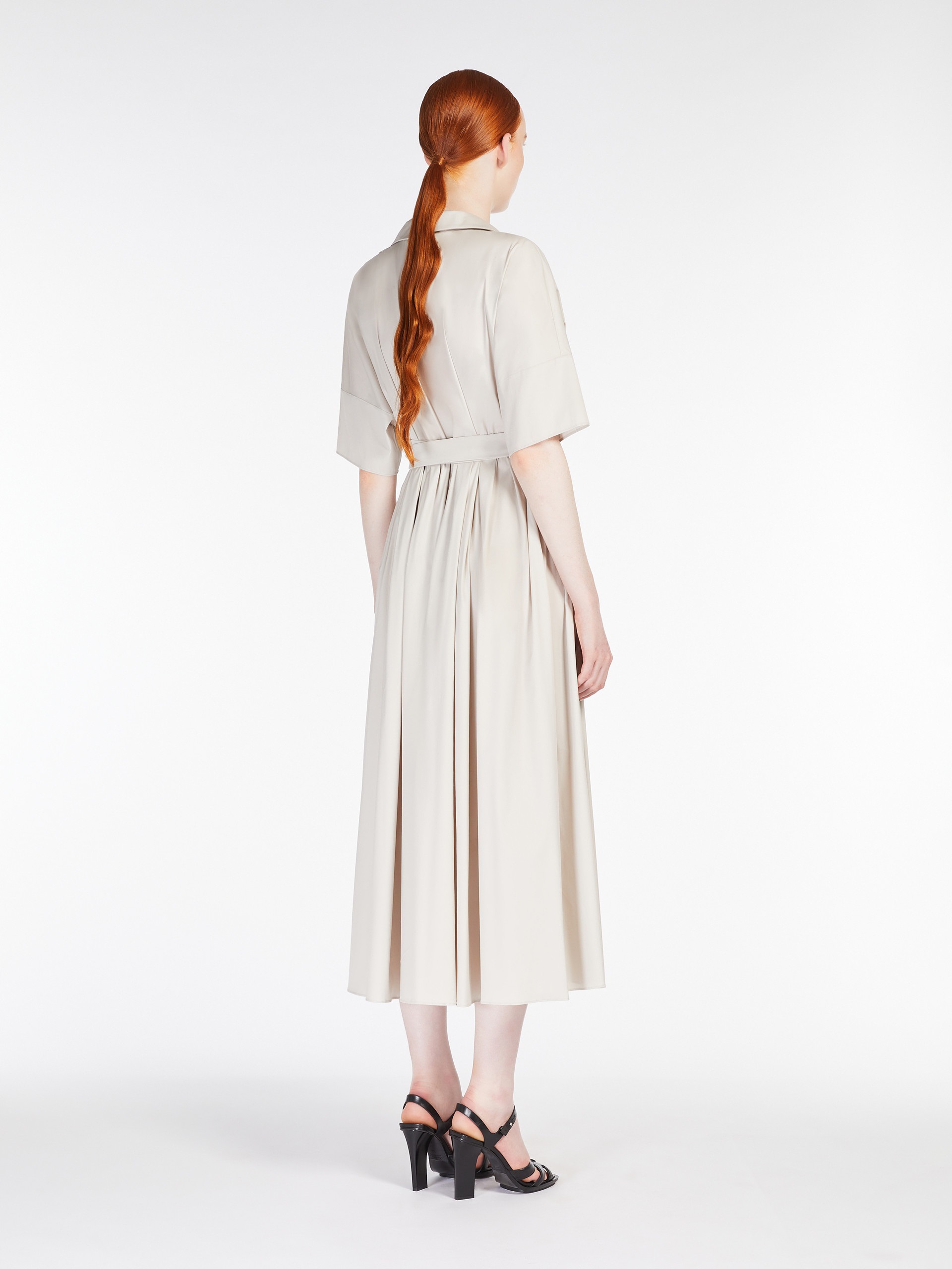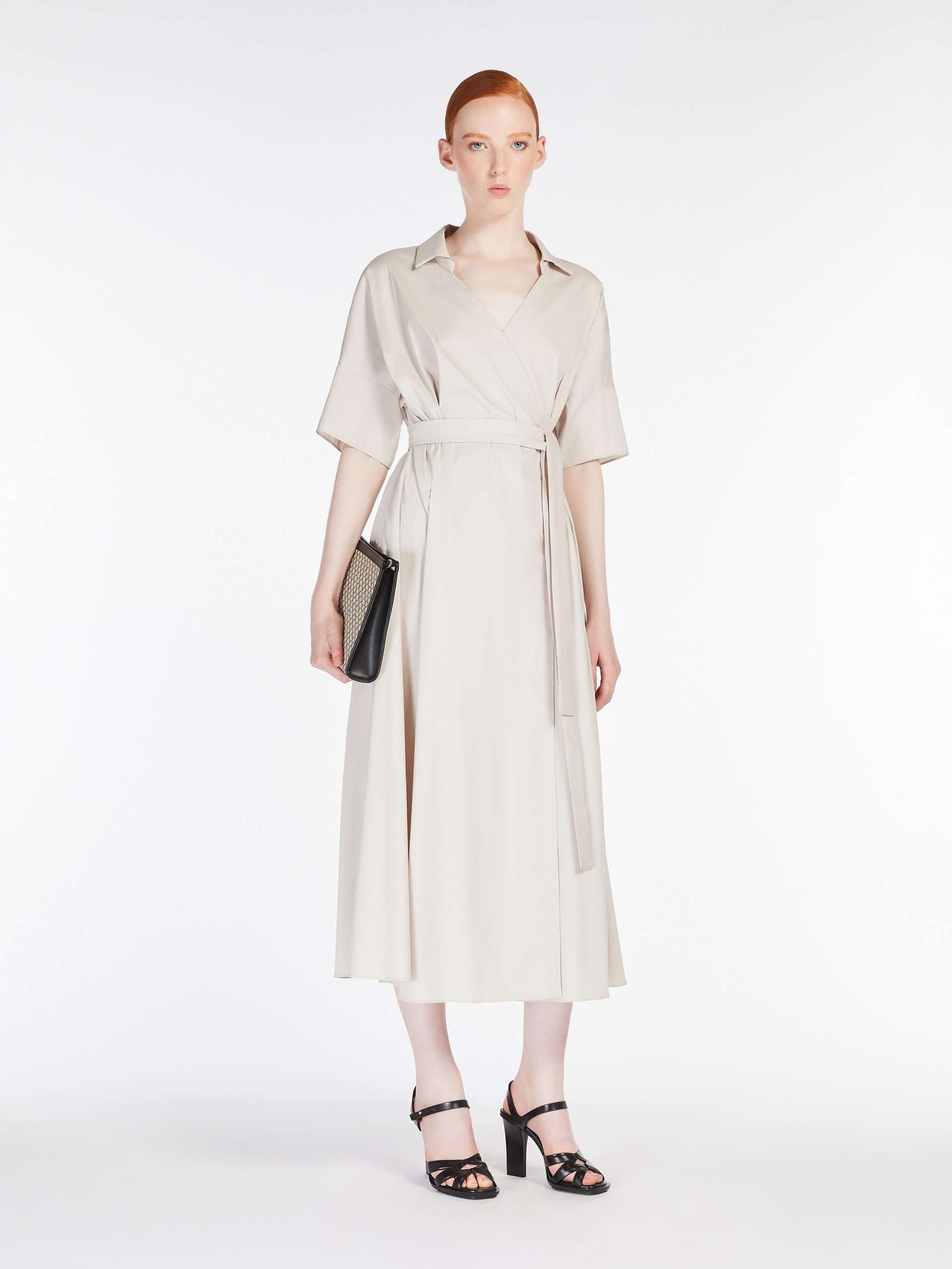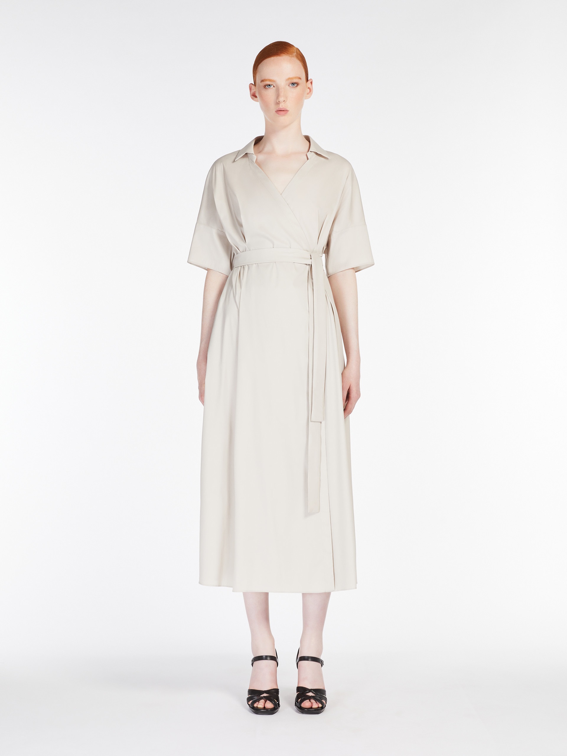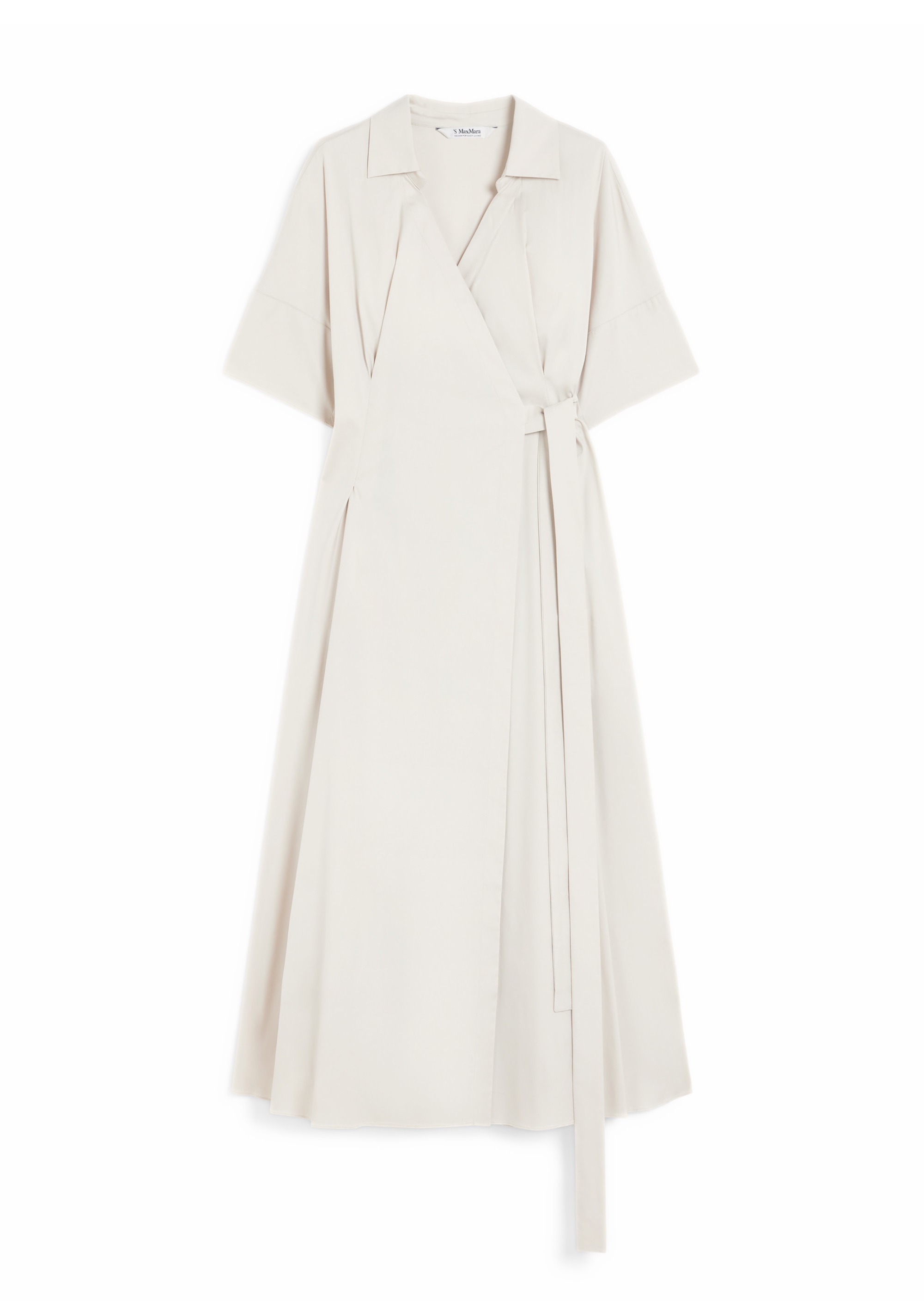 Платье Max Mara S — воплощение современного стиля и комфорта. Модель выполнена из мягкого стрейчевого хлопкового поплина, обеспечивая лёгкость и приятные ощущения при носке. Нежный бежевый цвет придаёт образу утончённость и универсальность. Дизайн платья отличается V-образным вырезом, классическим воротником и короткими рукавами кимоно с широкими манжетами. Платье имеет запах, фиксируемый поясом на талии, подчёркивая силуэт. Юбка с объёмными складками на спинке добавляет динамики и элегантности. Боковые карманы обеспечивают дополнительную функциональность. Платье легко сочетается с различной обувью и аксессуарами, позволяя создавать как повседневные, так и более формальные образы. Платье Max Mara S — идеальный выбор для тех, кто ценит сочетание комфорта, качества и утончённого стиля.