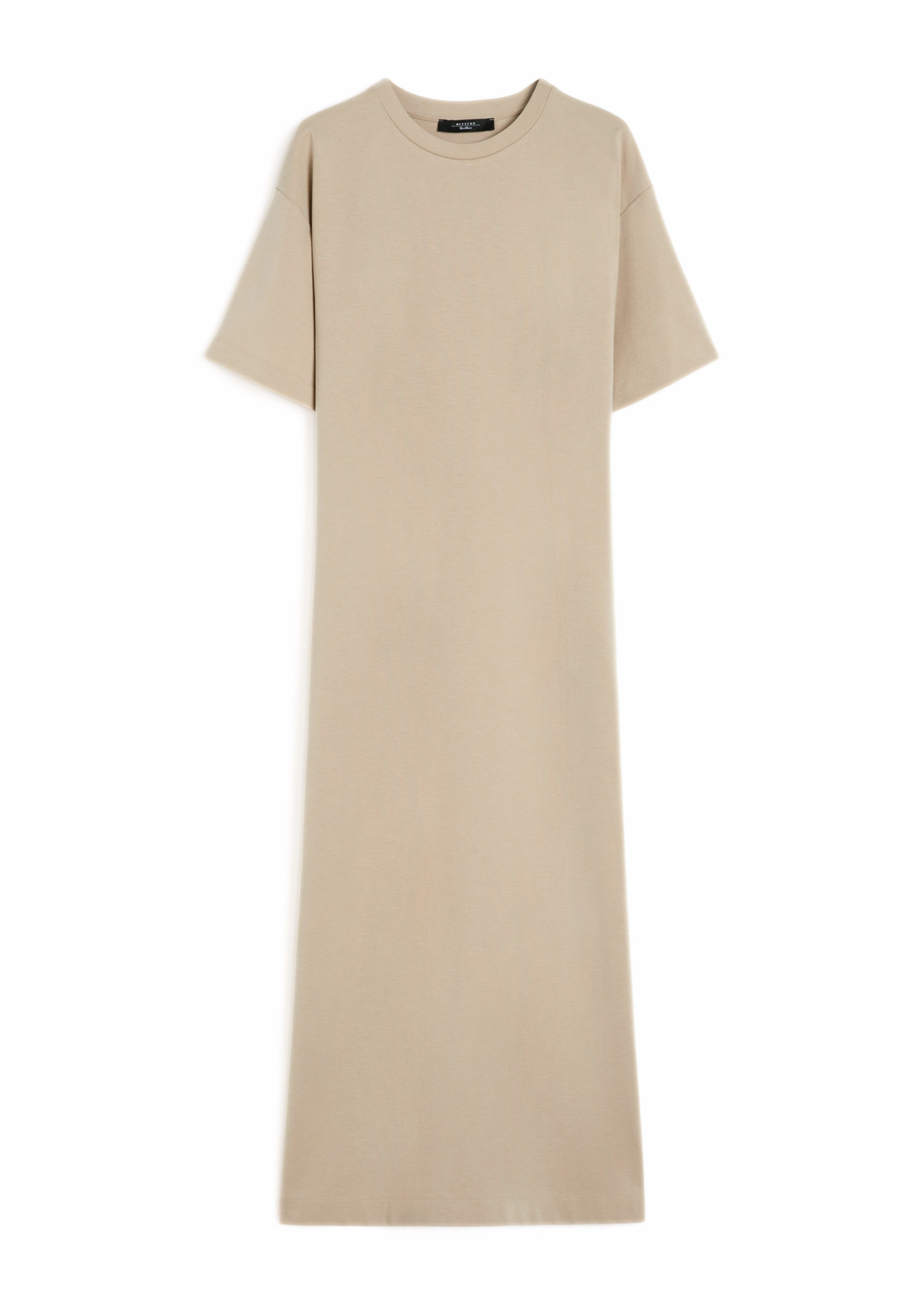 Длинное трикотажное платье Max Mara Weekend прямого силуэта из хлопково-лиоцелевого джерси в технике милано-вязки. Светло-бежевый цвет, круглый вырез и разрезы по низу создают расслабленный, но утончённый образ. Свободный крой подчёркивает комфорт и современный стиль. Сочетается с минималистичной обувью — от сандалий до кед — или поясом для акцента на талии. Незаменимое платье для повседневного гардероба и путешествий.
