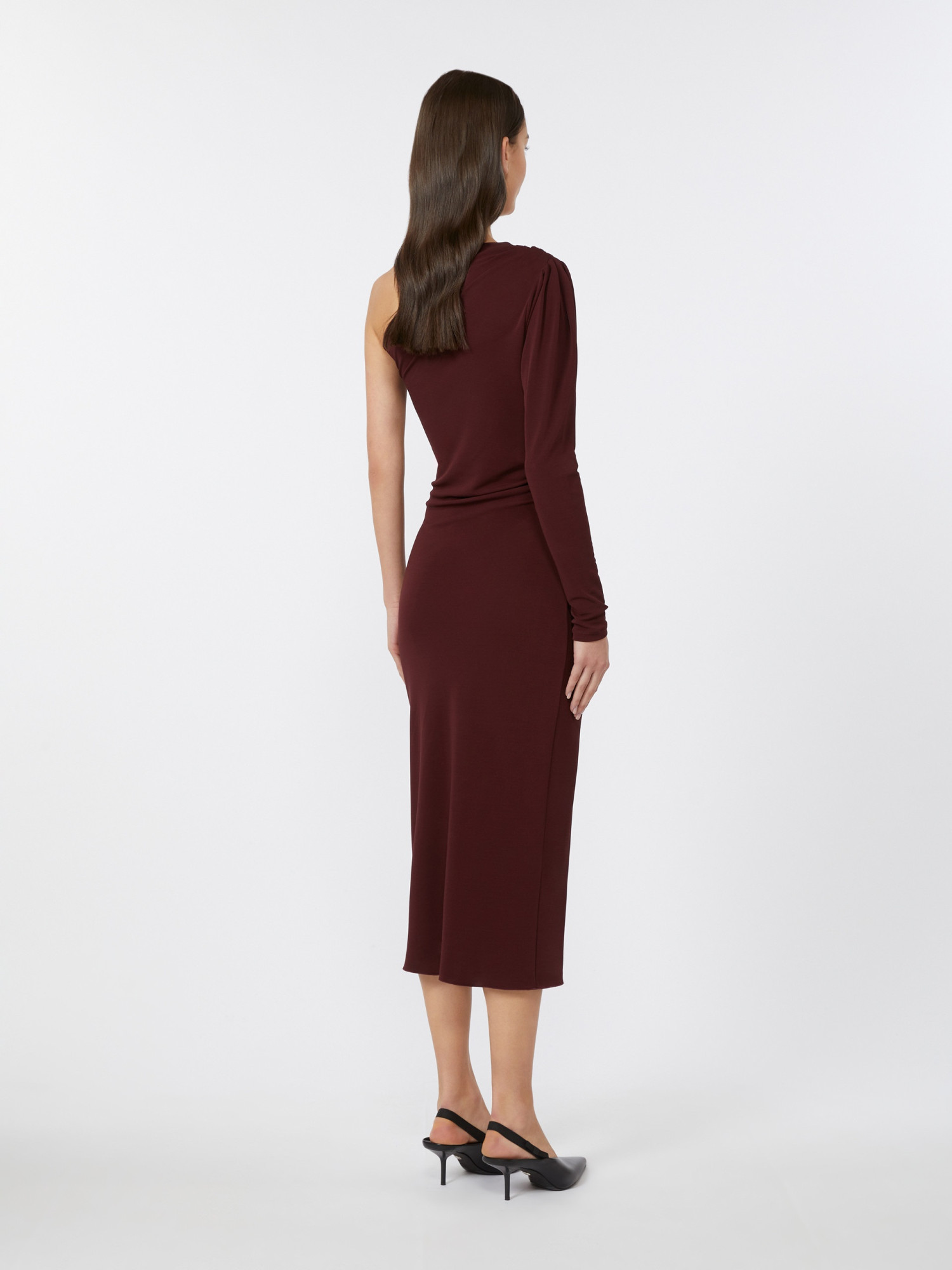 Платье миди Max Mara Studio из вискозного интерлока насыщенного бордового оттенка. Асимметричный вырез на одно плечо, драпировка и рукав‑труба подчёркивают женственный приталенный силуэт. Юбка-карандаш и мягкие складки на талии формируют элегантную и выразительную линию. Сочетается с минималистичными босоножками, клатчем и украшениями с чистой геометрией. Идеальный выбор для вечернего выхода или особого повода — мягко подчеркивает фигуру и сохраняет комфорт движения.