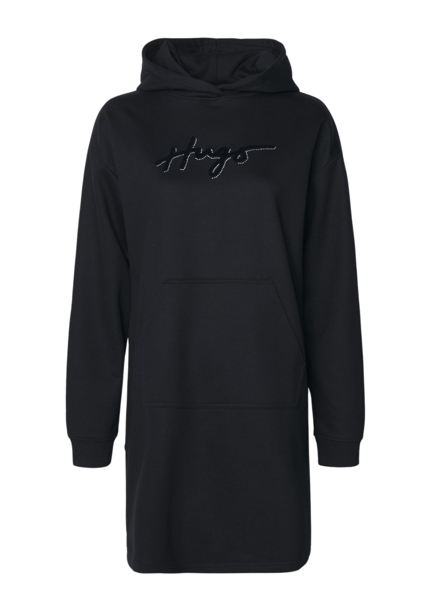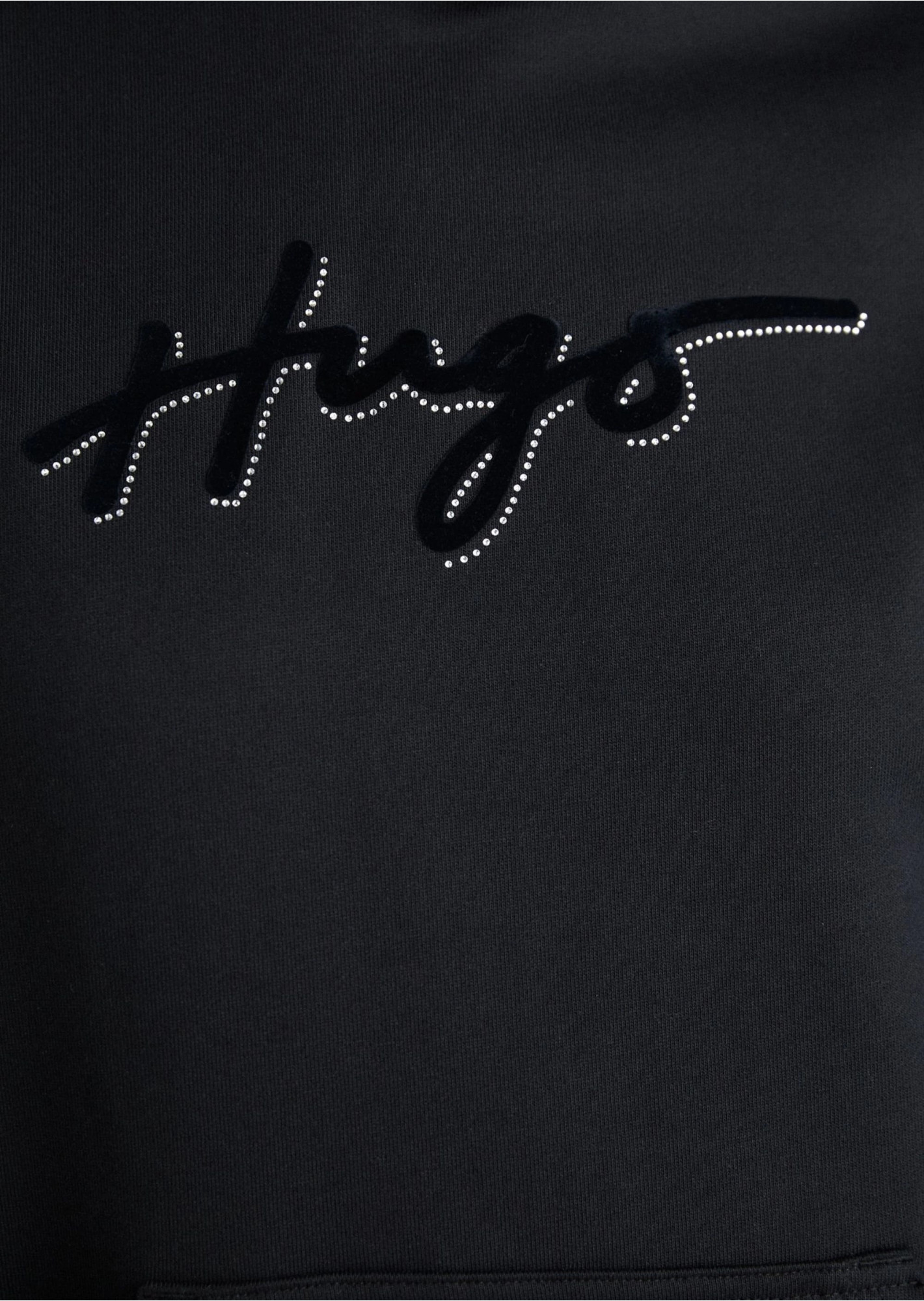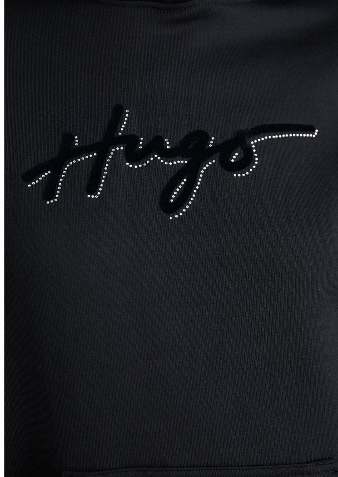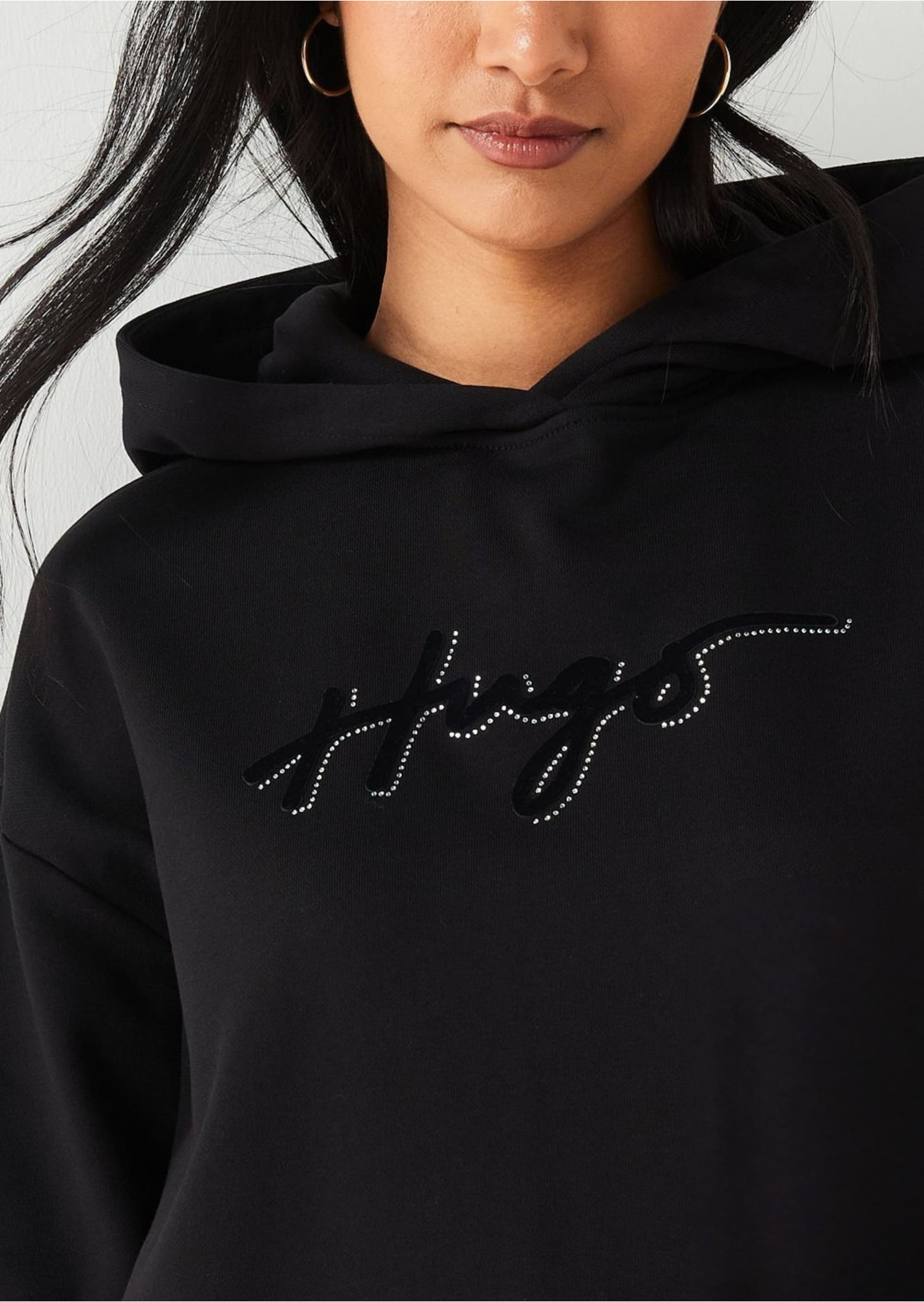 Черное мини-платье Regular fit украшено логотипом HUGO. Комфортное и стильное платье изготовлено из хлопкового джерси. Вещь имеет длинный рукав, карман-кенгуру и капюшон.