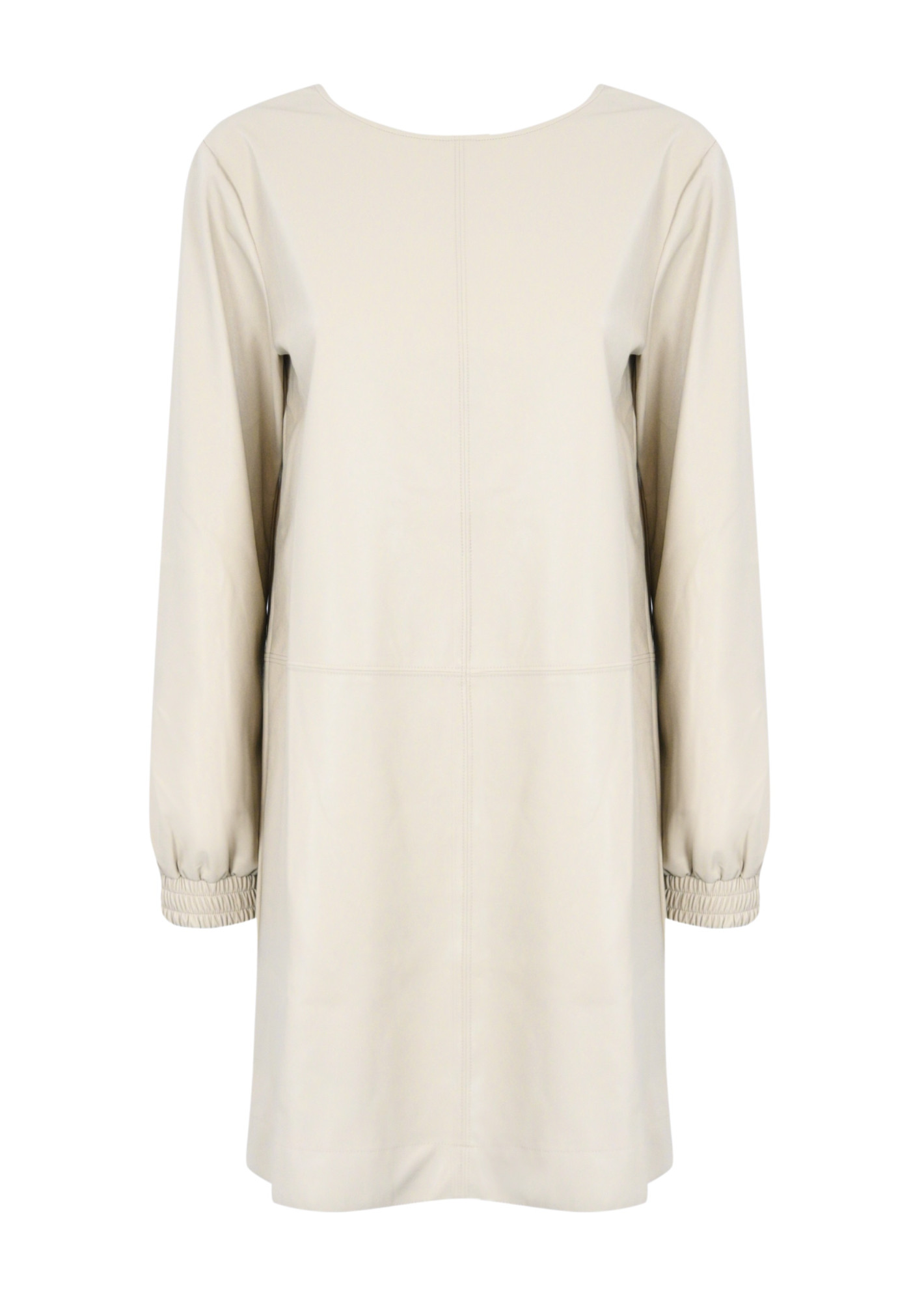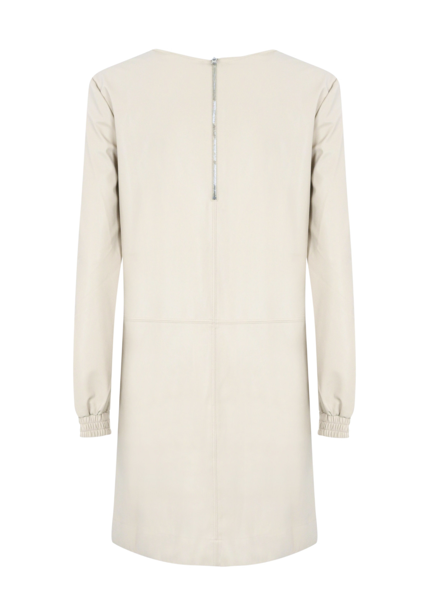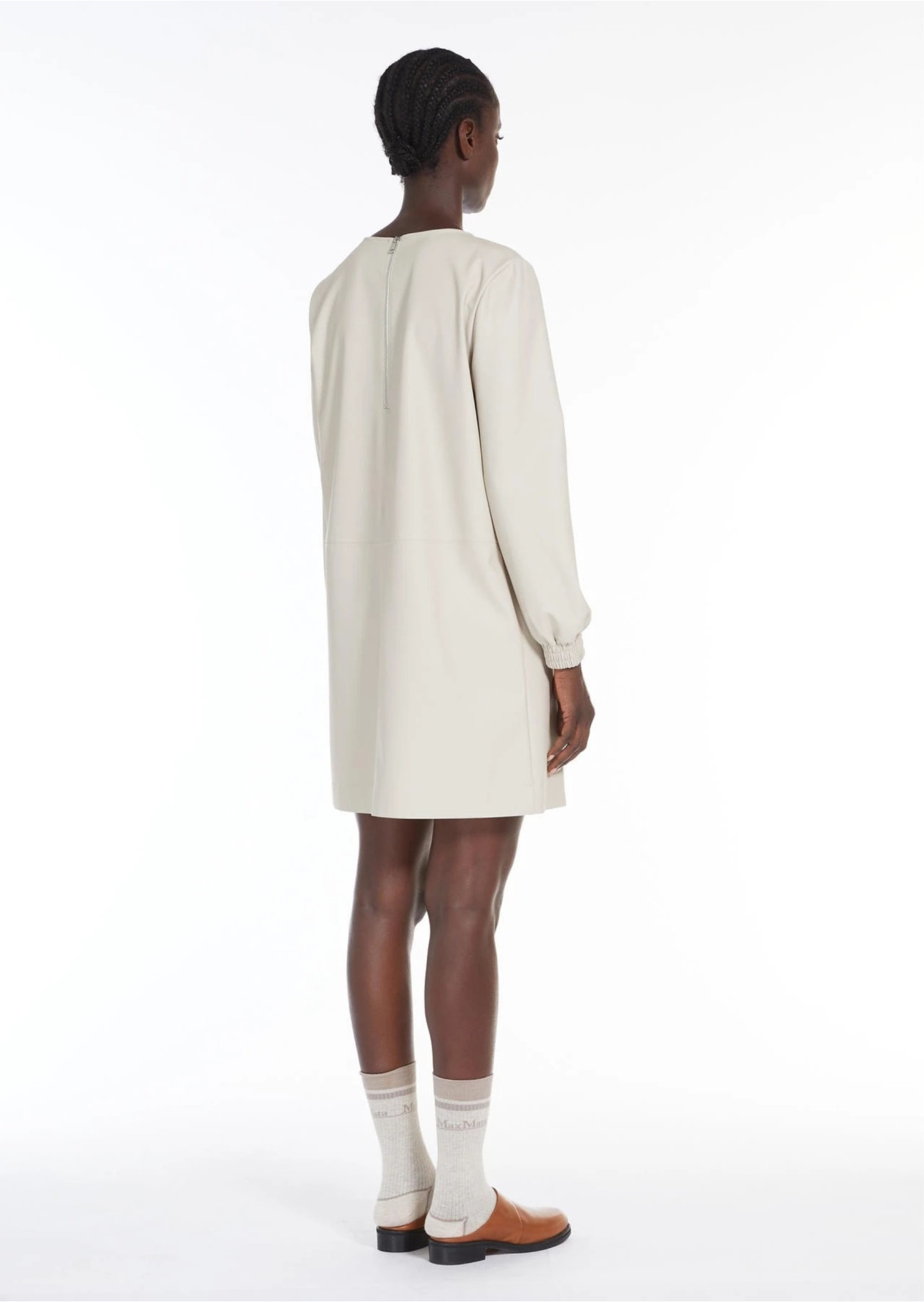 Короткое платье из трикотажа с покрытием, круглым вырезом и длинными рукавами с эластичными манжетами. Модель прямого кроя дополнена горизонтальными и вертикальными швами, которые придают силуэту структуру. Застежка-молния сзади.