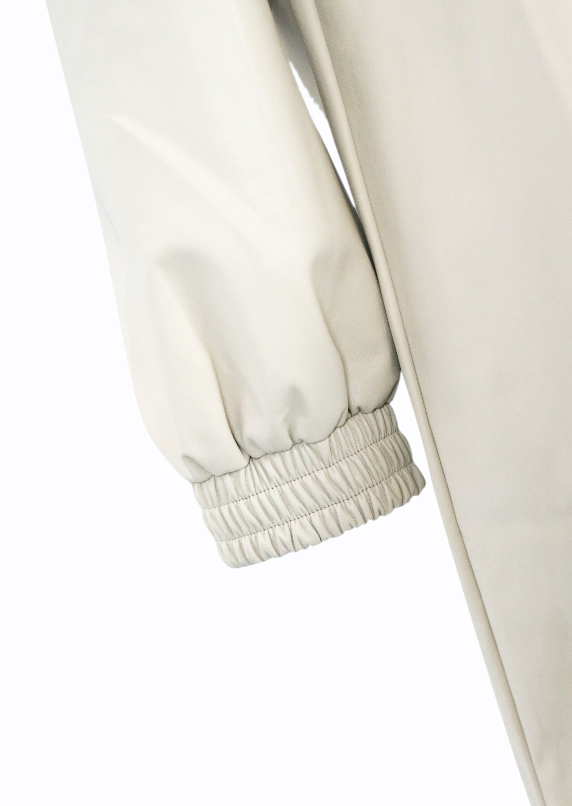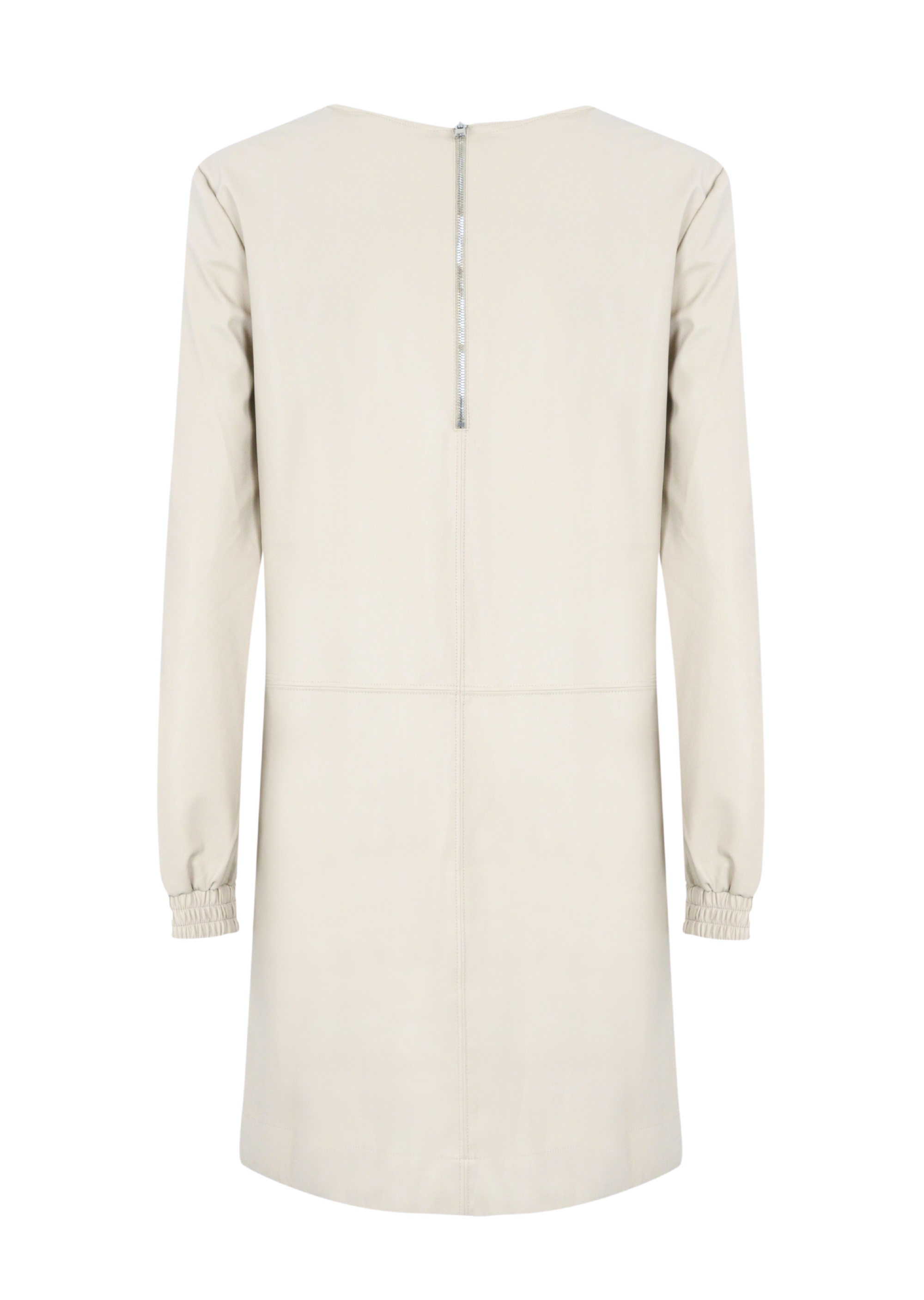 Короткое платье из трикотажа с покрытием, круглым вырезом и длинными рукавами с эластичными манжетами. Модель прямого кроя дополнена горизонтальными и вертикальными швами, которые придают силуэту структуру. Застежка-молния сзади.