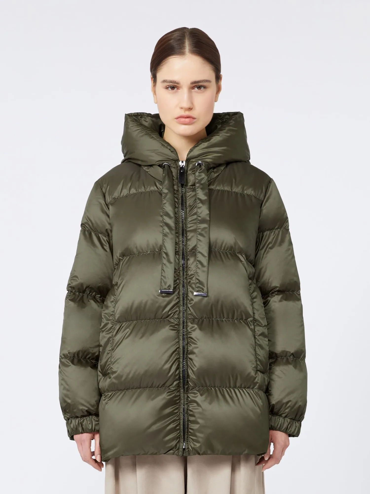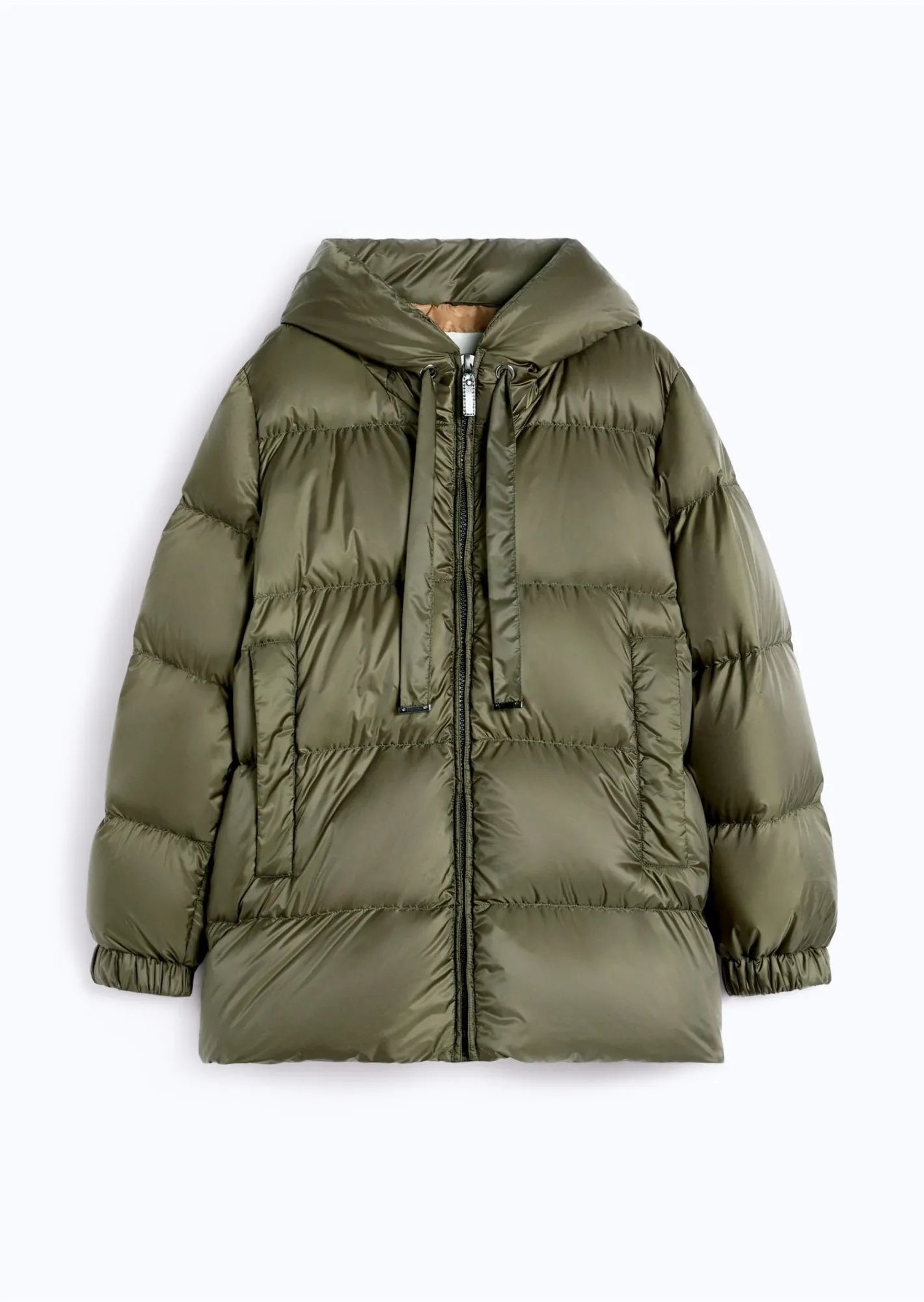 Пуховик Max Mara Cube в насыщенном зелёном оттенке. Изготовлен из гладкого полиэстера с лёгким матовым блеском и утеплён для надёжной защиты от холода. Прямой силуэт, капюшон в тон с кулиской, застёжка на молнию, боковые карманы и эластичные манжеты обеспечивают комфорт и свободу движений. Лаконичный дизайн дополнен фирменной нашивкой на рукаве. Отлично сочетается с тёплыми брюками, спортивным трикотажем, водолазками и обувью на рельефной подошве. Идеальный вариант для холодного сезона — функциональный, стильный и выразительный.