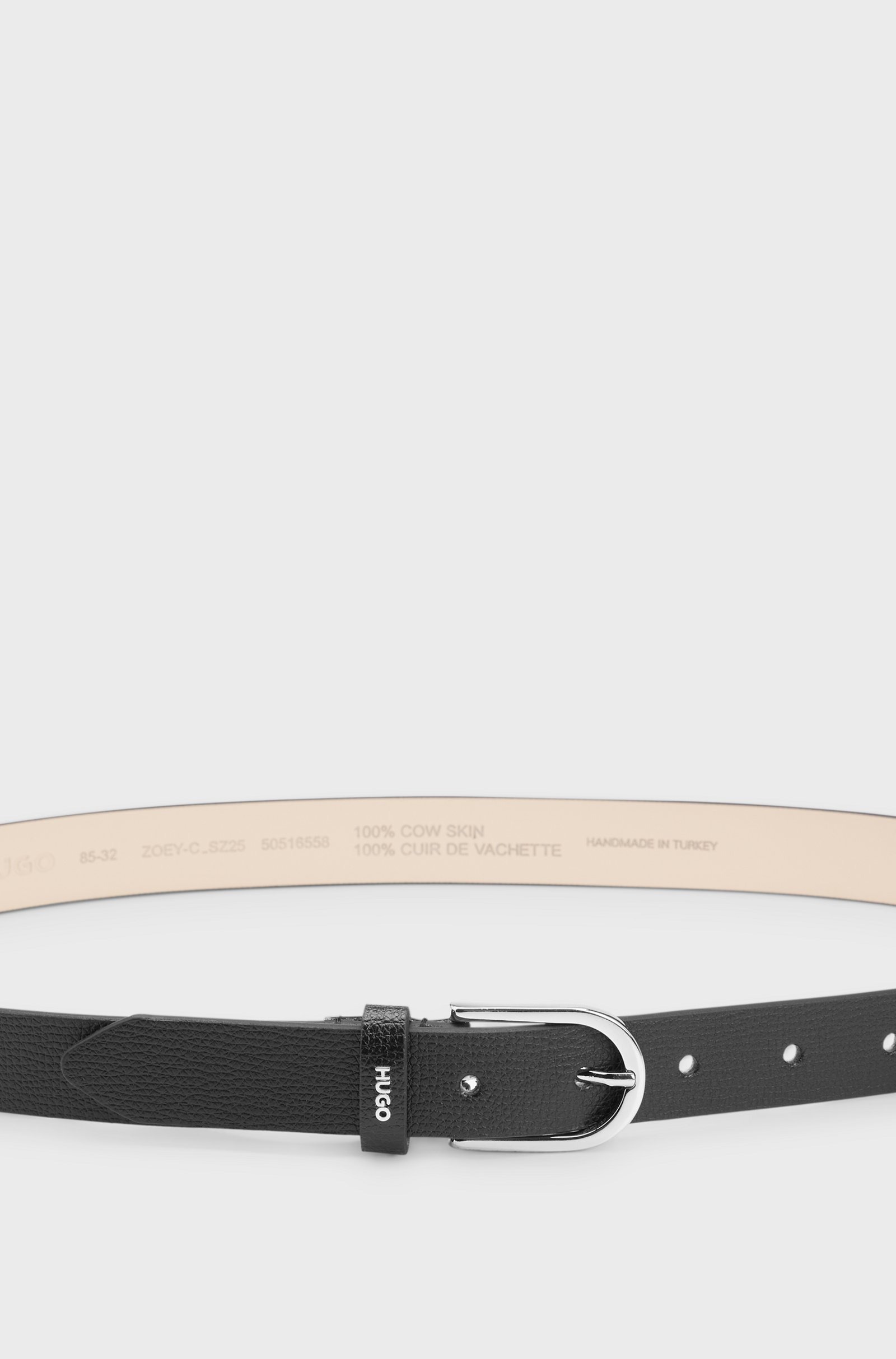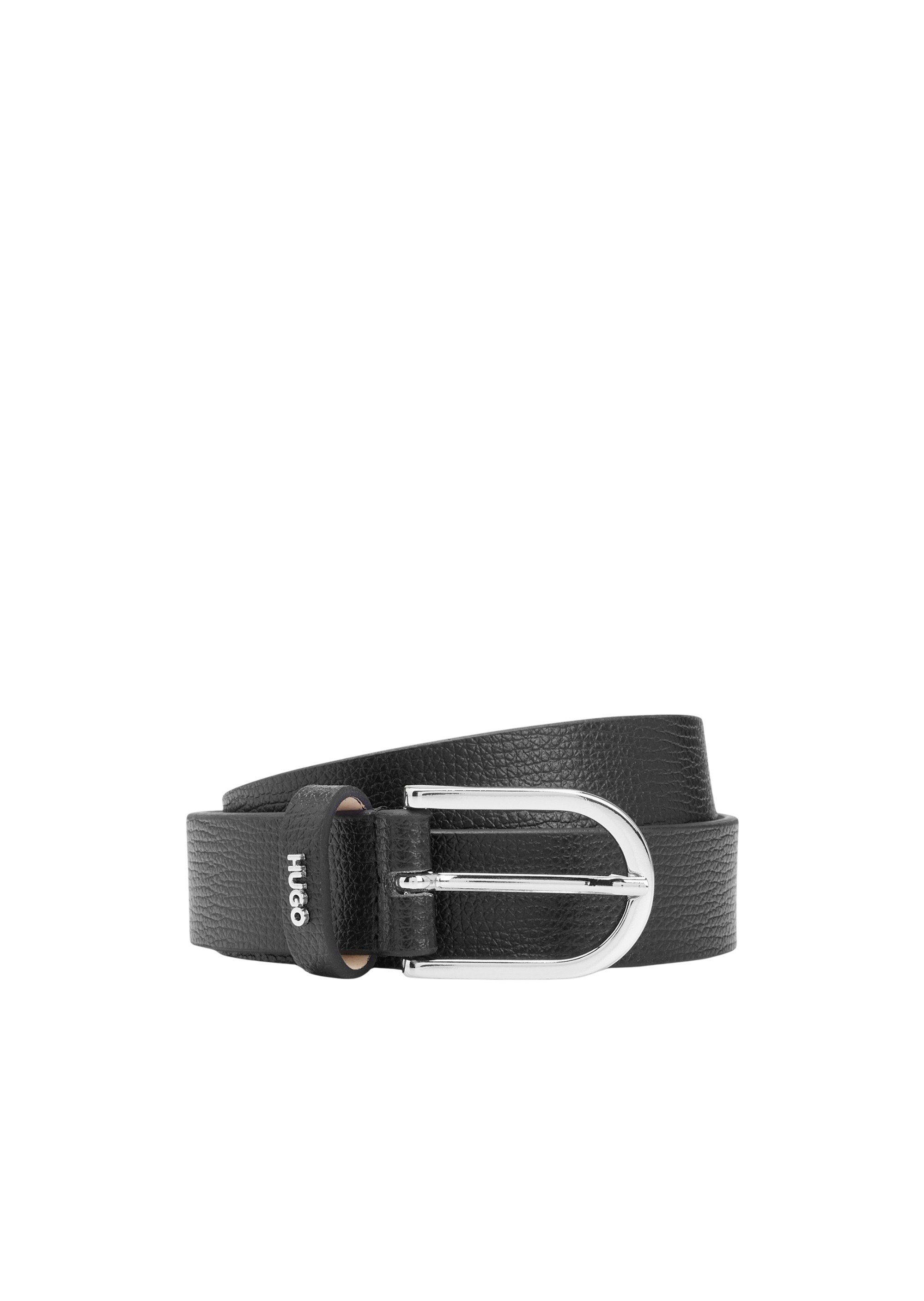 Ремень HUGO чёрного цвета выполнен из зернистой итальянской кожи, обеспечивая прочность и утончённую текстуру. Узкая форма шириной 2,5 см создаёт элегантный силуэт и сочетается с платьями и брюками. Сдержанная металлическая фурнитура и металлическая застёжка‑пряжка с отполированными логотипными буквами придают аксессуару фирменный акцент. Ремень легко адаптируется к деловым и повседневным образам, добавляя структуру и стиль. Ремень HUGO становится продуманным аксессуаром гардероба, объединяя минимализм и премиальную элегантность.