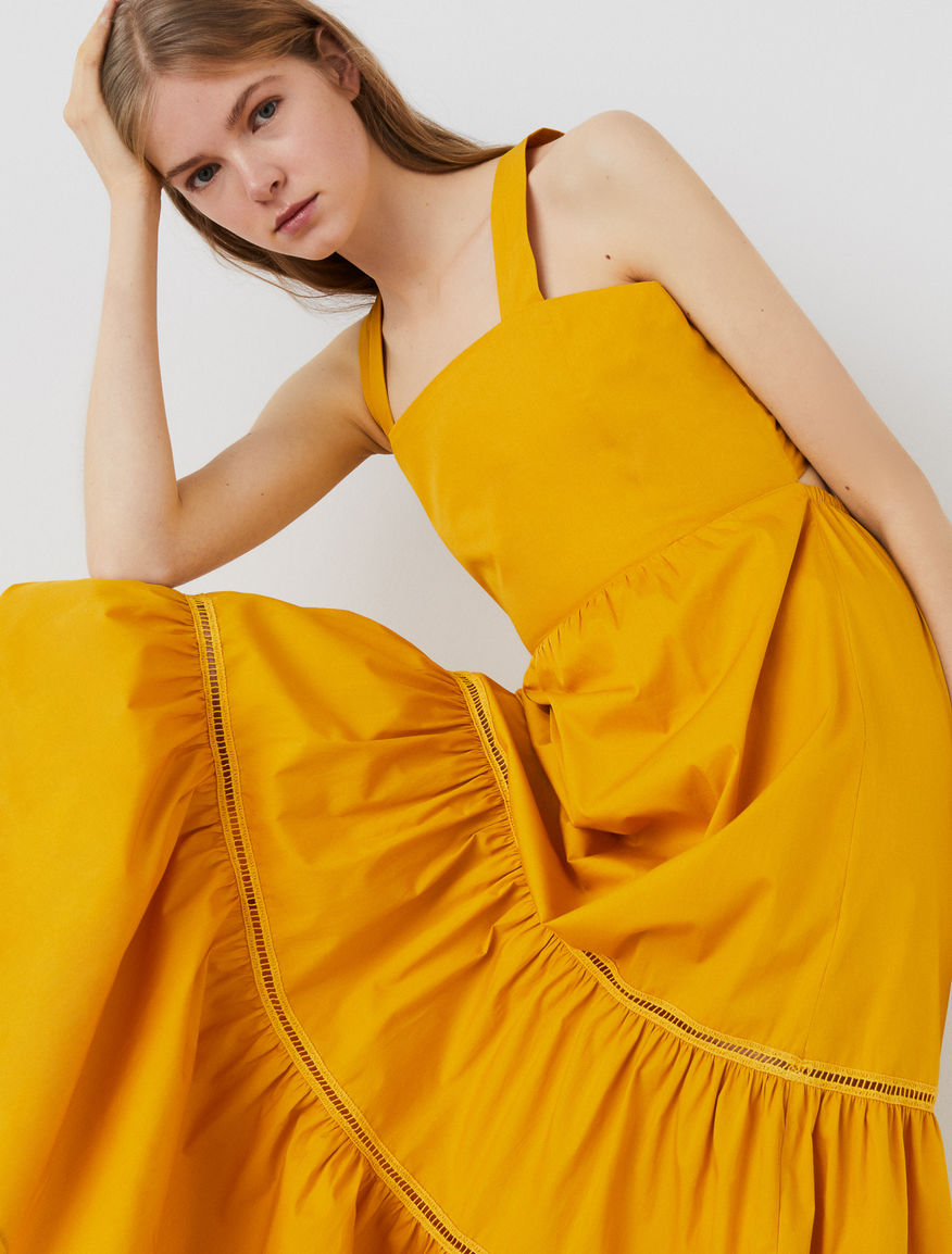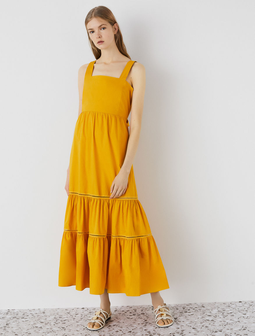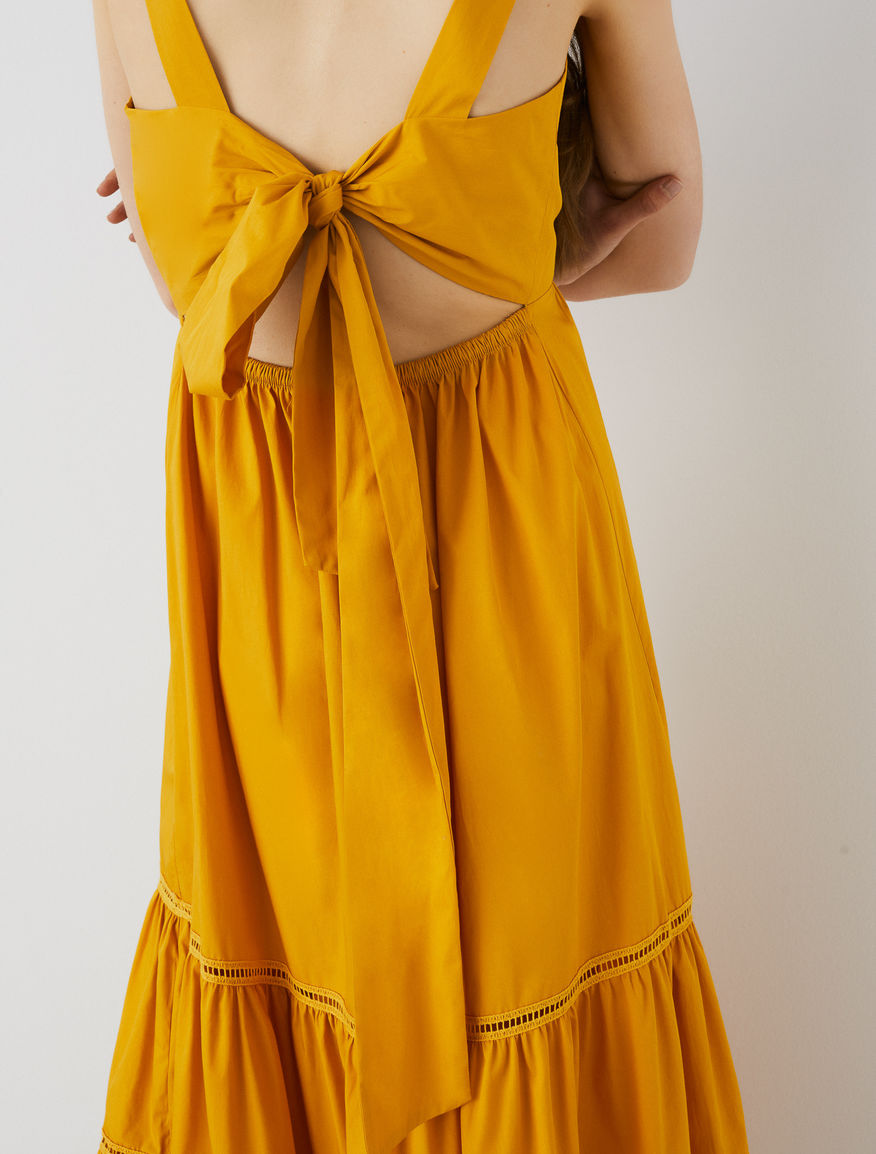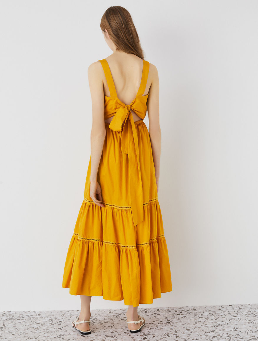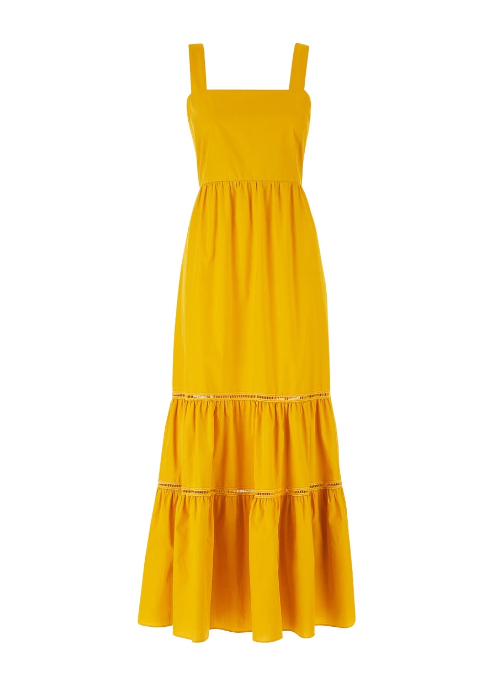 Сарафан, длины макси, от бренда Marella изготовлен из хлопкового поплина желтого цвета. Модель клеш, имеет оборки на подоле, кадратный вырез спереди. Сзади глубокий вырез с бантом.