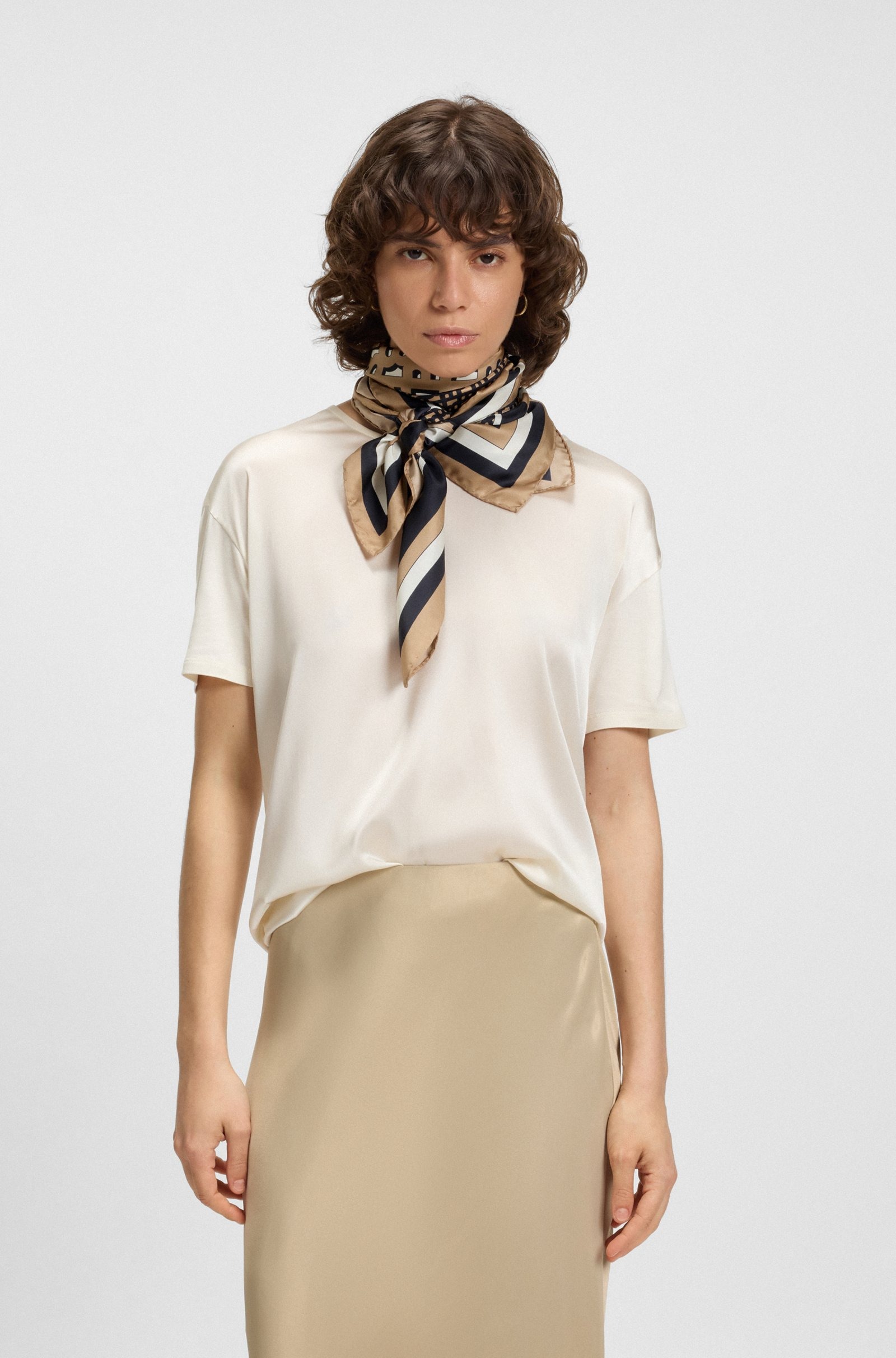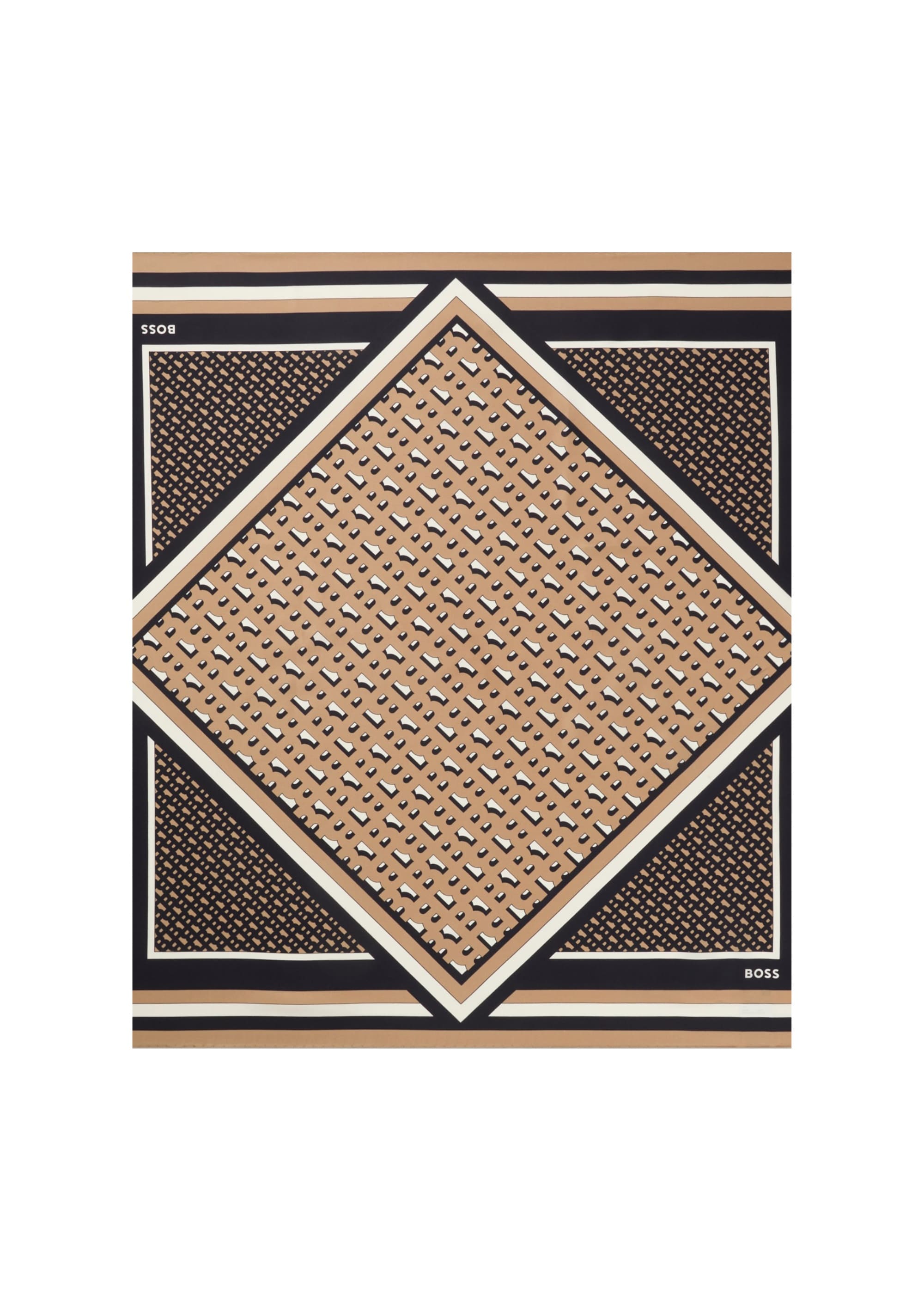 Шарф BOSS в бежевом оттенке с принтом изготовлен из мягкого шёлкового твилла, создающего изысканную текстуру и лёгкий драпированный силуэт. Аксессуар вручную выполнен в Италии и украшен фирменным логотипом, подчёркивая внимание к деталям. Размер 90 × 90 см позволяет использовать его несколькими способами — от классического накидывания до сложных узлов. Универсальный оттенок легко сочетается с пальто или жакетом BOSS, создавая элегантный акцент. Шарф завершает образ, привнося мягкий роскошный финиш и художественную выразительность.