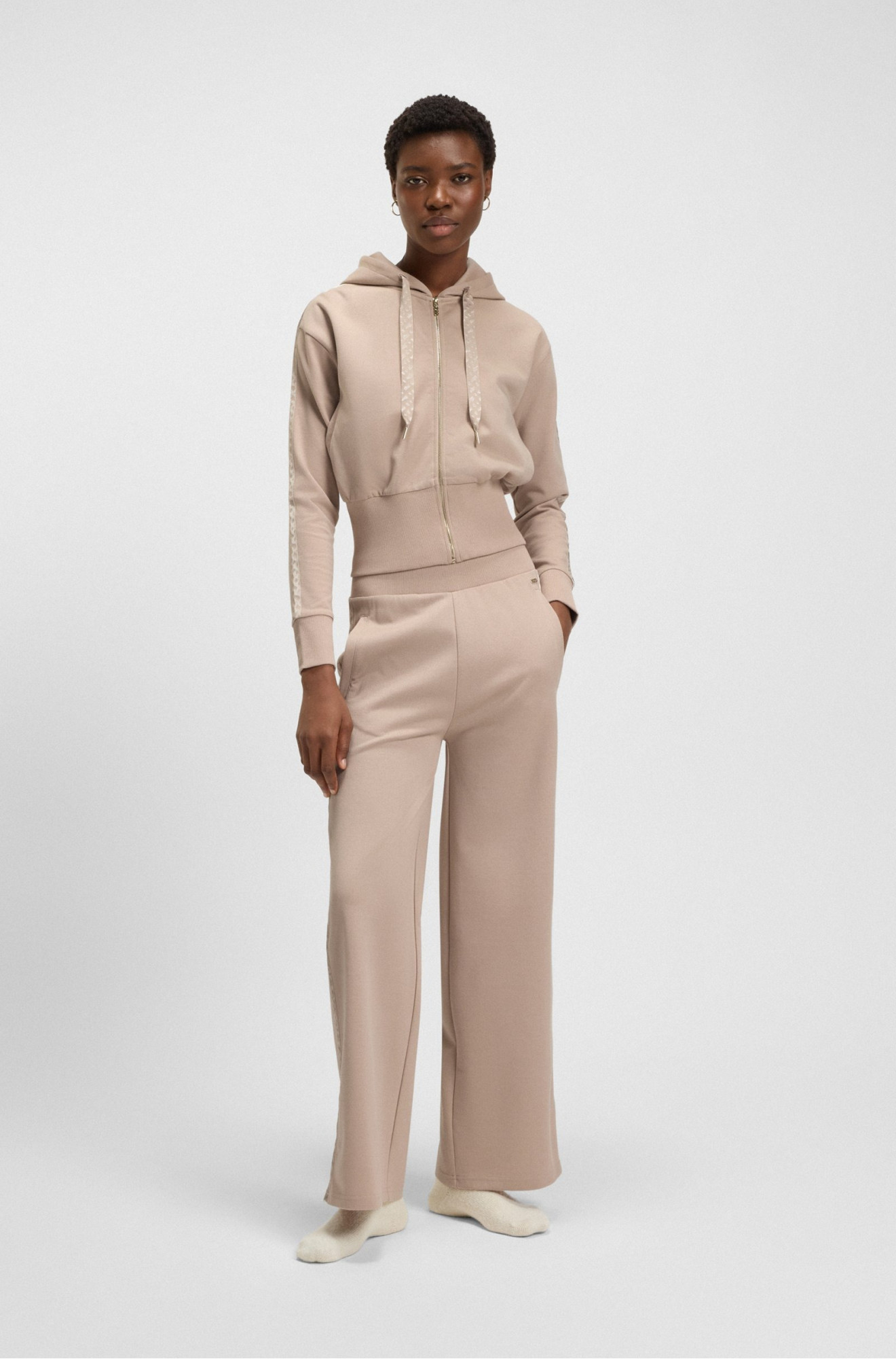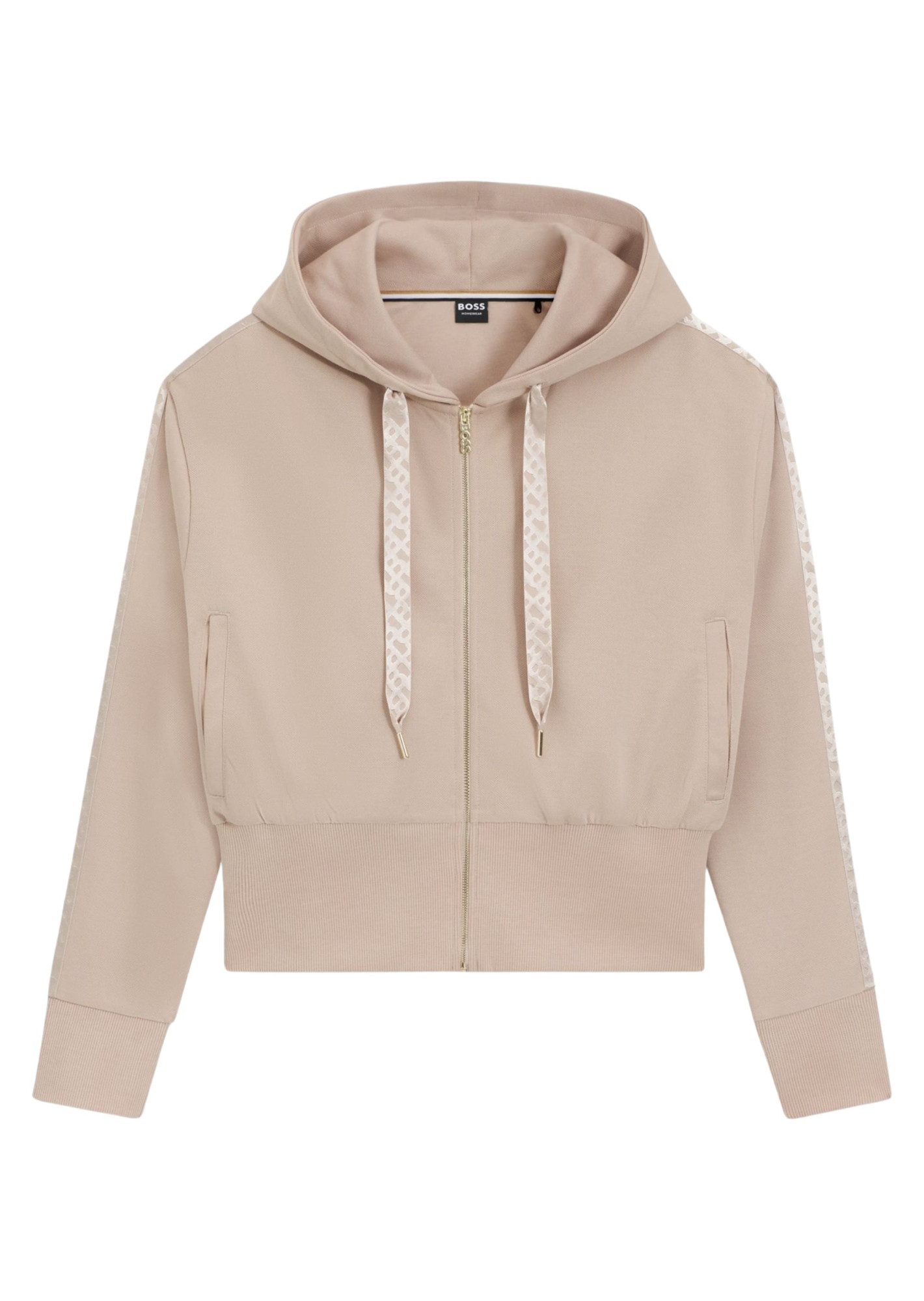 Худи‑толстовка BOSS в светло‑бежевом оттенке выполнена из структурного трикотажа пике с добавлением хлопка для мягкости. Прямой силуэт и капюшон создают расслабленный, но стильный образ. Стильная полоска с логотипом (monogram tape) вдоль борта добавляет брендовый акцент. Удобные карманы‑кенгуру обеспечивают функциональность будничного образа. Эта толстовка станет уютным завершающим штрихом твоего домашнего или повседневного гардероба.