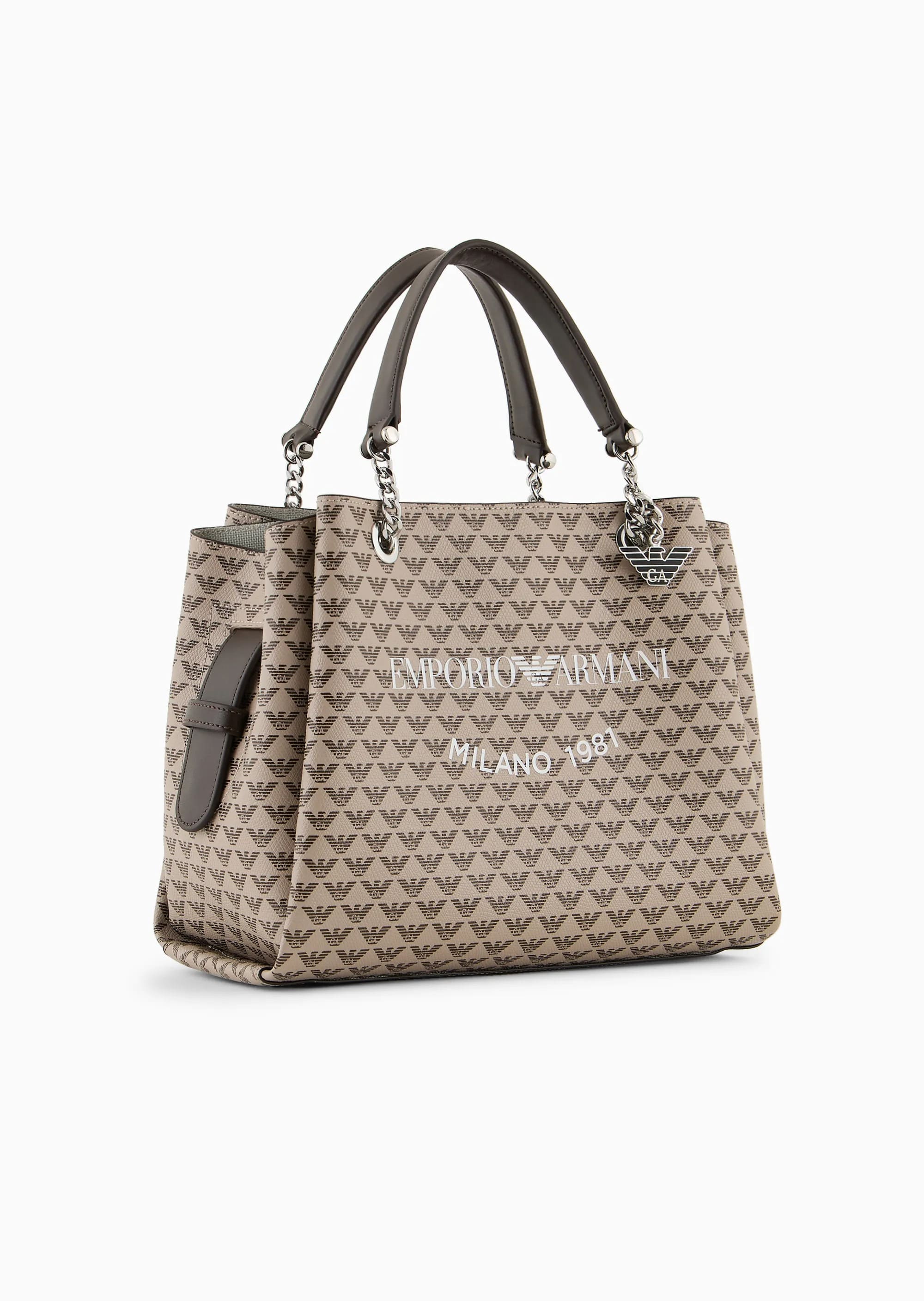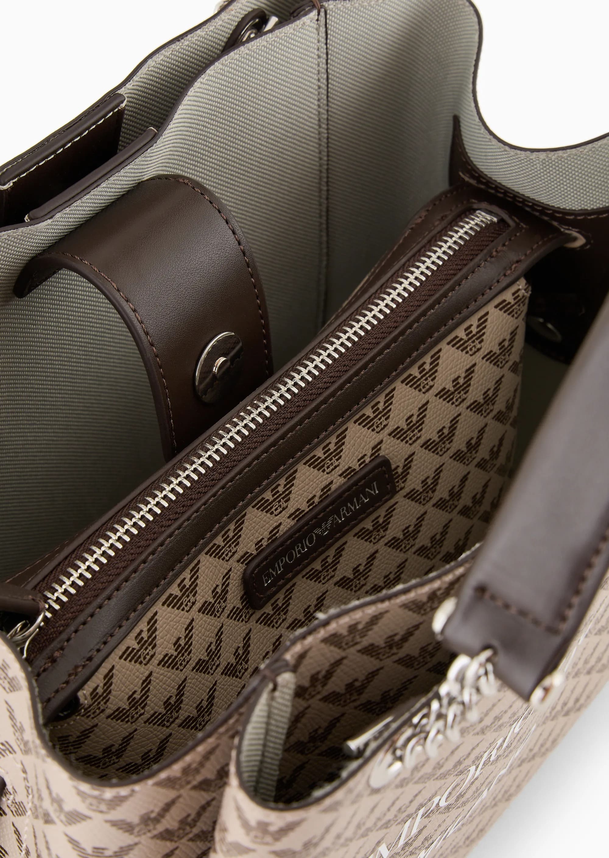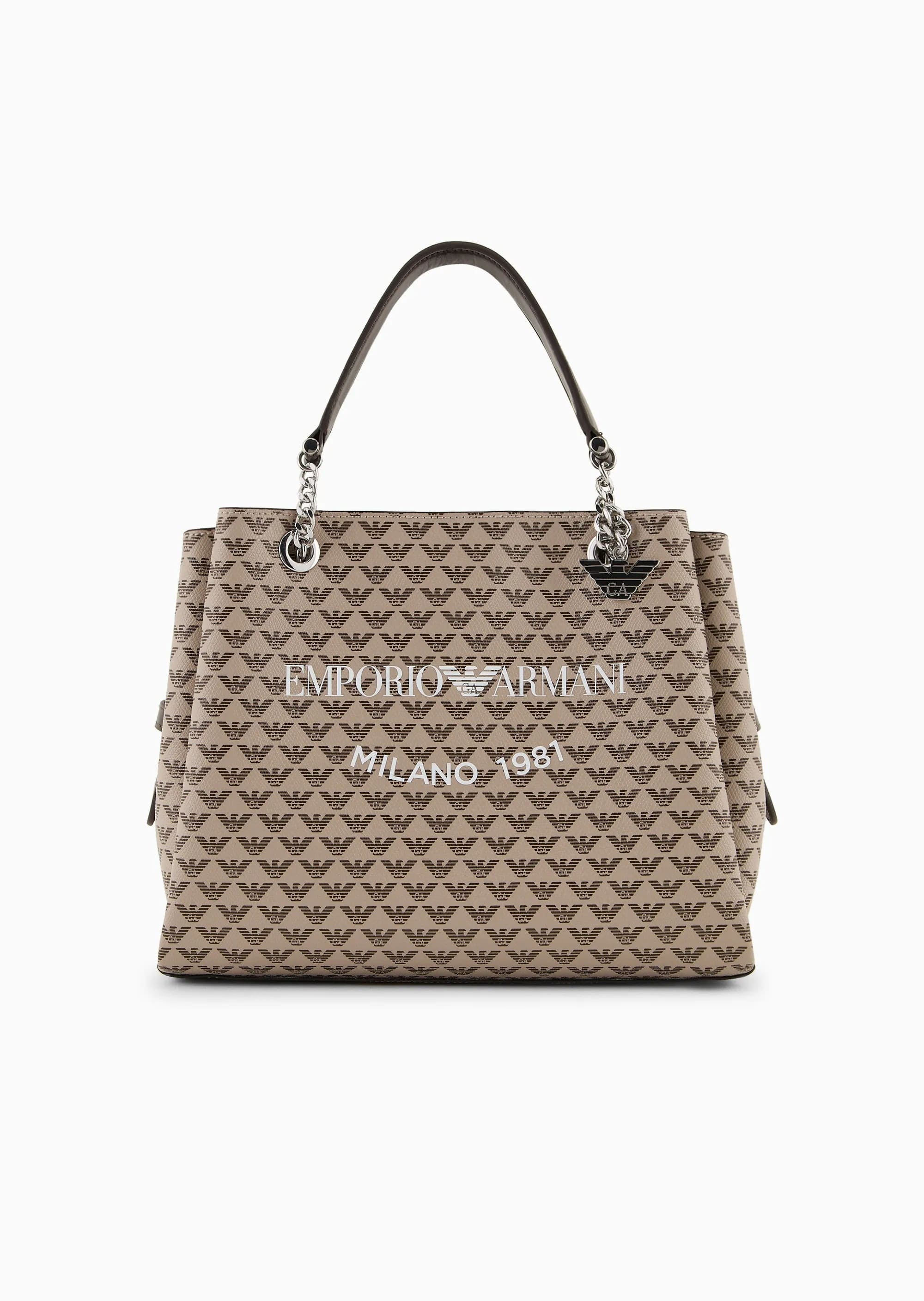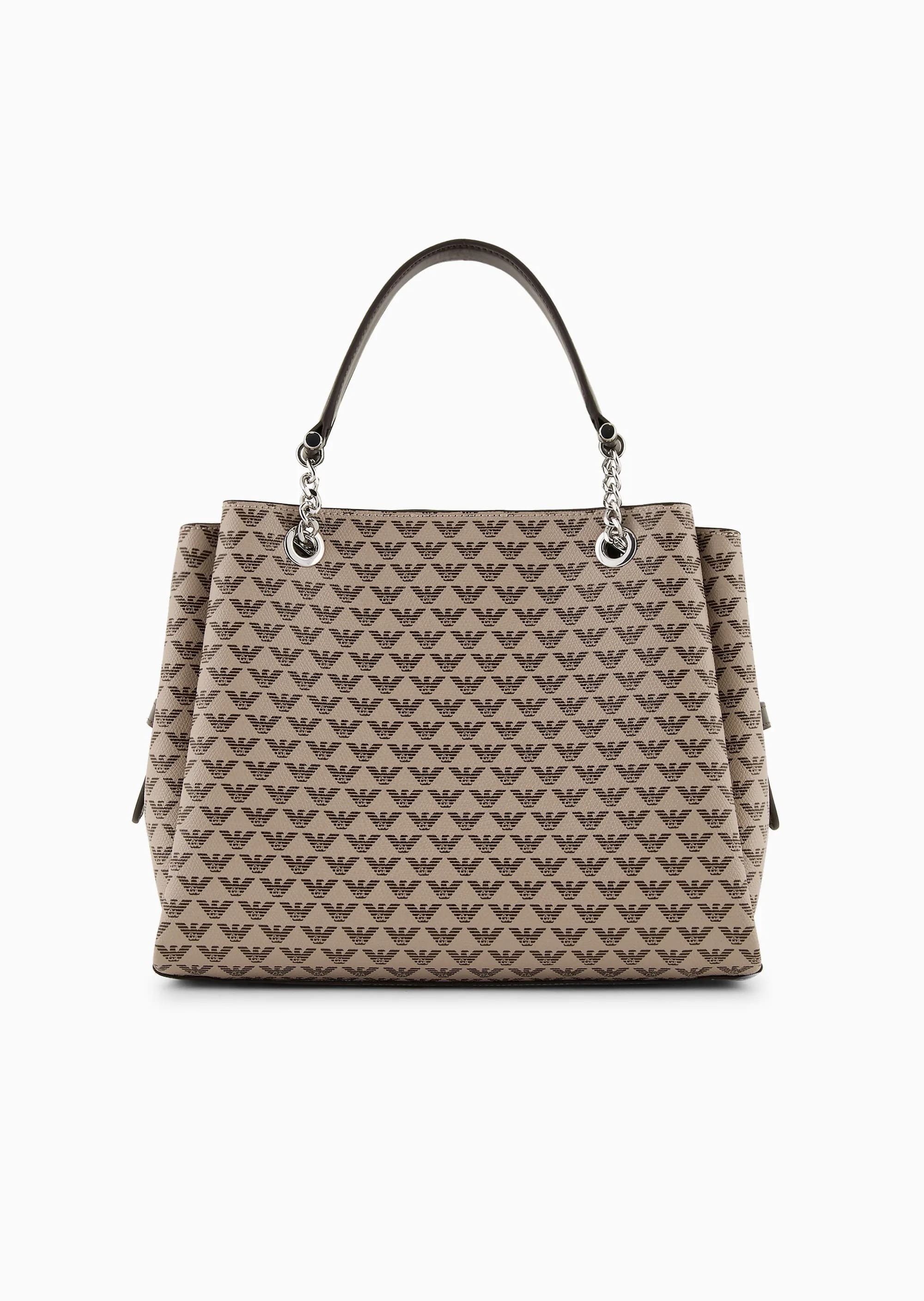 Эта сумочка имеет двойную ручку, практичный регулируемый и съемный плечевой ремень, фигурный шарм и известный орел, принтованный повсюду. Удобная внутренняя нейлоновая сумка на молнии, которую можно застегивать или отсоединять от сумки по желанию. И обычная, и практичная, эта женская сумка подходит для ежедневного использования, сохраняя свой выразительный стиль благодаря монограмме с культовым орлом по всей поверхности.