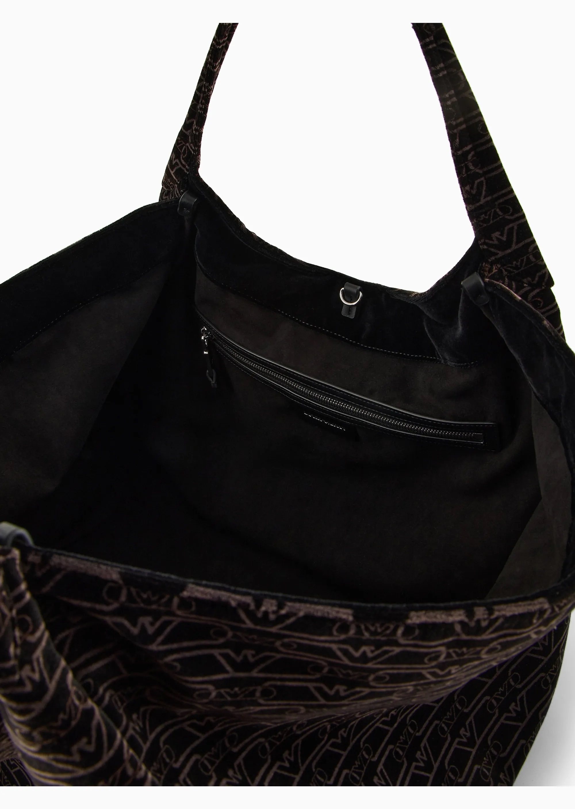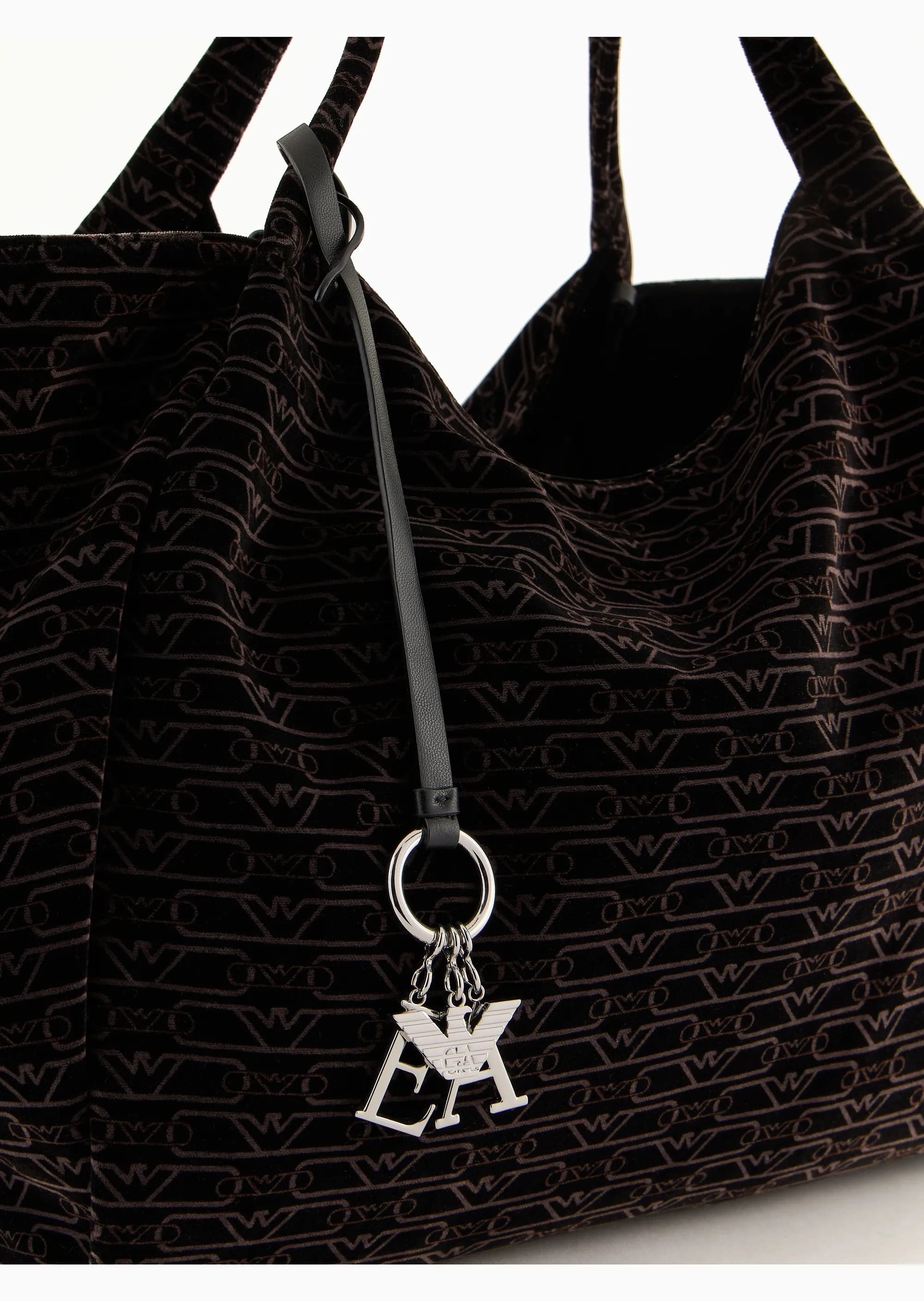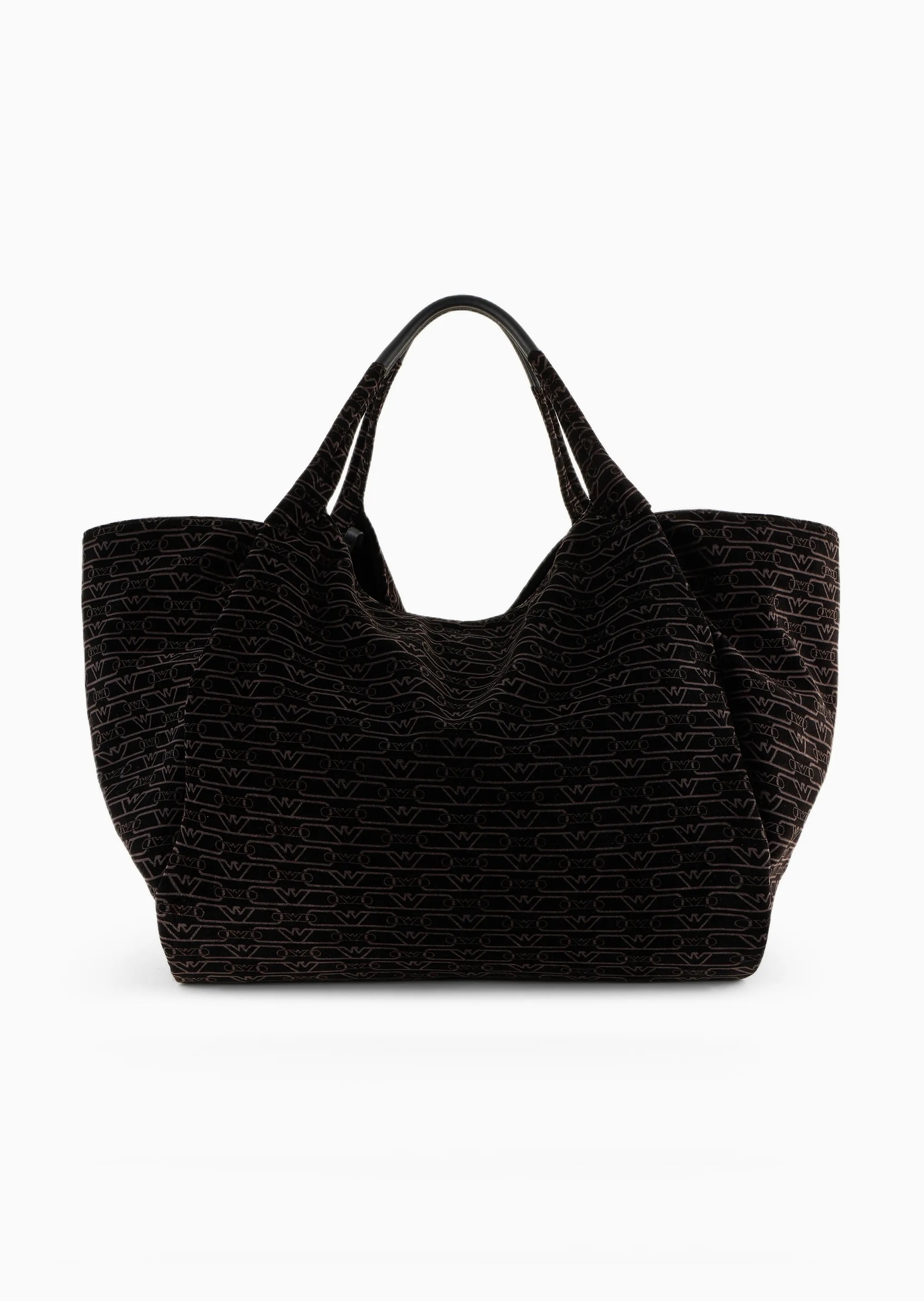 Большая сумка-шопер с двойной ручкой из бархата, украшенная монограммным логотипом по всей поверхности. Новая модель sac du jour, отражающая элегантный, утонченный, функциональный и шикарный стиль женщины Emporio Armani. Дизайн черпает вдохновение из архивной модели, взятой и переработанной в пропорциях, адаптированной к более современному контексту.