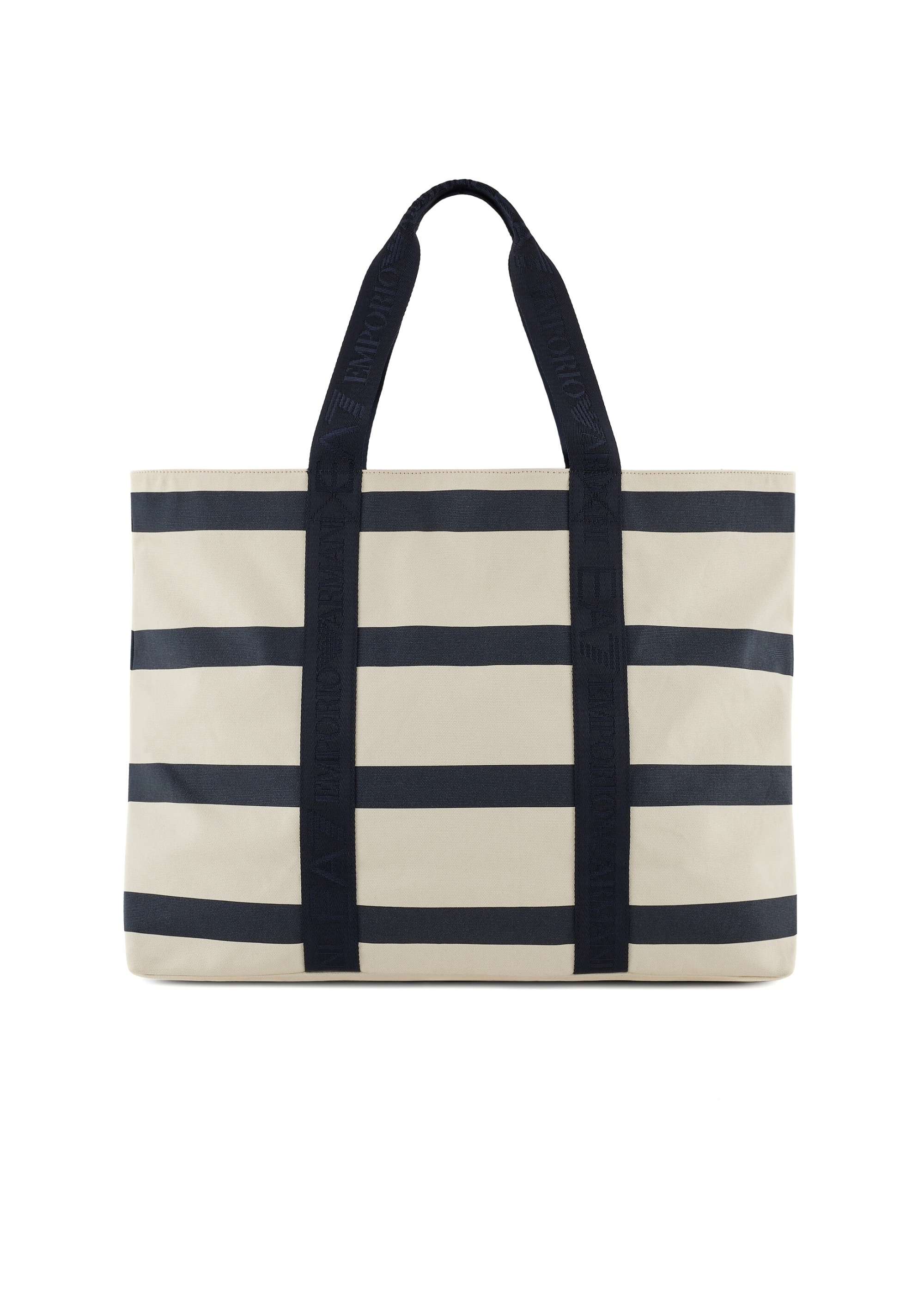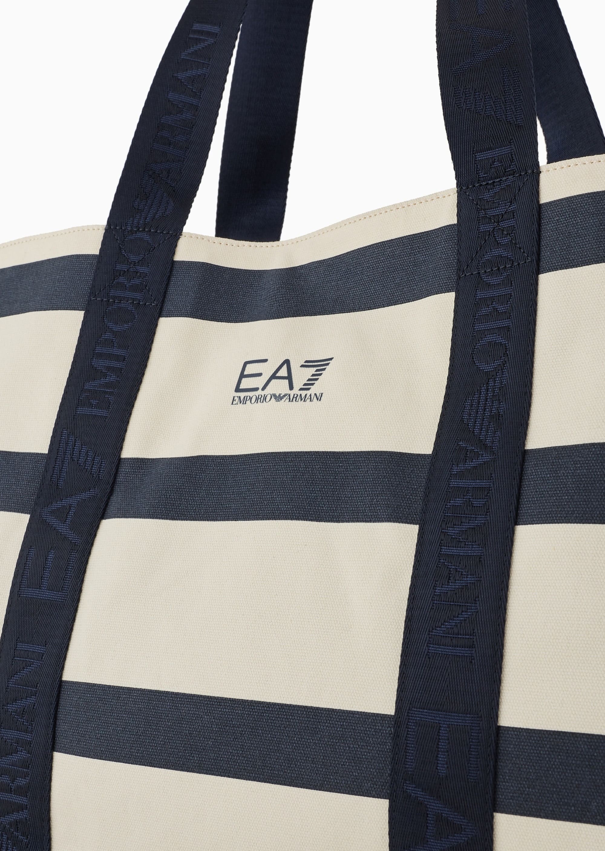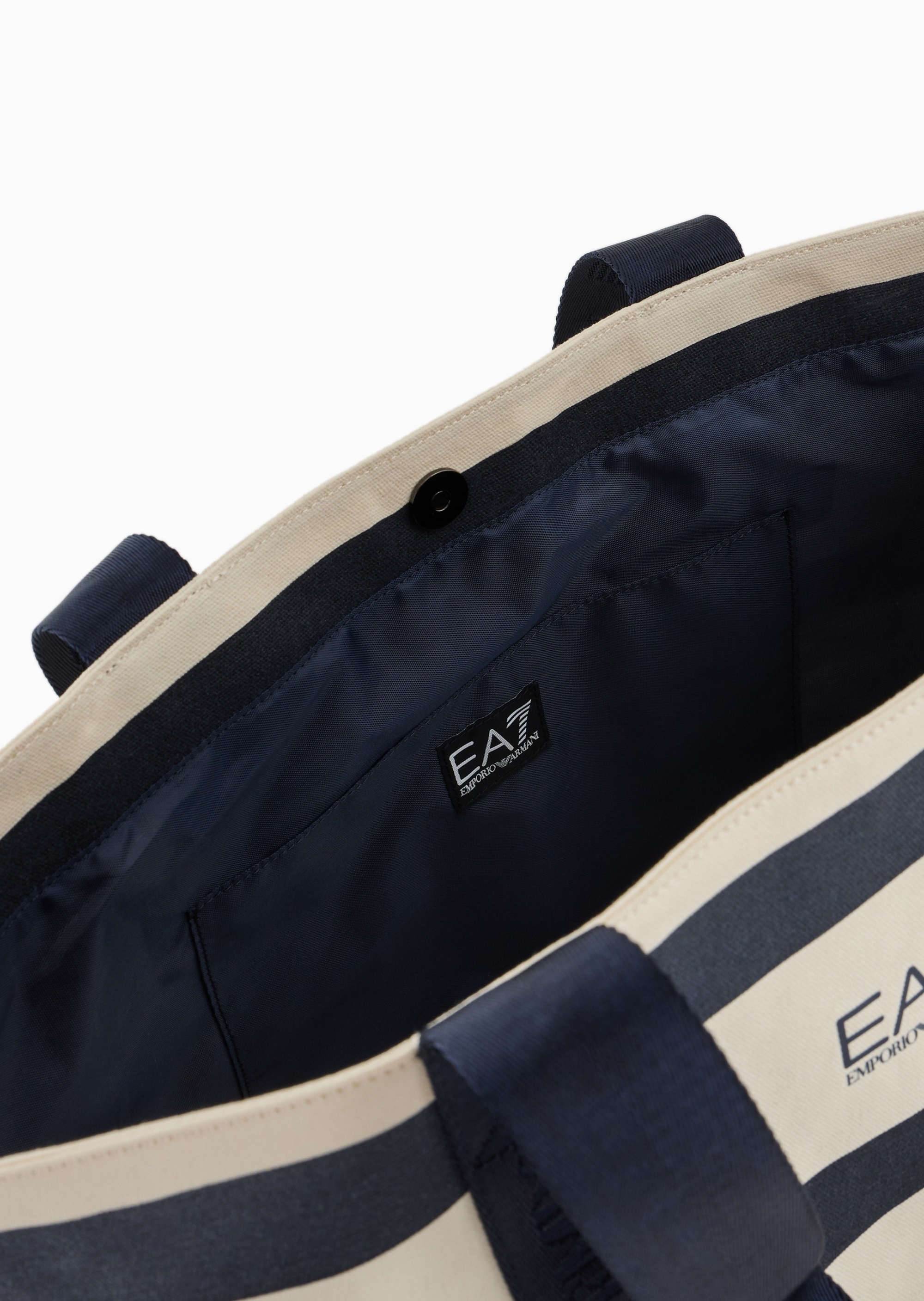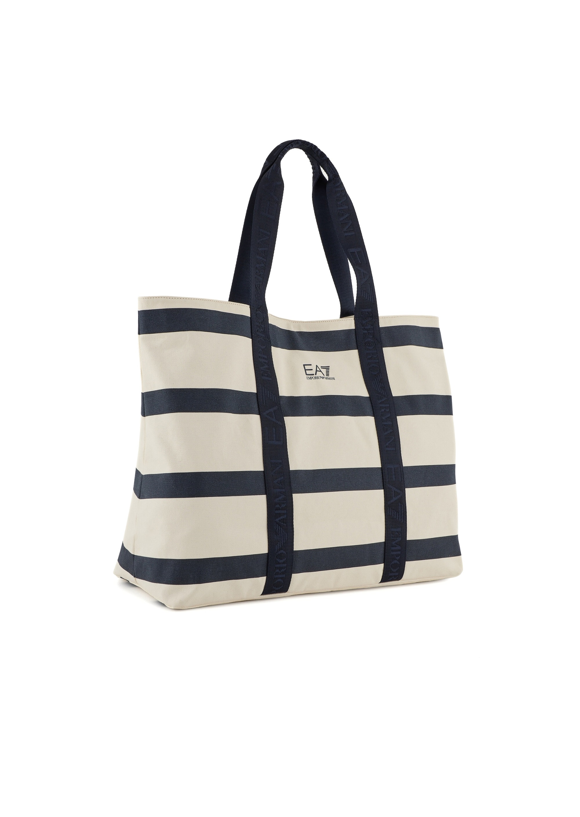Базовая, универсальная сумка-шоппер среднего размера из бежевой ткани. Вместительная модель с жесткими ручками украшена логотипом EA7 спереди. Идеальный аксессуар для завершения как повседневных образов, так и для отдыха.
