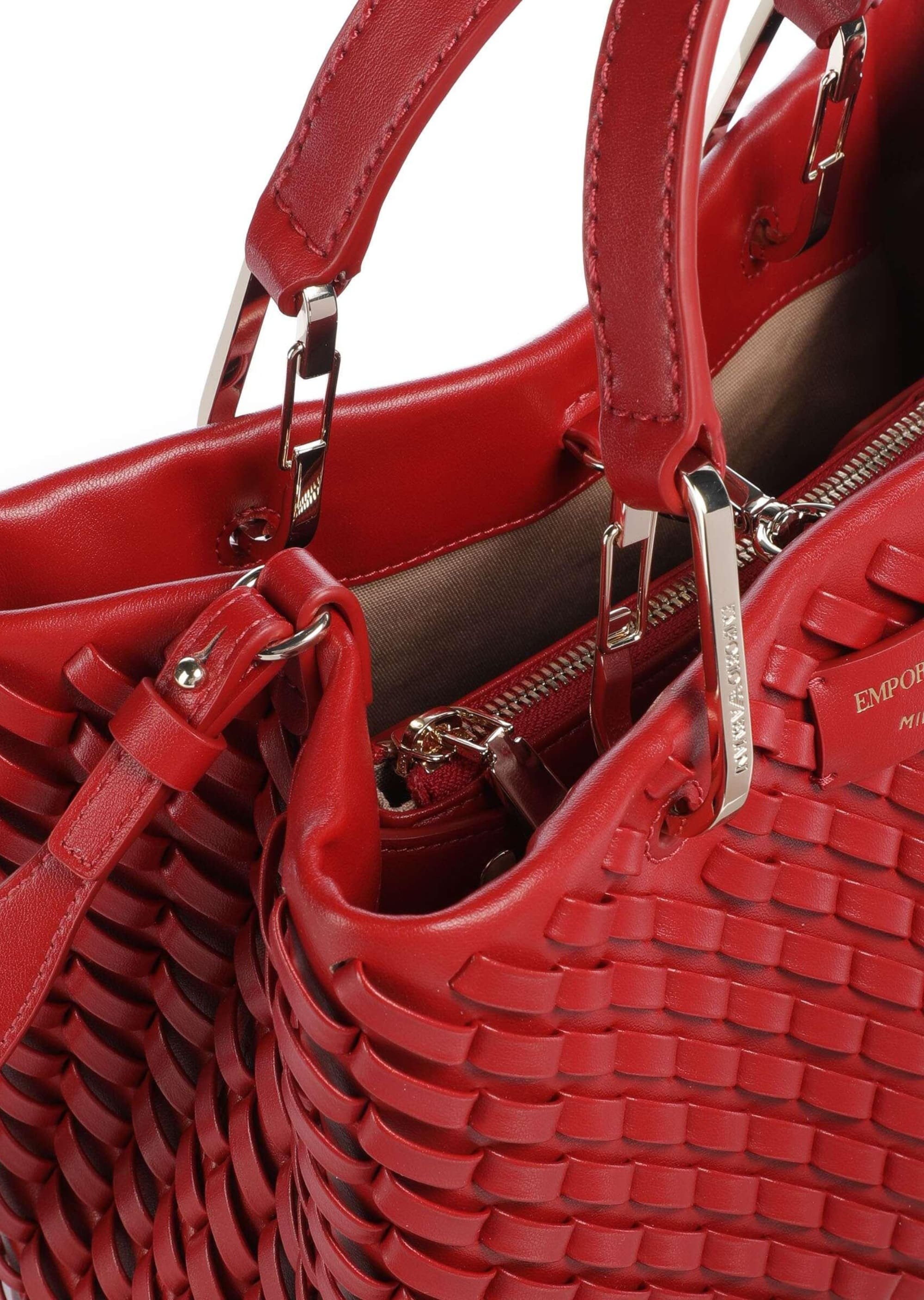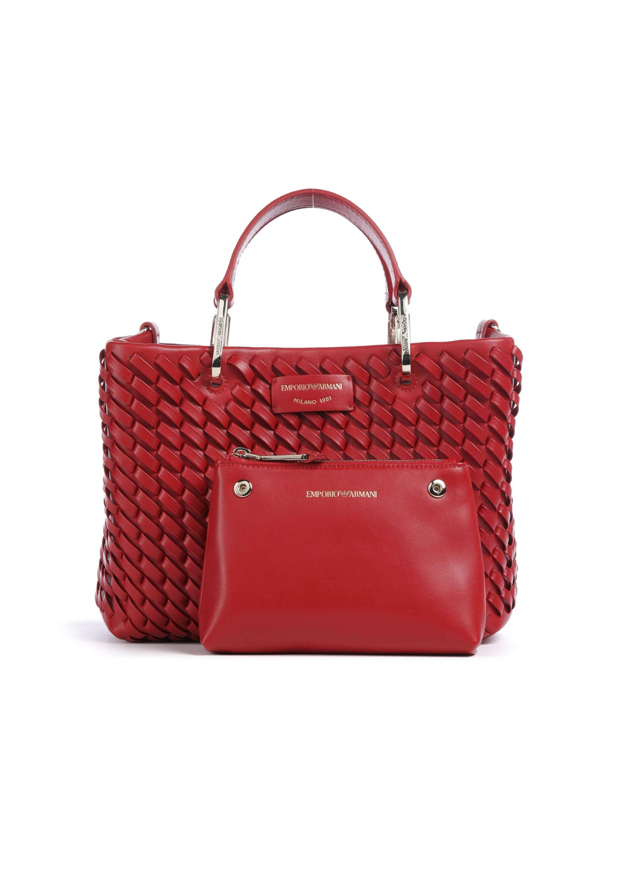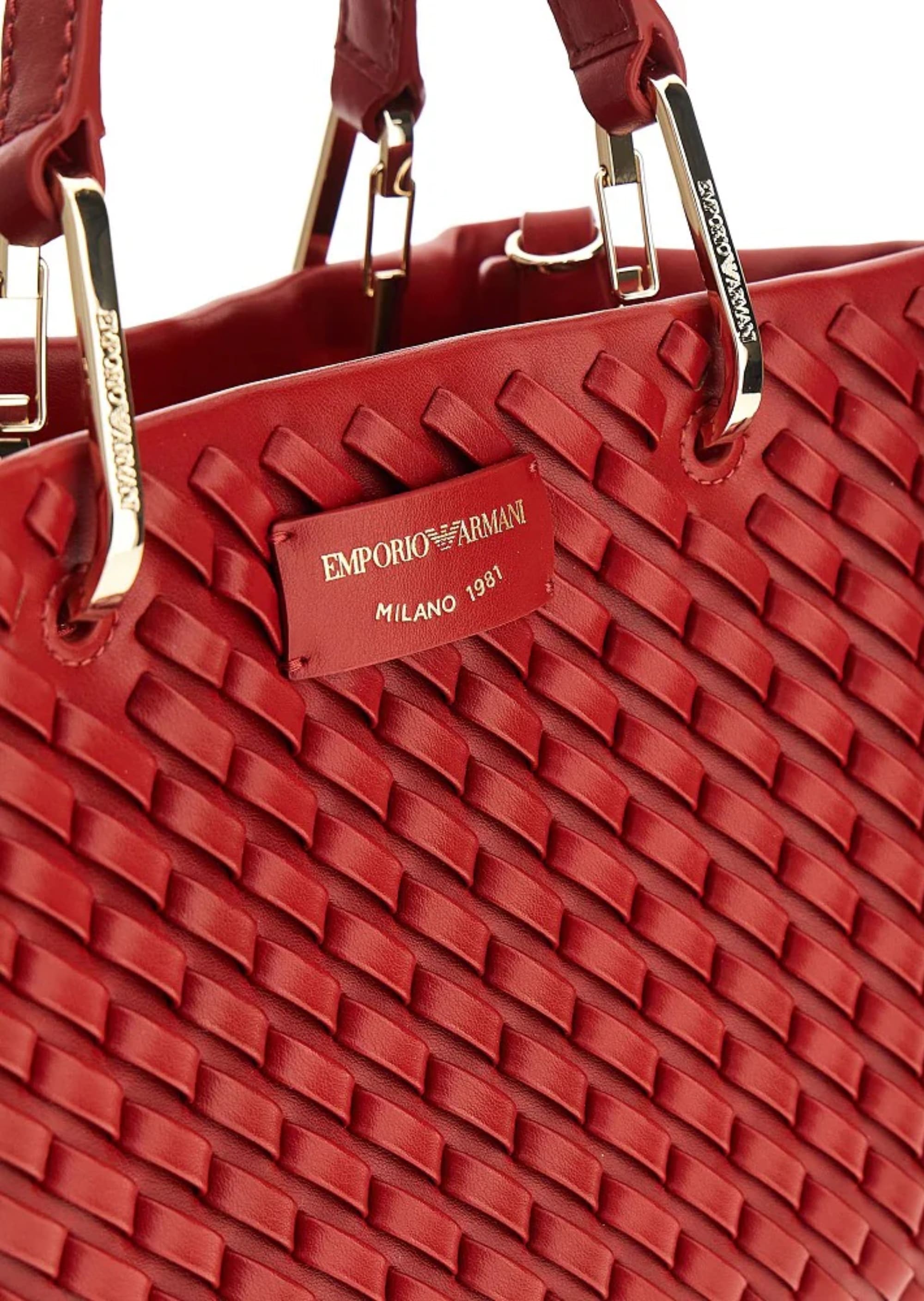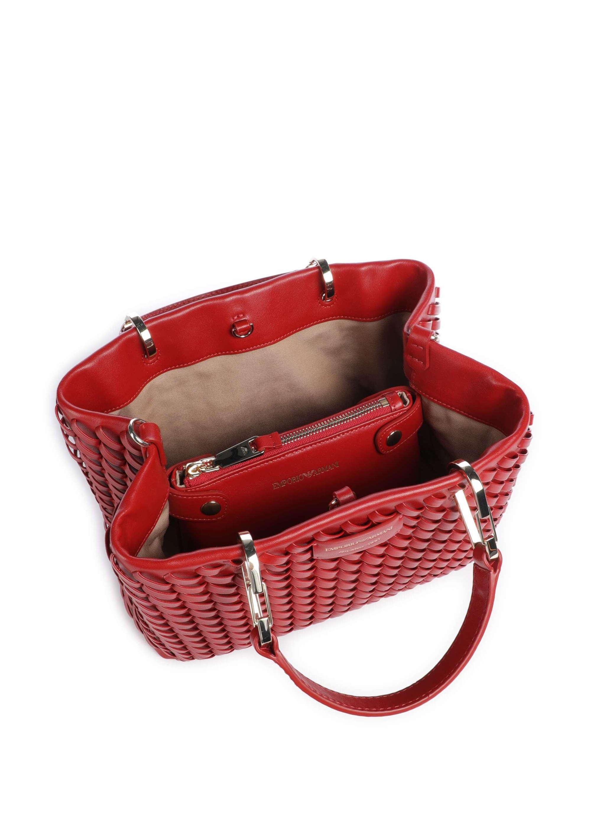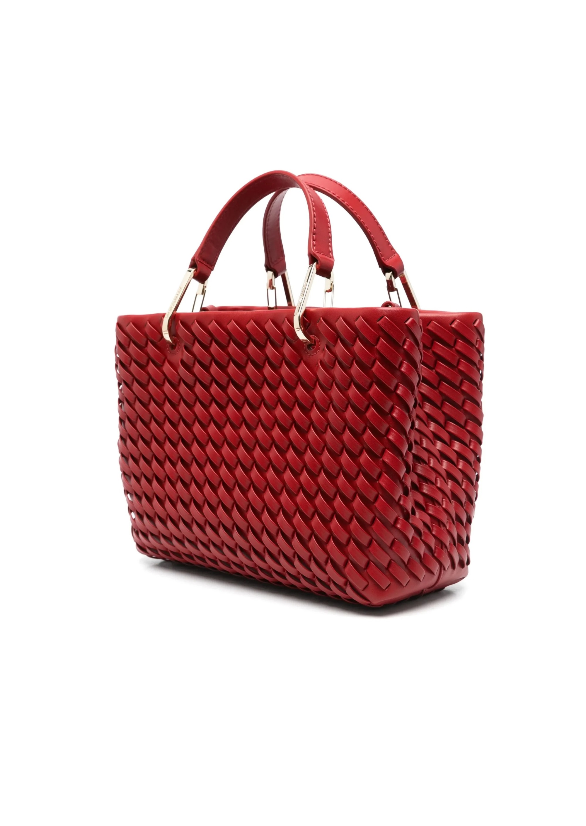 Маленькая сумка из переплетенной кожи на магнитной застежке. Предмет украшен зажимами с логотипом, съемным плечевым ремнем и внутренней сумкой на молнии. Красный цвет придаст образу яркости и подчеркнет индивидуальность стиля.