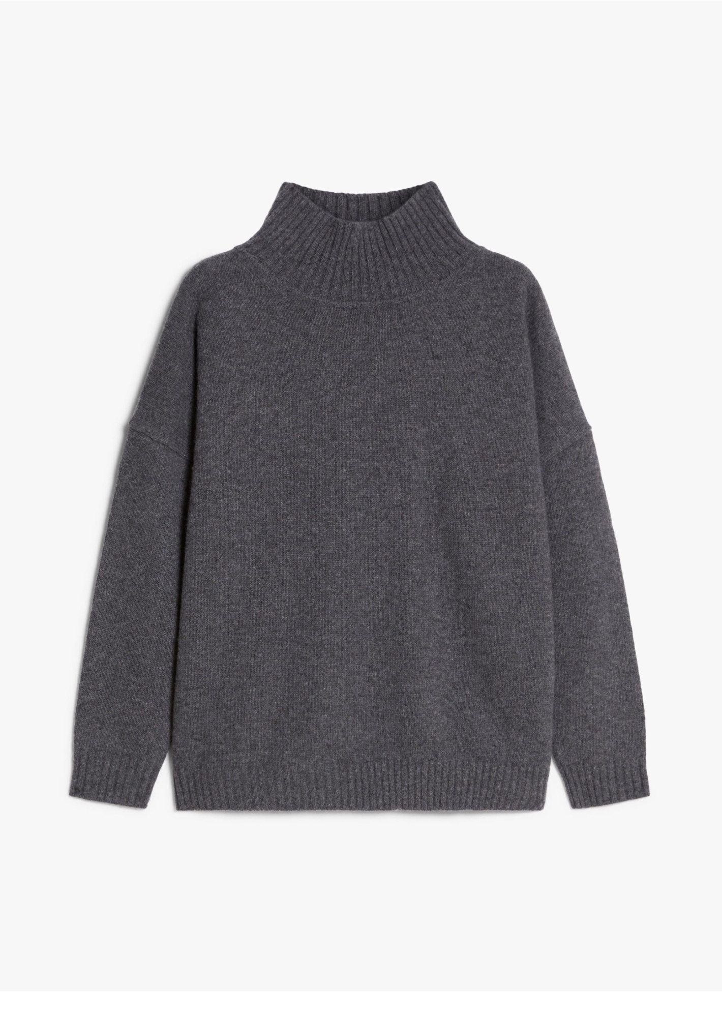 Свитер из тонкой пряжи из чистой шерсти, связанный чулочной вязкой, с высоким воротом и длинными низко втачными рукавами. Модель отличается свободным кроем и слегка свободным кроем.