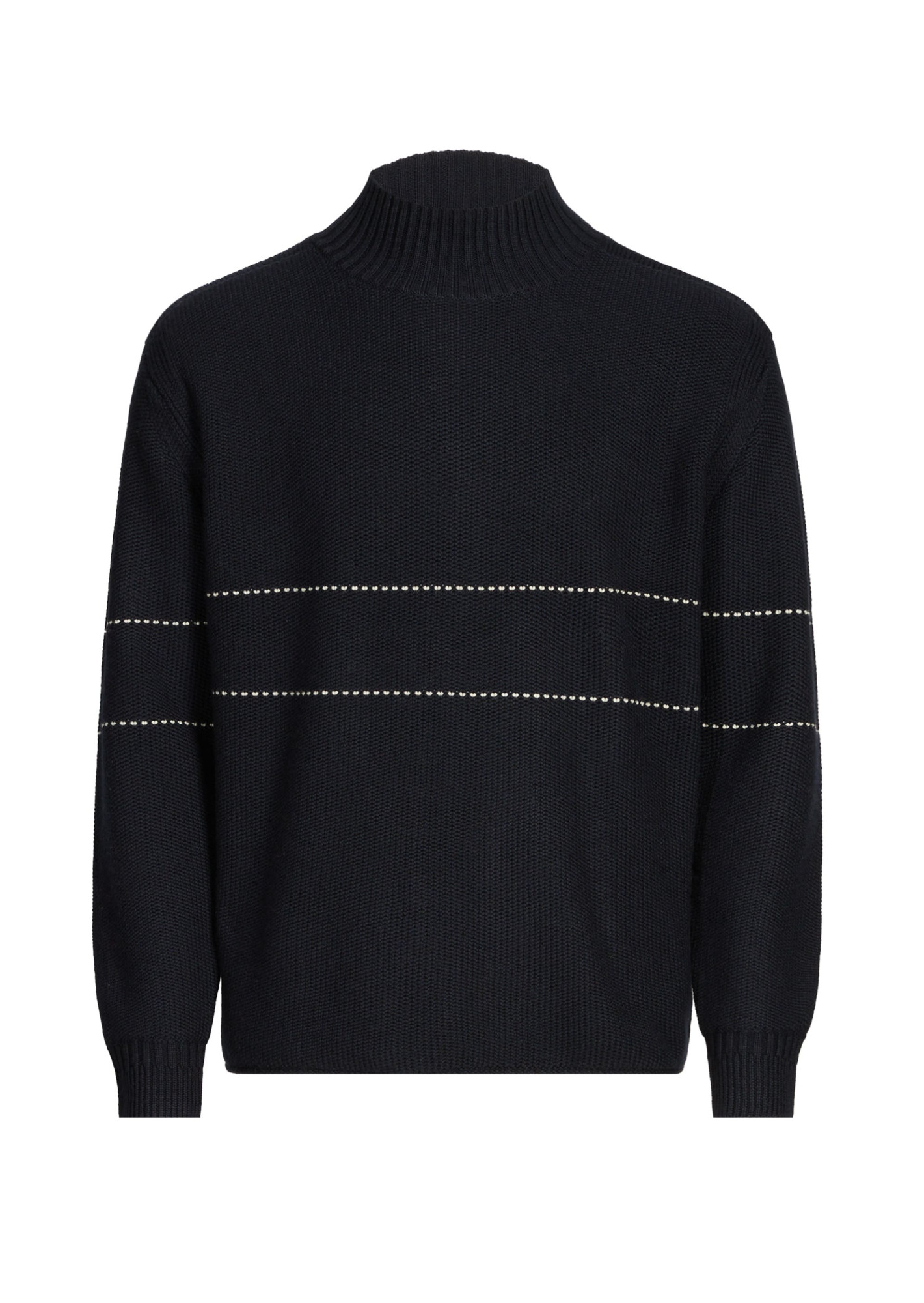 Стильный свитер Emporio Armani, модель из смесовой шерсти, идеально подходящая для осенне-зимнего сезона, отличается сетчатым эффектом, классическим кроем и высоким воротником. Свитер выполнен в классическом темно-синем цвете и украшен двумя горизонтальными полосками спереди и на рукавах.