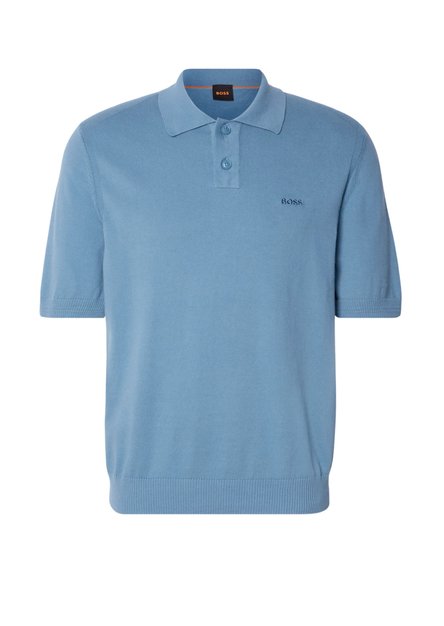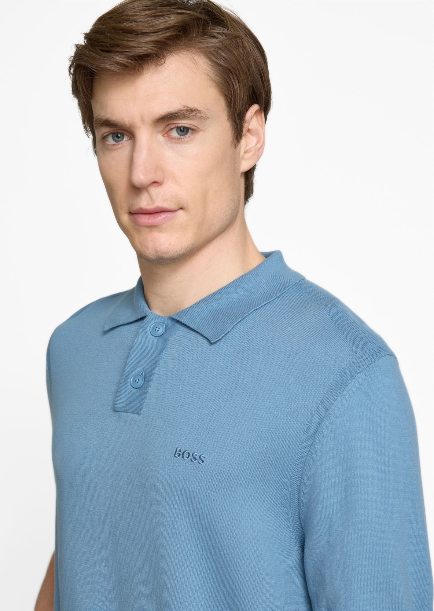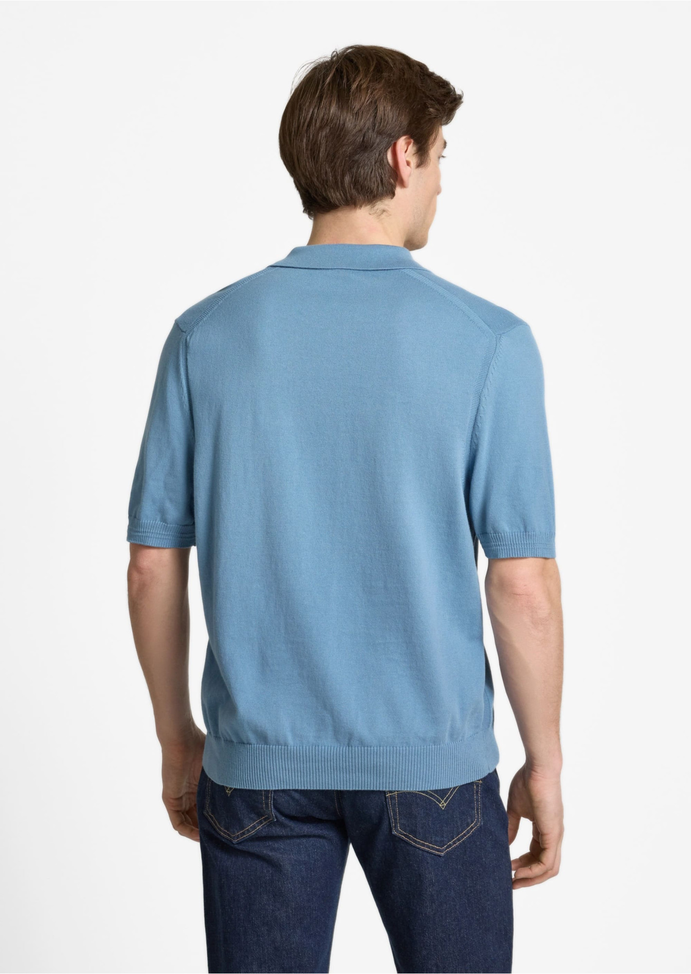 Поло синего цвета выполнено из мягкого трикотажа с высоким содержанием хлопка. Прямой силуэт с классическим воротником и планкой на двух пуговицах дополнен короткими рукавами с эластичной окантовкой. Минималистичный дизайн акцентирован вышитым логотипом на груди. Сочетается с джинсами, шортами, брюками в неформальных ансамблях. Универсальный элемент гардероба в повседневном стиле с акцентом на комфорт и сдержанную эстетику.