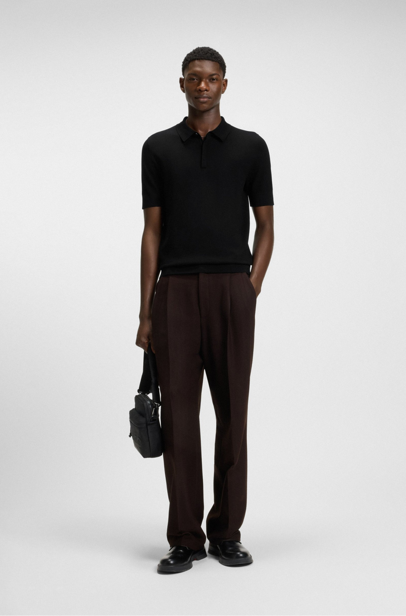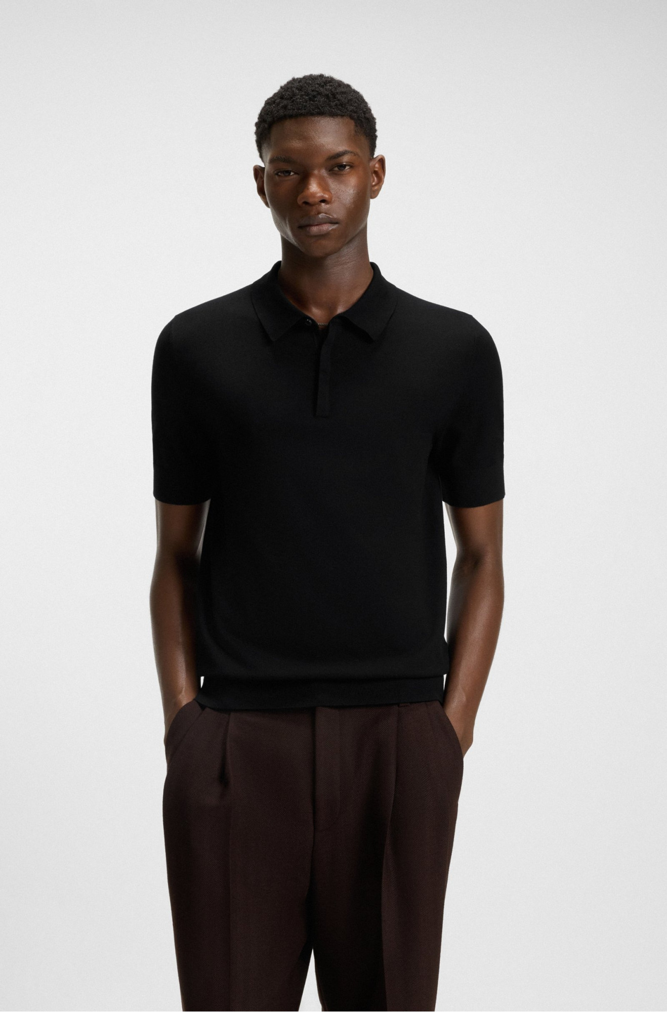 Поло HUGO в чёрном оттенке выполнено из мягкого трикотажа на основе вискозы с добавлением полиэстера, что придаёт модели комфорт и долговечность. Прямой крой и скрытая планка создают минималистичный силуэт, а интарсированный логотип на спинке выступает выразительным фирменным акцентом. Универсальный чёрный цвет делает поло стильным и современным решением как для повседневных, так и для более элегантных ансамблей. Эта модель HUGO гармонично объединяет практичность и премиальный характер бренда