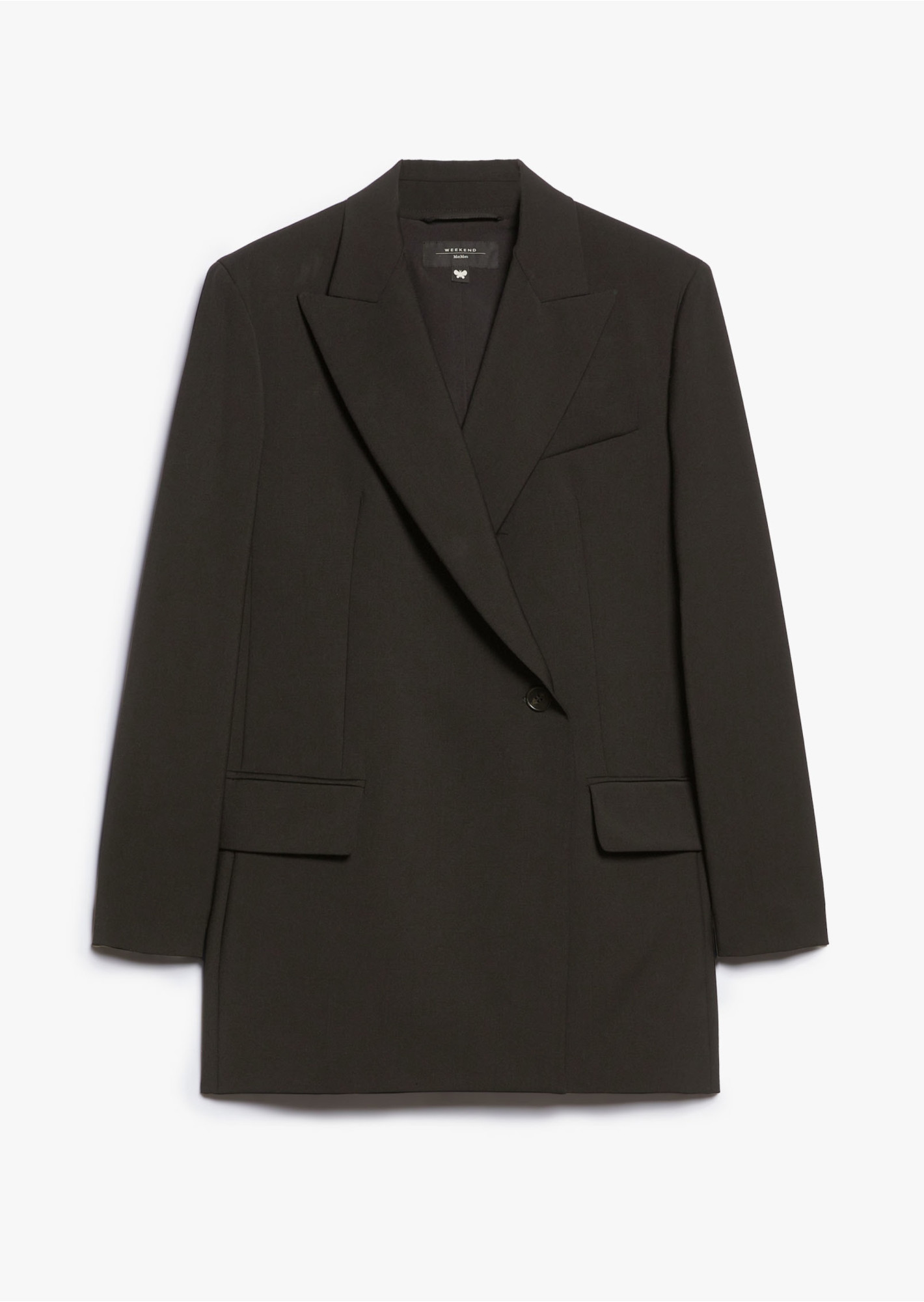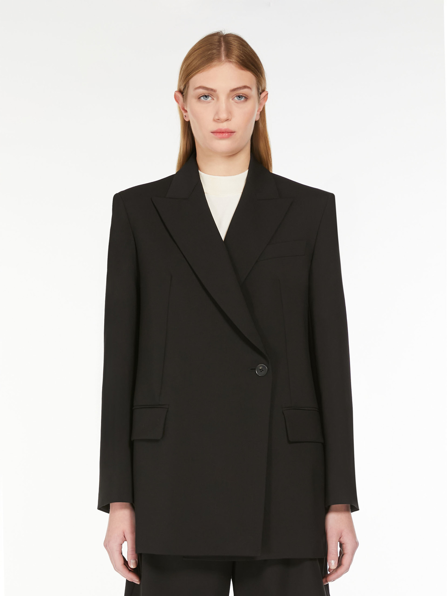 Двубортный жакет прямого кроя, выполнен из тонкой натуральной эластичной шерстяной ткани, с острым воротником, нагрудным карманом и прорезными передними карманами с клапанами. Модель на подкладке имеет центральную шлицу сзади и манжеты на пуговицах. Видимая застежка на одну пуговицу.