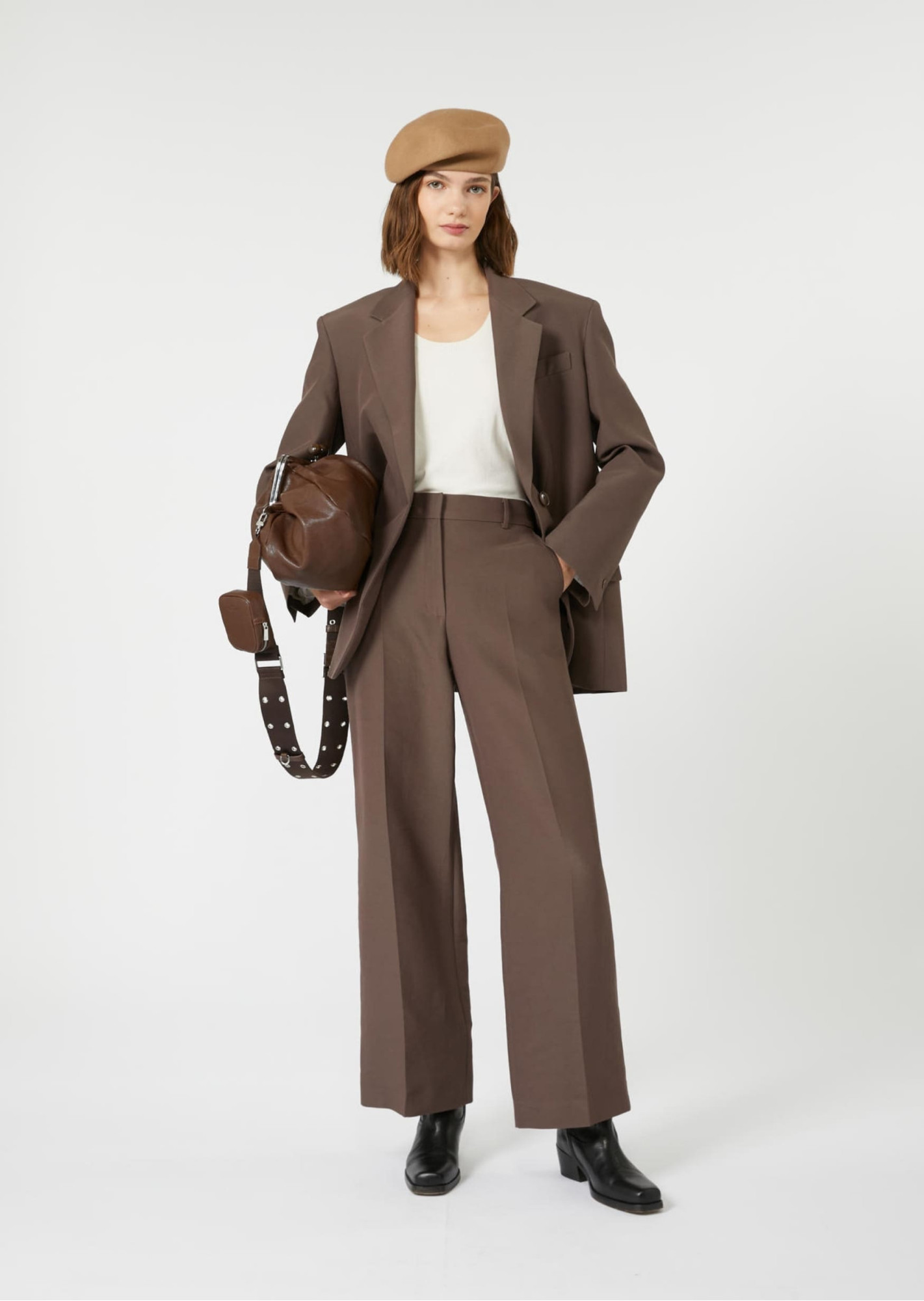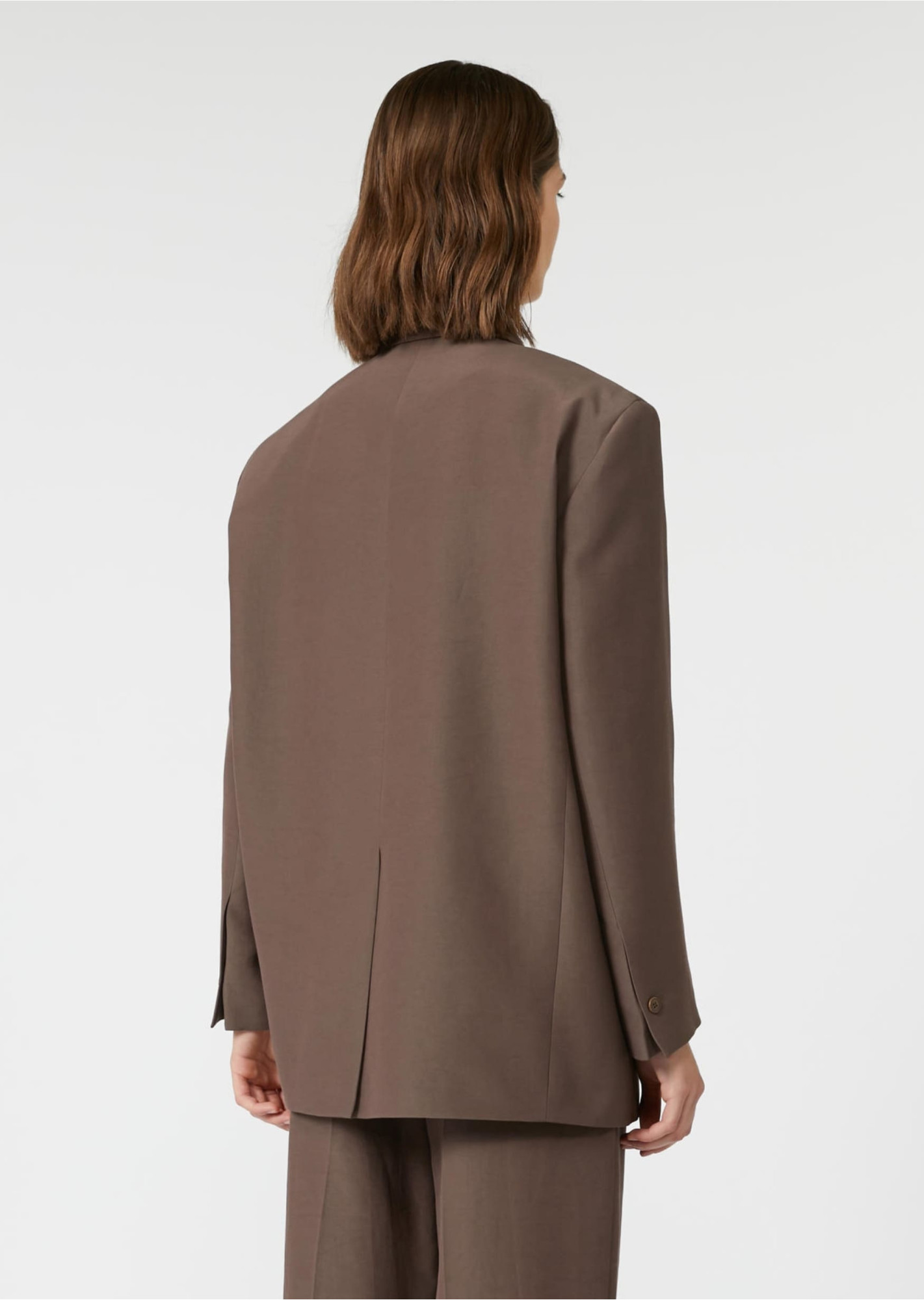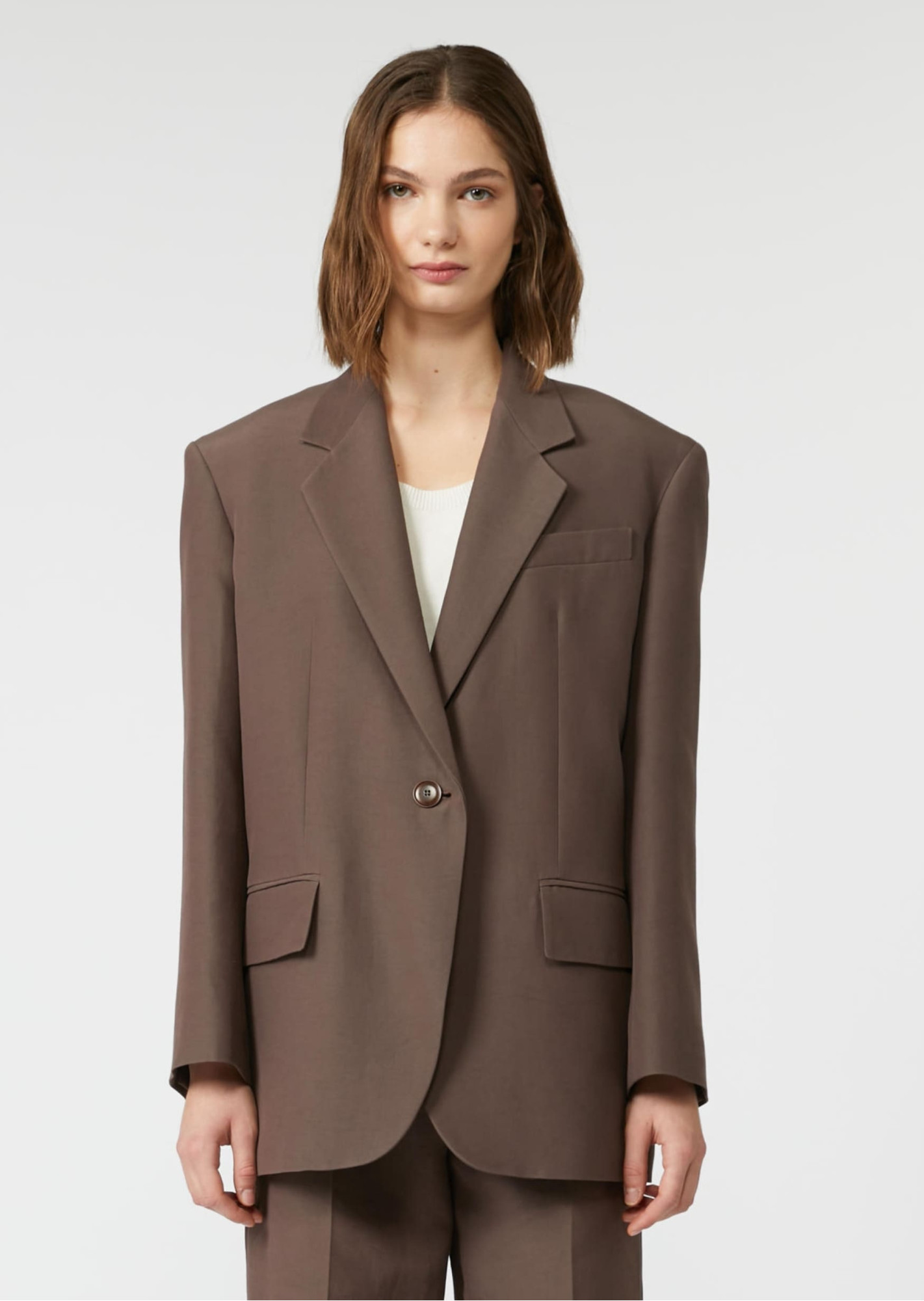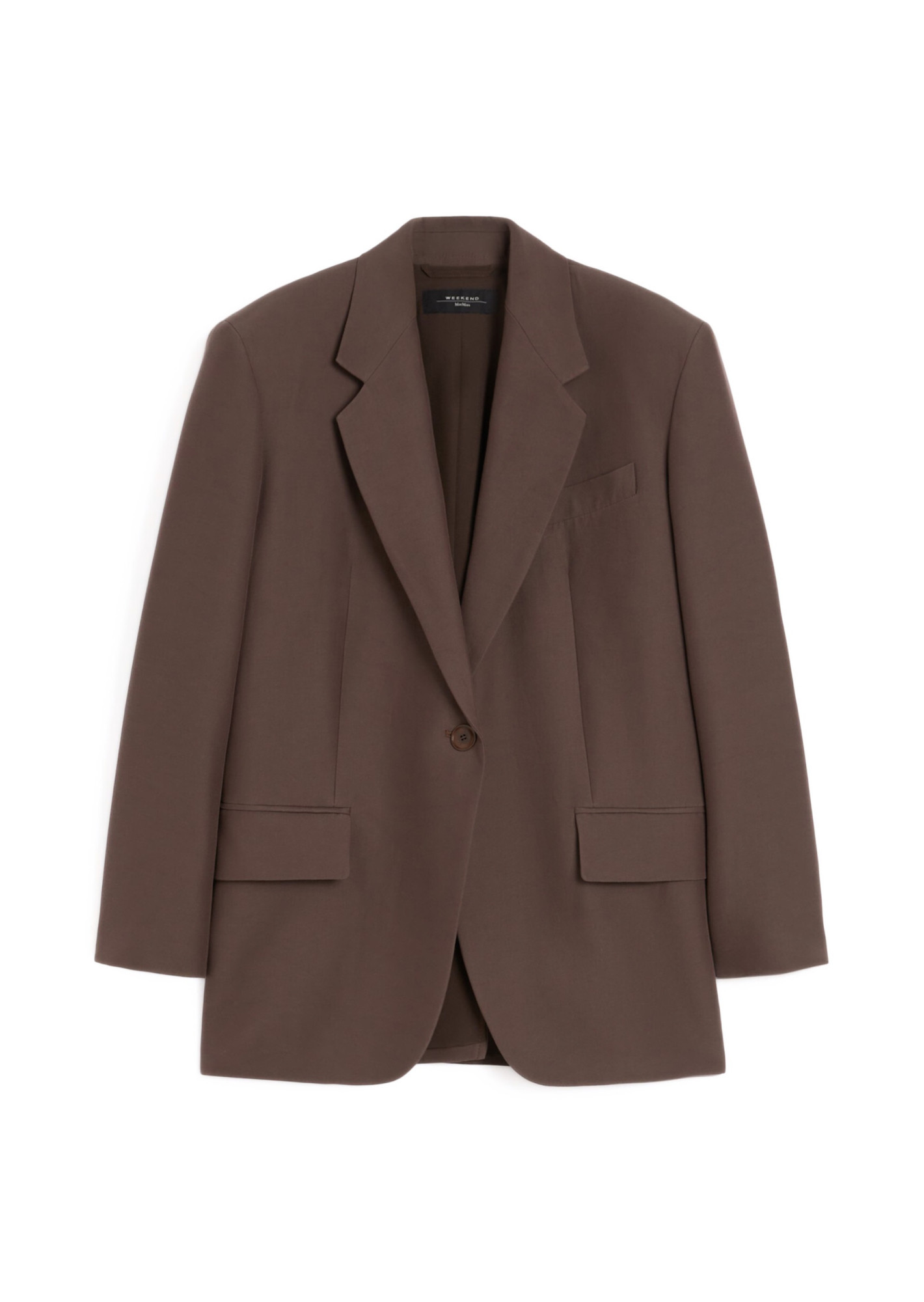 Жакет оверсайз Max Mara Weekend из хлопковой смеси, выполненный из двухслойной технической ткани в коричневом оттенке. Прямой силуэт с немного заниженными плечами создаёт актуальную расслабленную посадку. Изделие оснащено классическим воротником с лацканами, застёжкой на одну пуговицу, длинными рукавами с пуговицами на манжетах, нагрудным карманом и прорезными карманами с клапанами спереди. Жакет полностью на подкладке, с центральной шлицей сзади для свободы движений. Фундамент стильного гардероба — сочетается с широкими брюками, юбками-карандаш или джинсами, доповнюючи как деловой, так и повседневный образ.