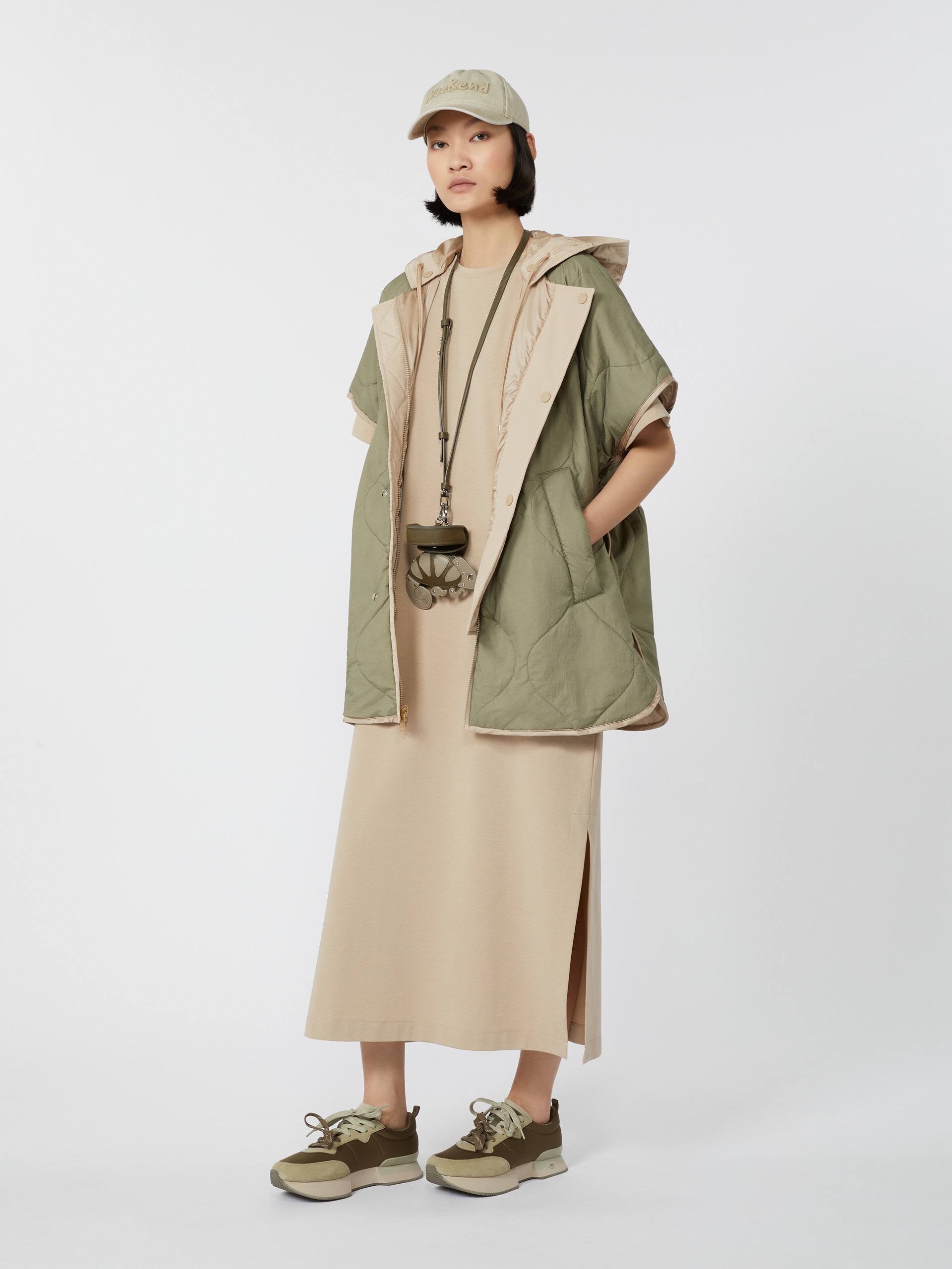 Двусторонняя накидка Weekend Max Mara из водоотталкивающей канвы с утеплителем Luxepad — инновационной смесью верблюжьей шерсти и шёлка. Внутренняя часть оформлена объёмной стёжкой с узором «луковица», равномерно распределяющим тепло. Модель с круглым вырезом, короткими рукавами кимоно и съёмным капюшоном на кулиске. Застёжка скрытая — молния и кнопки. Прорезные карманы расположены с обеих сторон. Пояс регулируется кулиской, по бокам — разрезы на кнопках для свободы движения. Накидка легко сочетается с тонким трикотажем, водолазками, брюками прямого или зауженного кроя. Актуальна в многослойных образах с удлинёнными рубашками и джемперами. Этот вариант верхней одежды объединяет защиту от влаги, комфорт и продуманный минимализм в эстетике Weekend Max Mara.