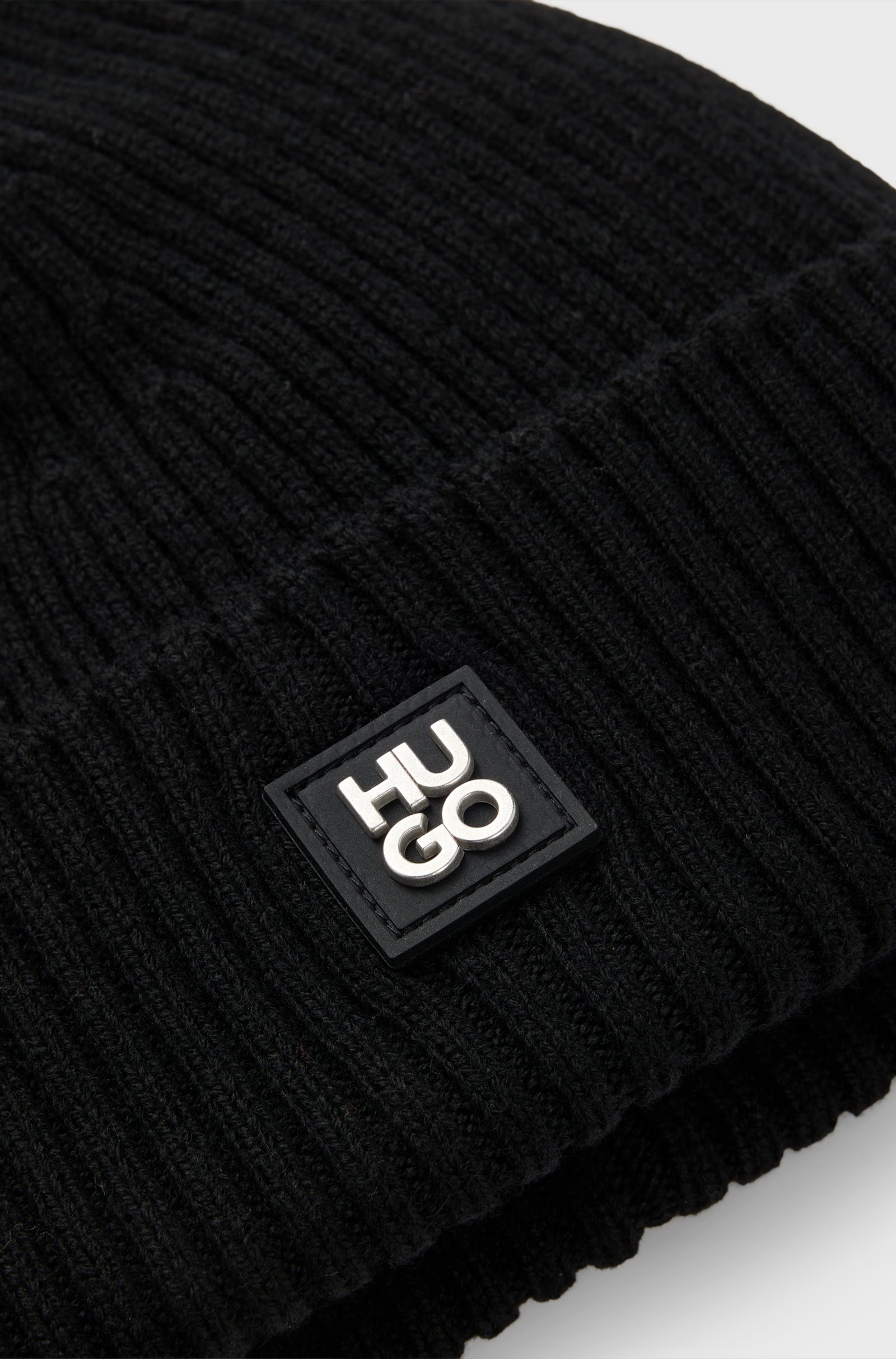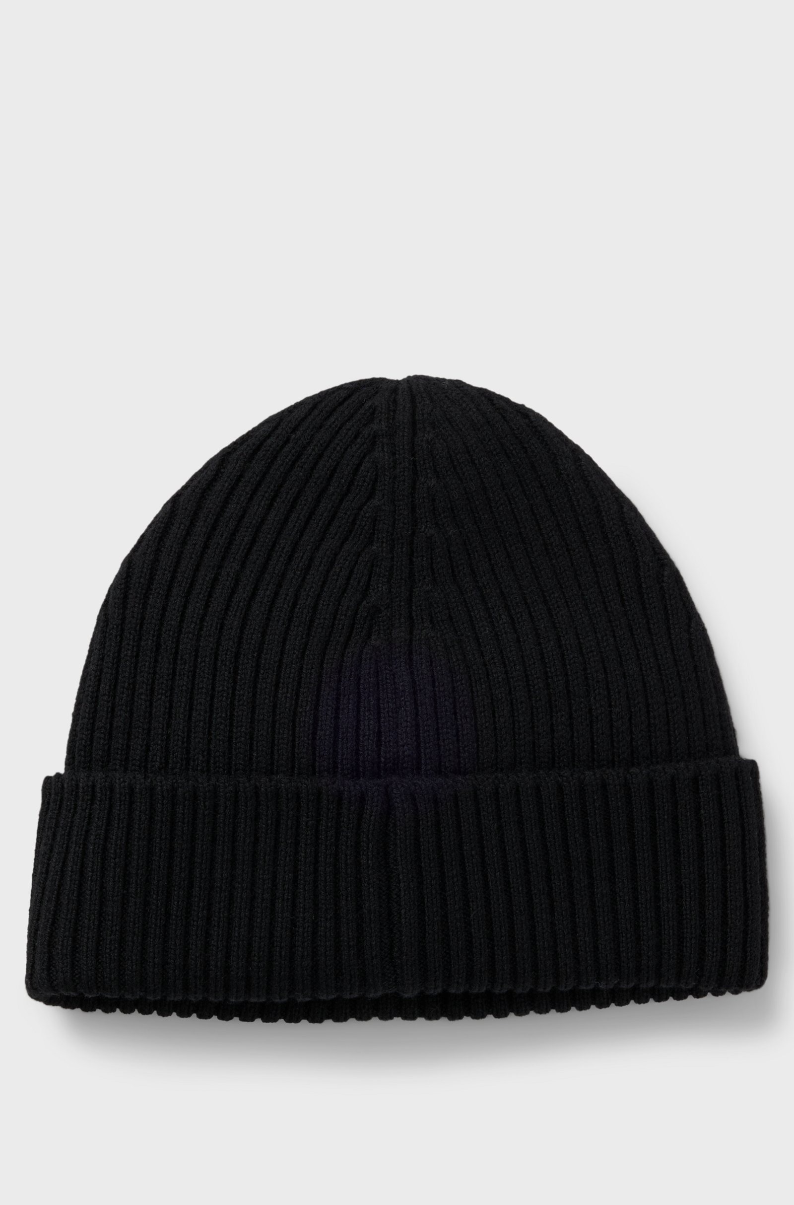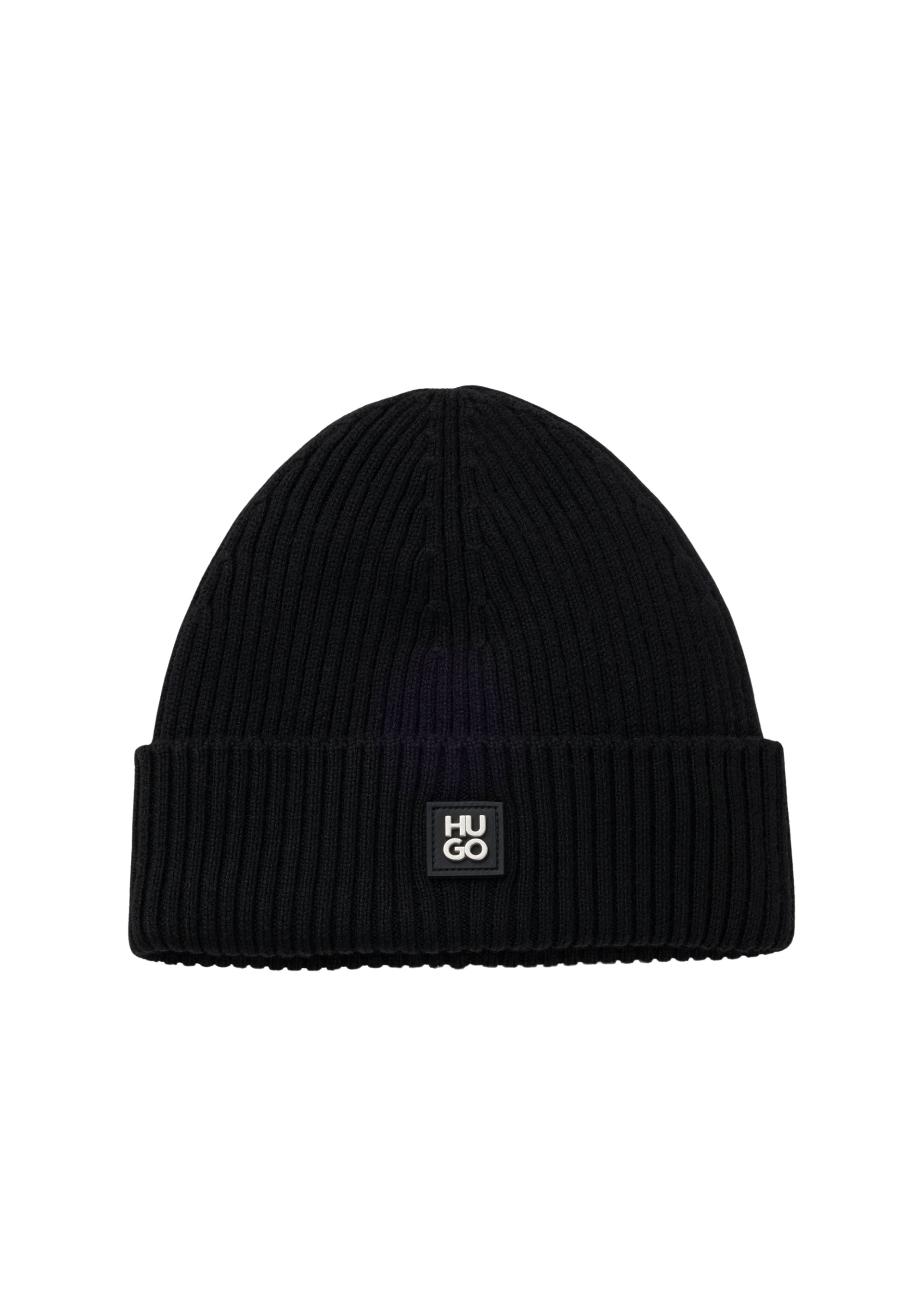 Шапка-біні HUGO чорного відтінку виготовлена зі сто відсотків virgin wool, що забезпечує тепло і м’якість. Ребриста в’язка створює щільну фактуру, логотип-нашивка з полірованими літерами підкреслює фірмовий стиль. Модель виступає стильним аксесуаром до зимового пальта, куртки або толстовки, стаючи завершальним елементом образу в прохолодну погоду.