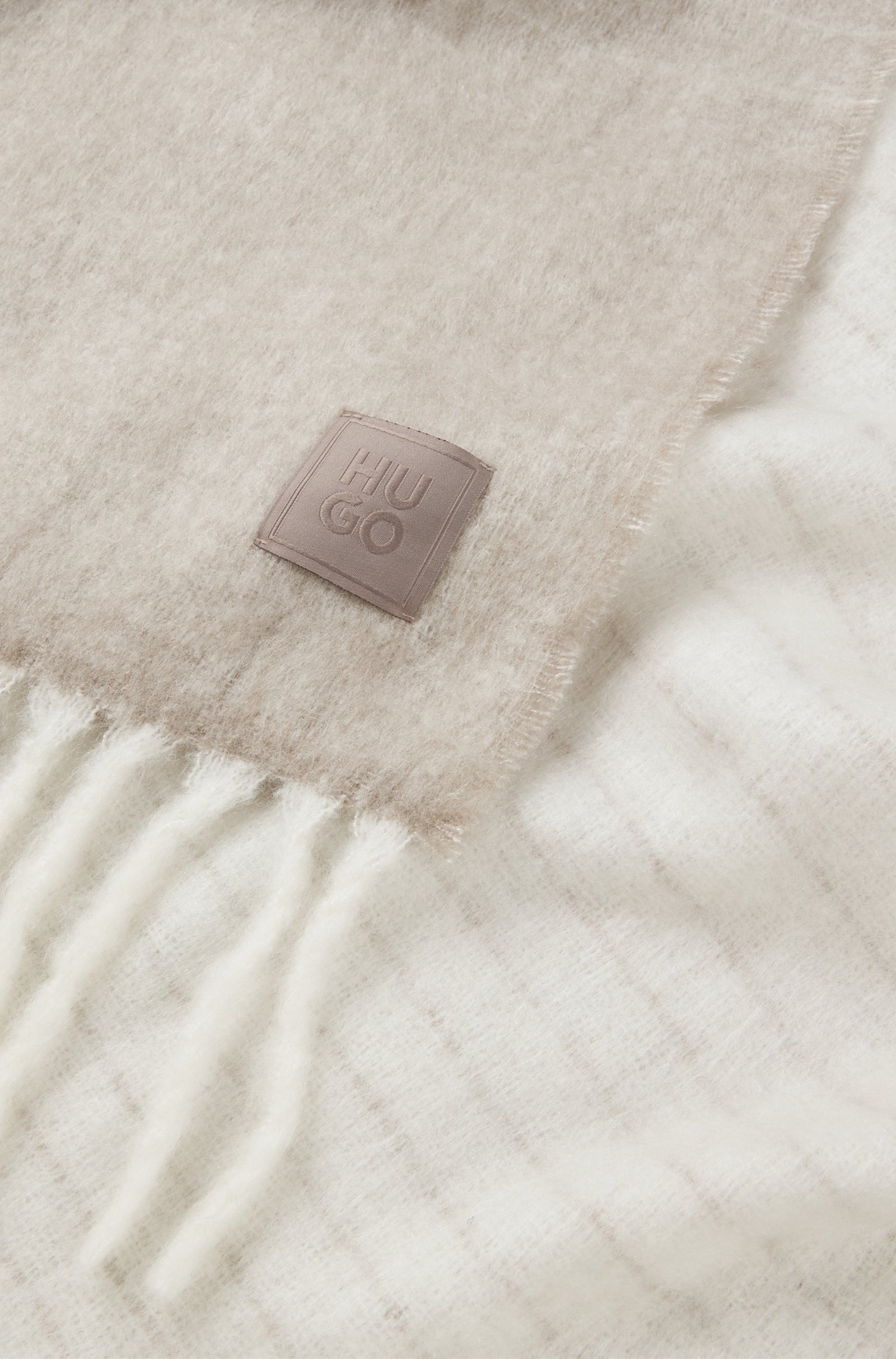 Шарф HUGO світло‑бежевого кольору виконаний з м’якої brushed тканини, створюючи відчуття тепла та затишку. Оверсайз‑формат забезпечує об’єм, вільну посадку та універсальність для щоденного стилю. Еко‑шерстяна текстура доповнена фактурною бахромою і акуратною нашивкою з логотипом, додаючи стильного акценту. Шарф гармонійно поєднується із зимовими пальтами, пуховиками або вʼязаним трикотажем. Шарф HUGO об’єднує комфорт, сучасність та елегантність.