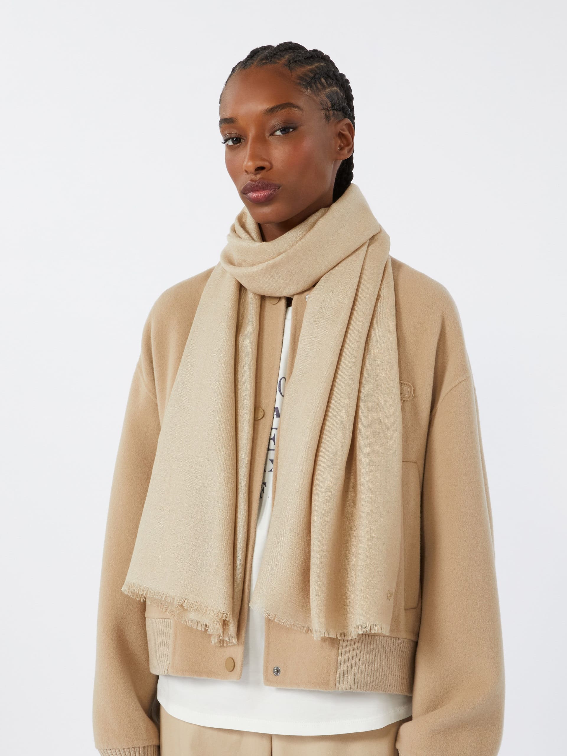 Шарф Max Mara Weekend із розкішної суміші кашеміру та шовку в універсальному бежевому відтінку. М’яка, тонка та дихаюча тканина з благородним матовим блиском. Легкий акцент в образі — поєднується з пальтами, трикотажем і куртками. Елегантний аксесуар для завершення образу в будь-яку пору року.