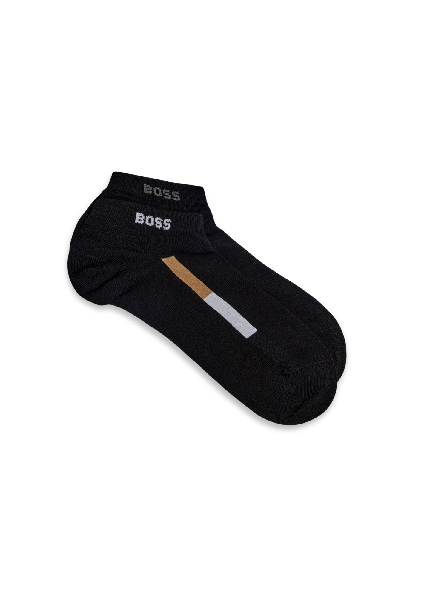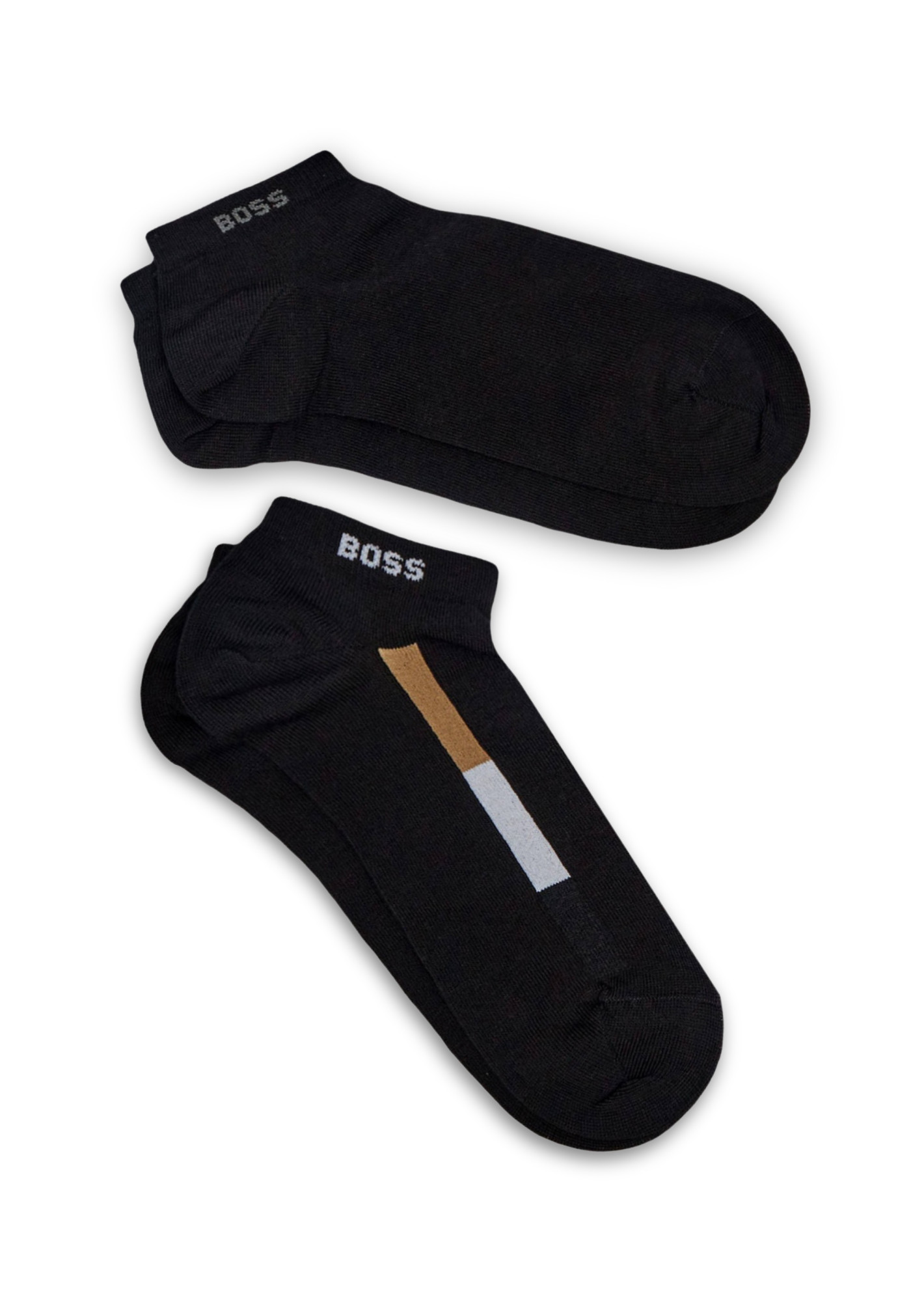 Набір із двох пар шкарпеток BOSS виготовлений із м’якої та еластичної тканини з високим вмістом бавовни, що забезпечує комфорт і щільну посадку. Еластична резинка на щиколотці підтримує форму та не тисне на шкіру. Чорний колір робить шкарпетки універсальними та непомітними у взутті. Акуратний контрастний логотип BOSS додає стриманого акценту. Ідеально поєднуються з повсякденним і діловим взуттям: кросівками, дербі, лоферами. Практичний аксесуар щоденного гардероба, що поєднує комфорт, довговічність і фірмовий стиль.