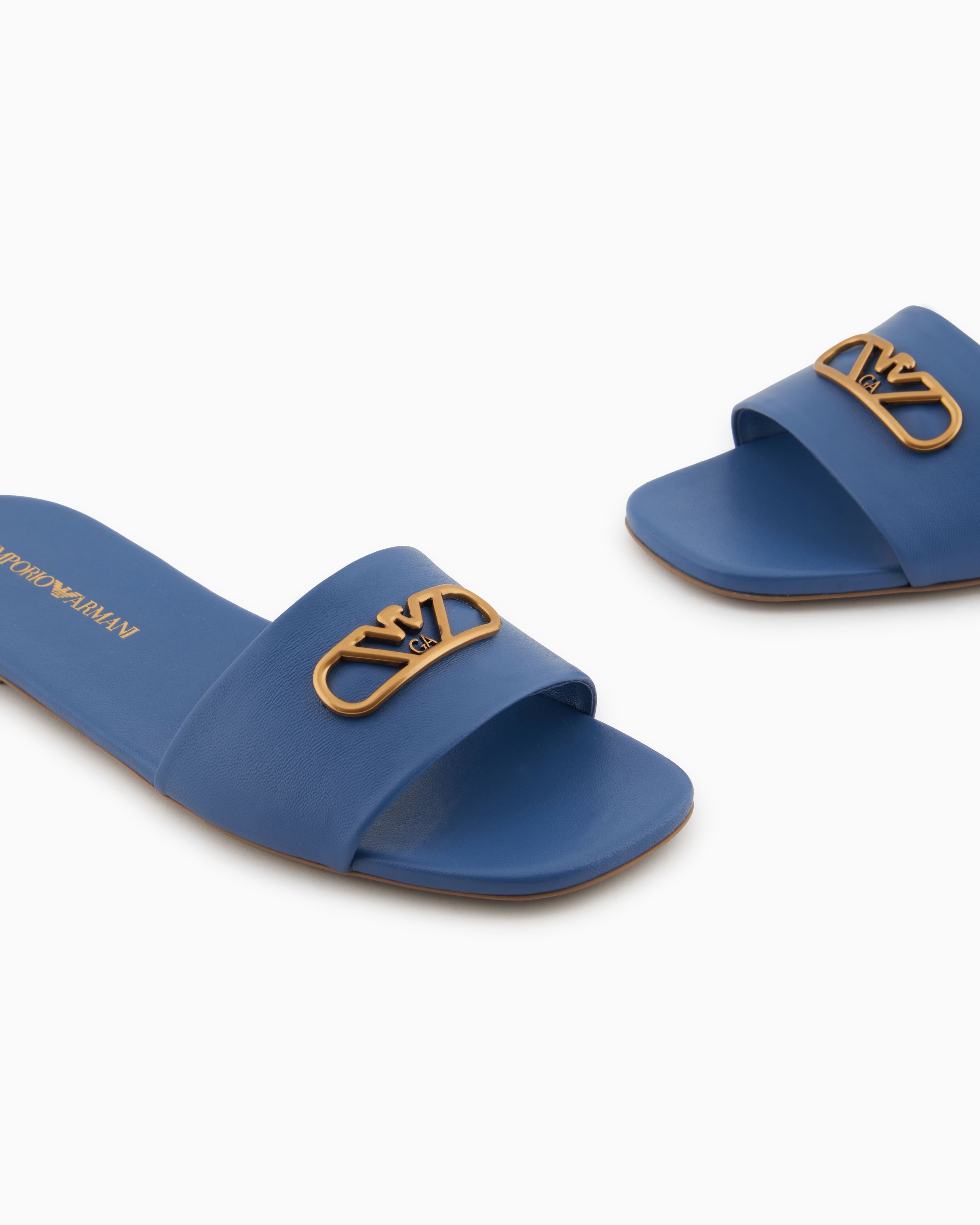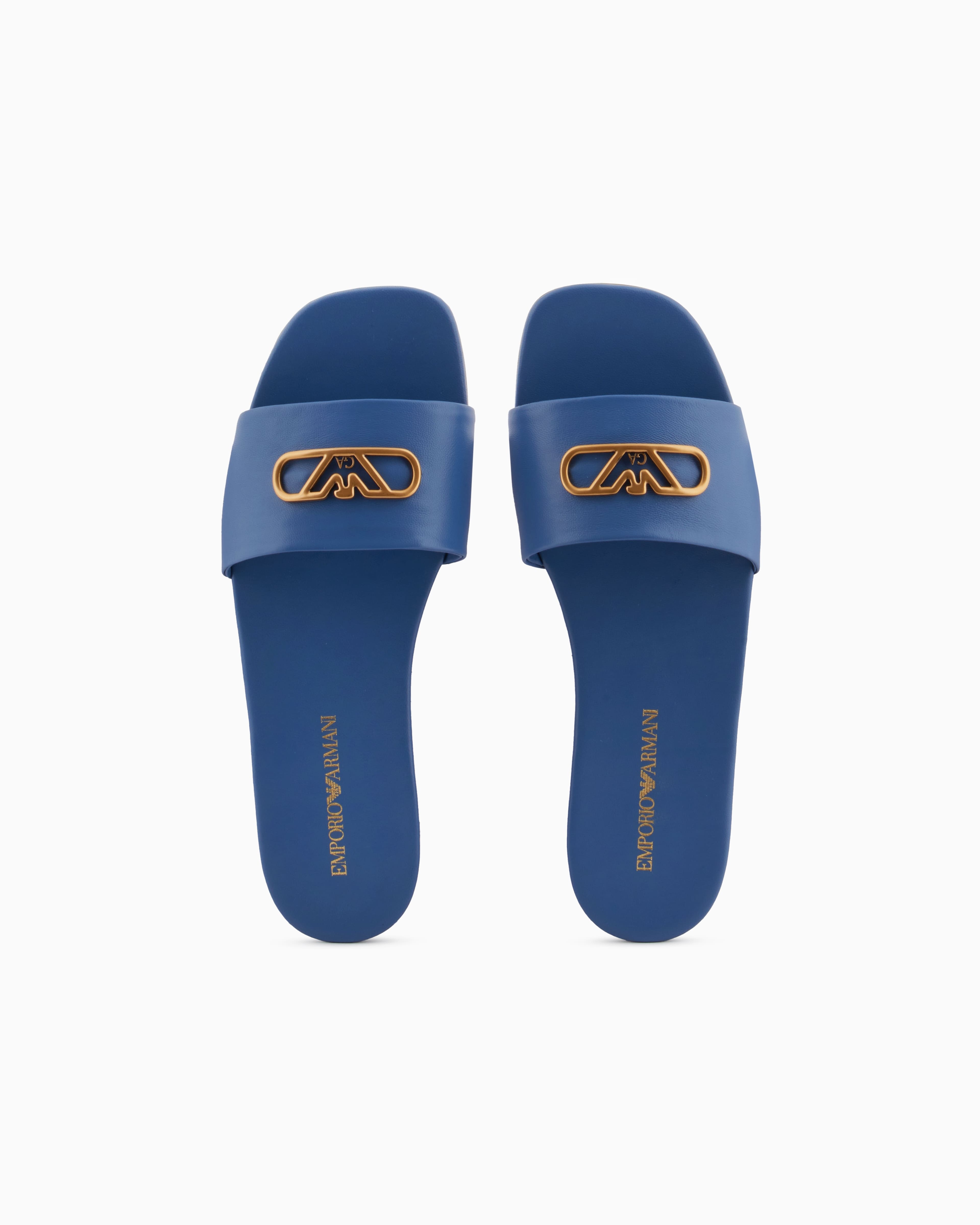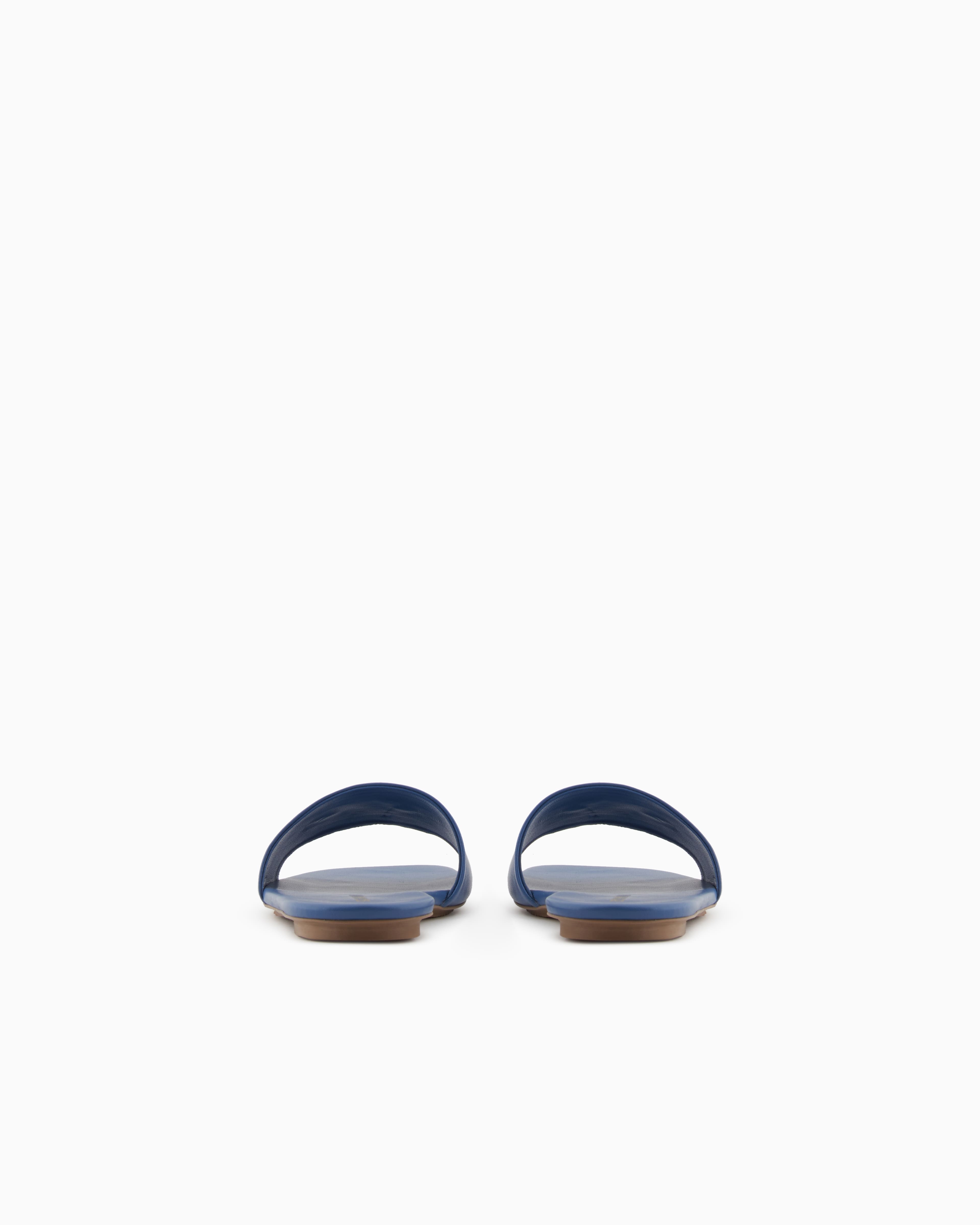 Жіночі шльопанці Emporio Armani поєднують лаконічний дизайн і преміальні матеріали. Модель виготовлена з м’якої наппи, що забезпечує комфорт під час носіння. Насичений синій відтінок надає образу свіжості та легкості. Металева пластина з фірмовим орлом на верхній частині підкреслює впізнаваний стиль бренду. Шльопанці гармонійно поєднуються з легкими сукнями, спідницями або брюками, створюючи елегантні літні образи. Модель відображає прагнення до поєднання мінімалізму та вишуканості, пропонуючи універсальний варіант для міського гардеробу.