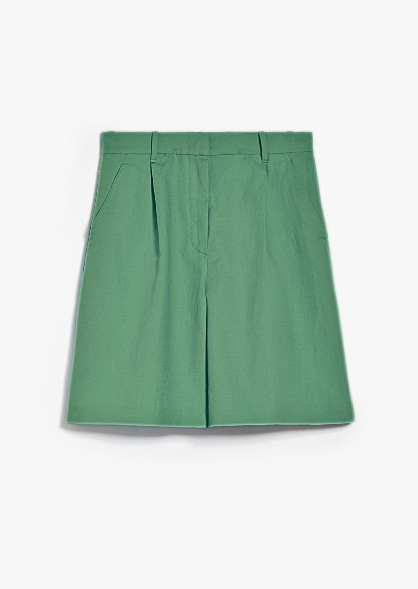 Шорти-бермуди невимушеного крою з бавовни та льону з виточками на талії, косими передніми кишенями та прорізними задніми кишенями. Застібка-блискавка та гачок.
