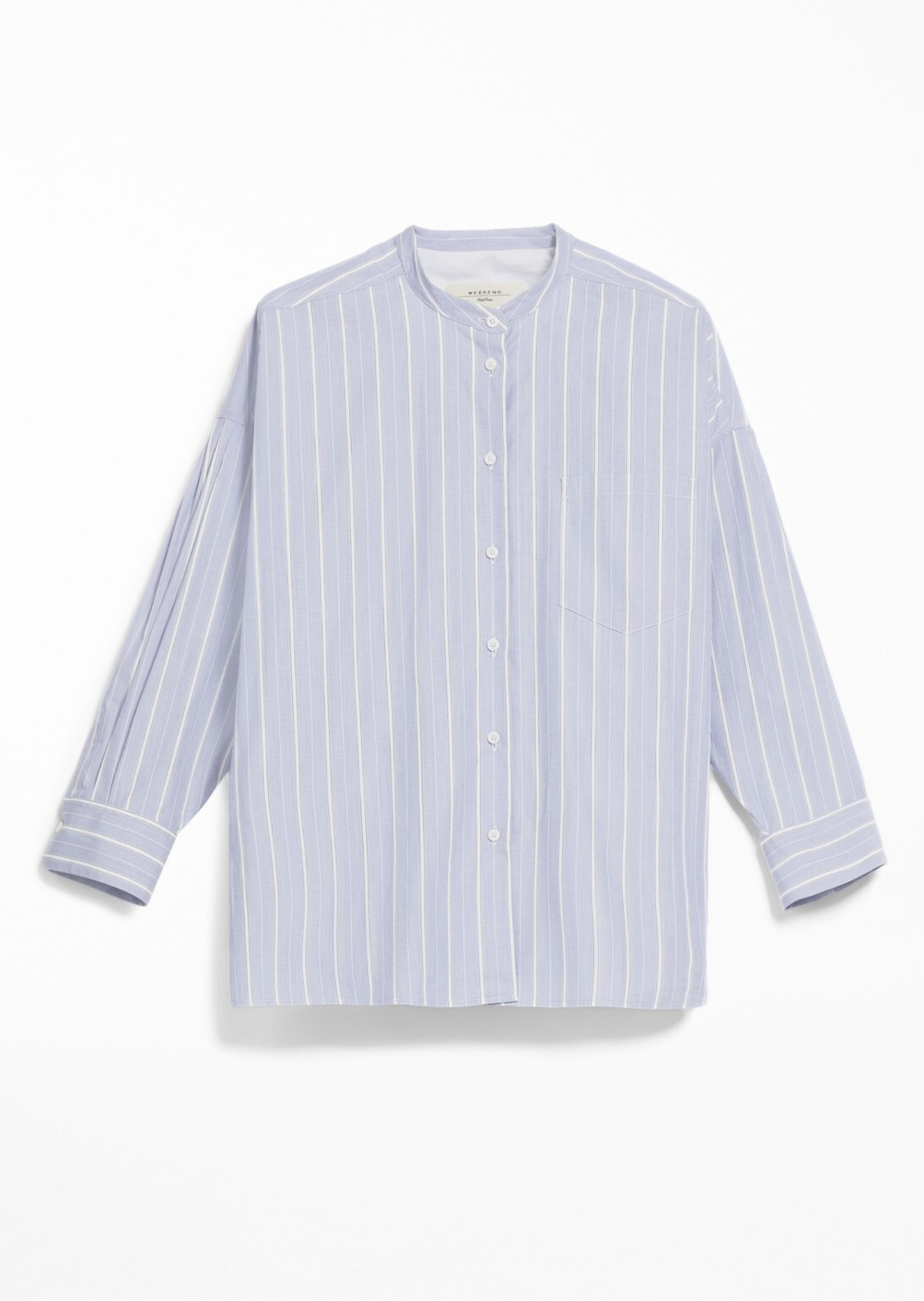 Блуза, виготовлена з бавовняного попліна, в смужку, комір стійка, спущене плече зі складаннями. Модель прикрашена складками на спині та має вільну посадку. Застібається на перламутрові гудзики спереду.