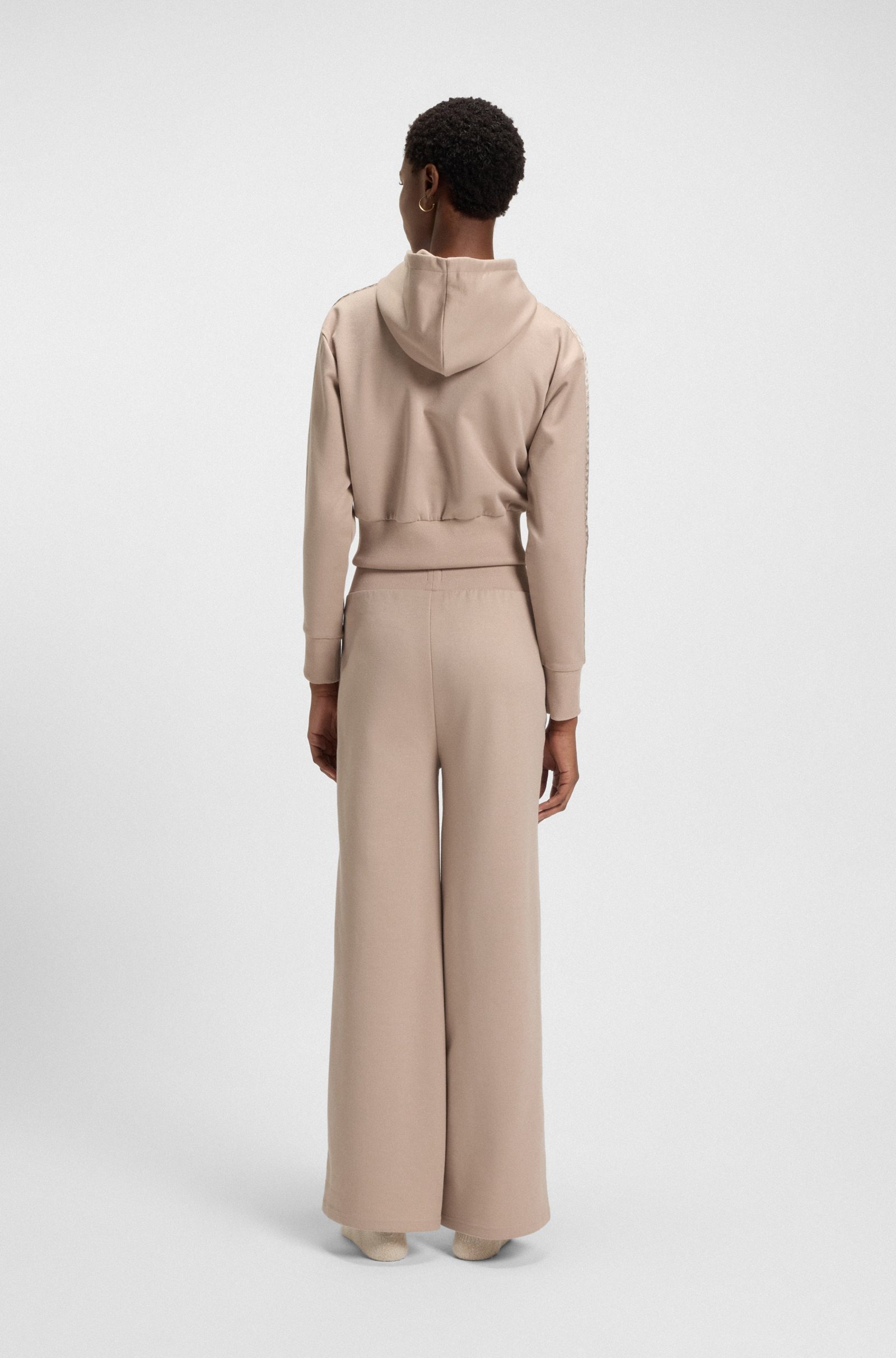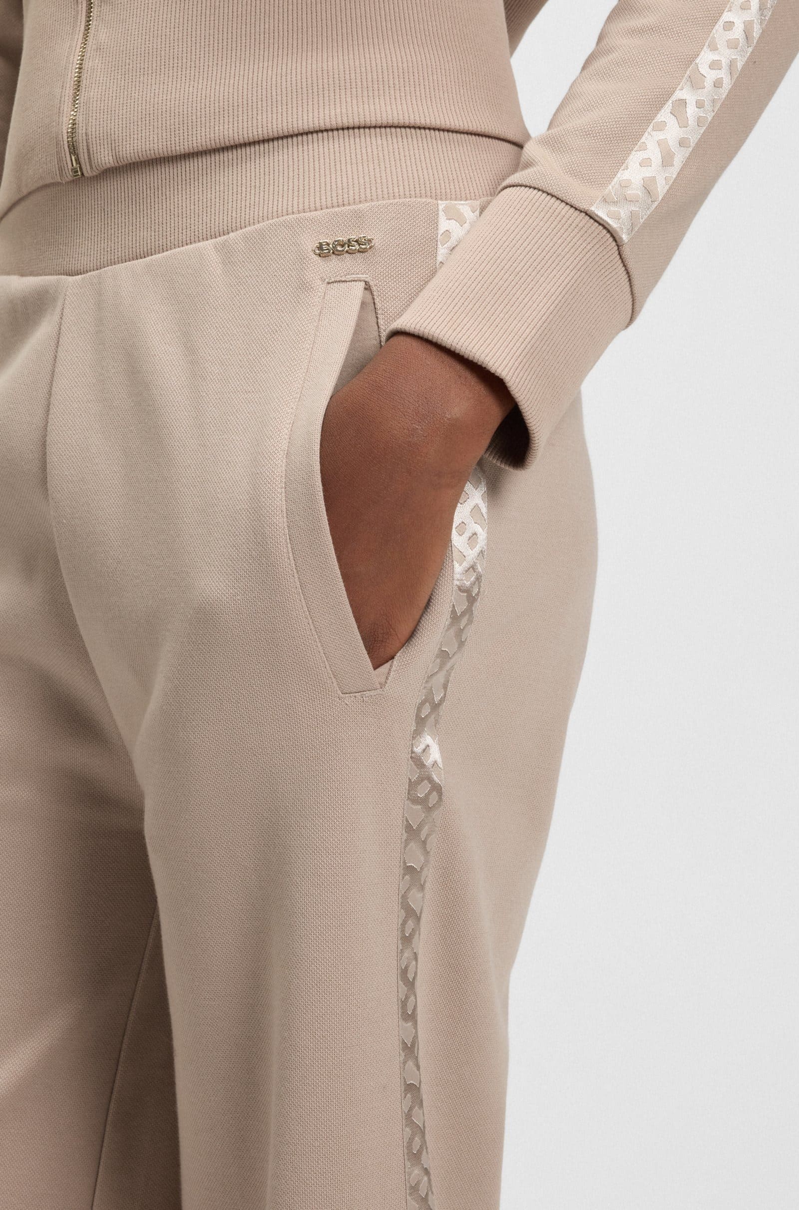 Домашні штани BOSS у світло‑бежевому кольорі виконані з піке‑трикотажу, що поєднує дихаючий бавовняний комфорт із елегантною текстурою. Прямий крій і закритий пояс додають образу акуратності та сучасного силуету. Стрічка з логотипом (monogram tape) з глянцевим ефектом додає тонкий брендовий акцент. Практичні бічні кишені роблять модель максимально зручною для щоденного носіння вдома. Ці штани — ідеальна база для домашнього гардеробу, яка витончено поєднує комфорт із преміальним стилем.