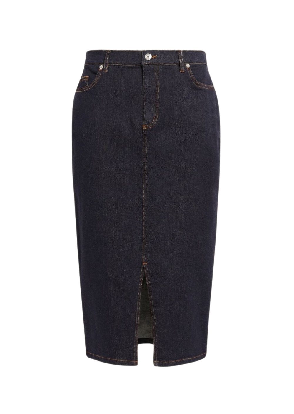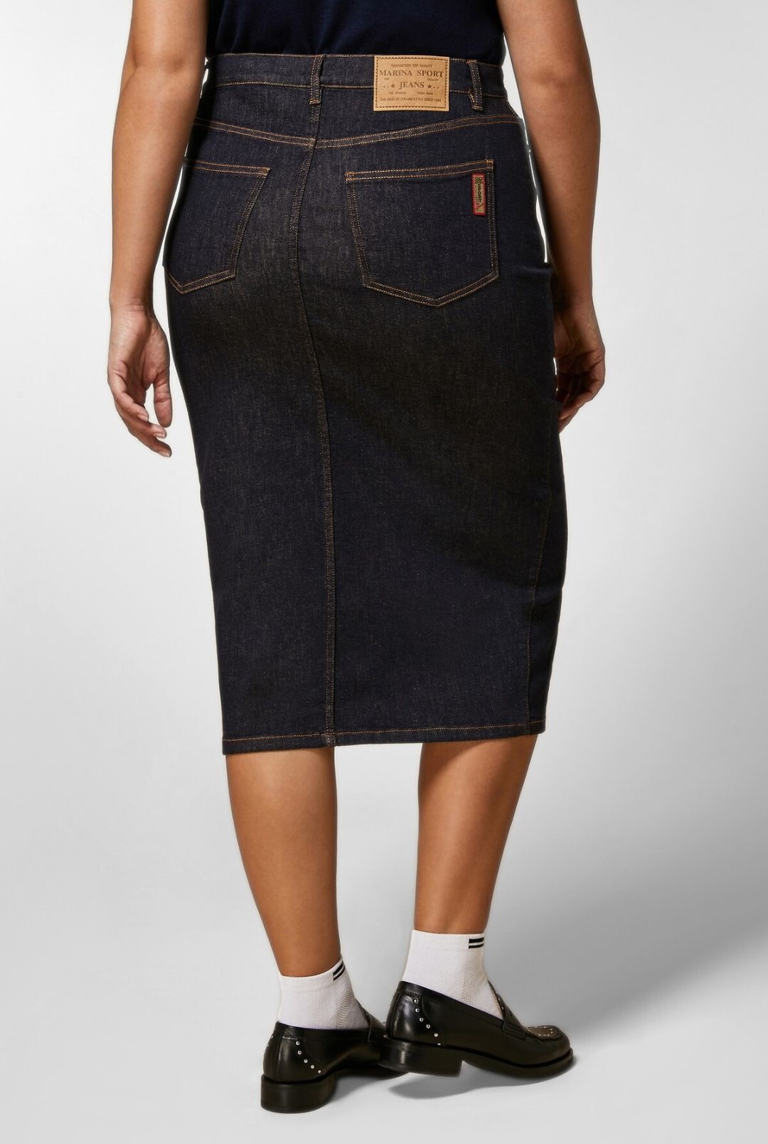 Спідниця міді з пятьма кишенями з еластичного деніму, з потайною застібкою на блискавку та гудзик, петлі для ременя на талії.