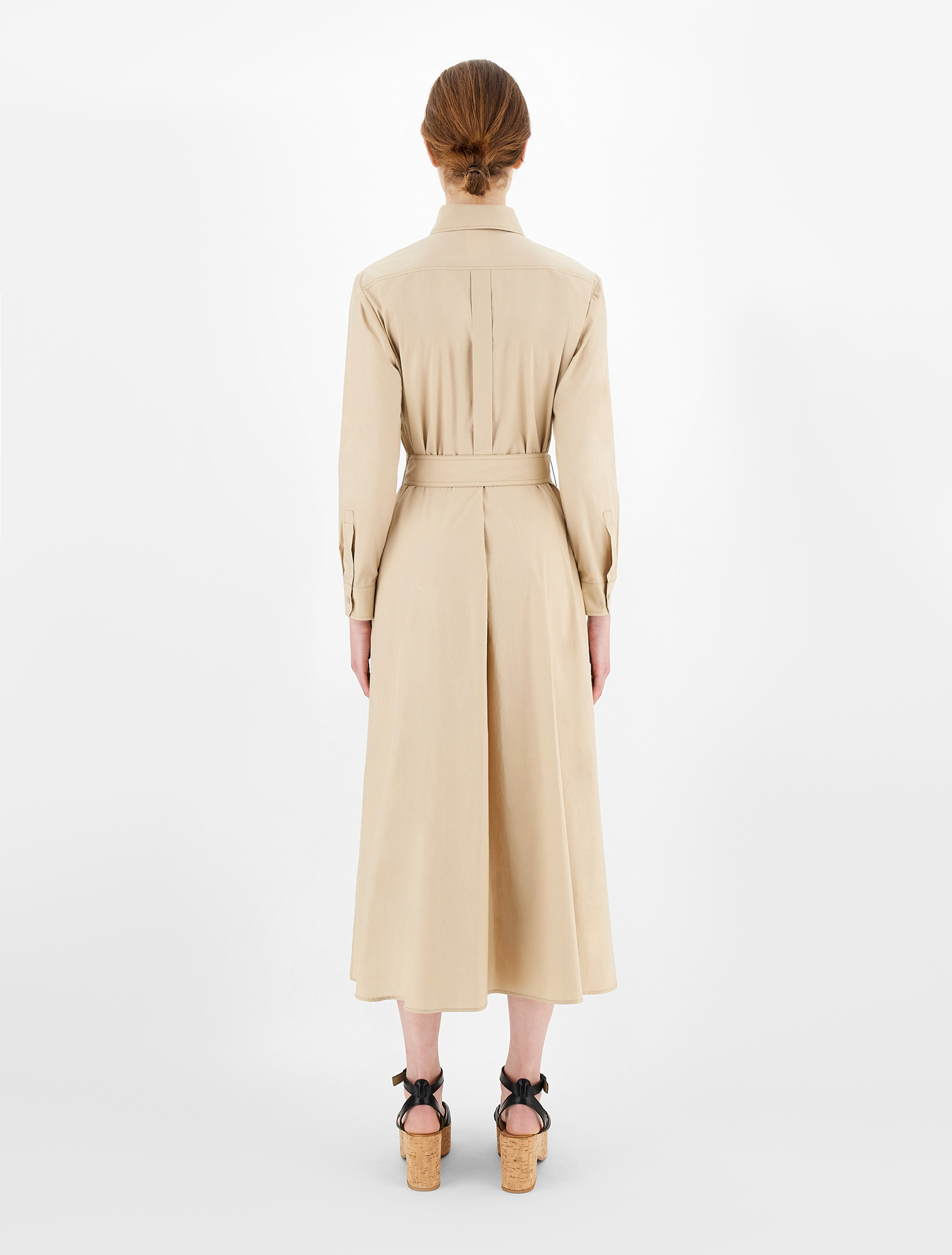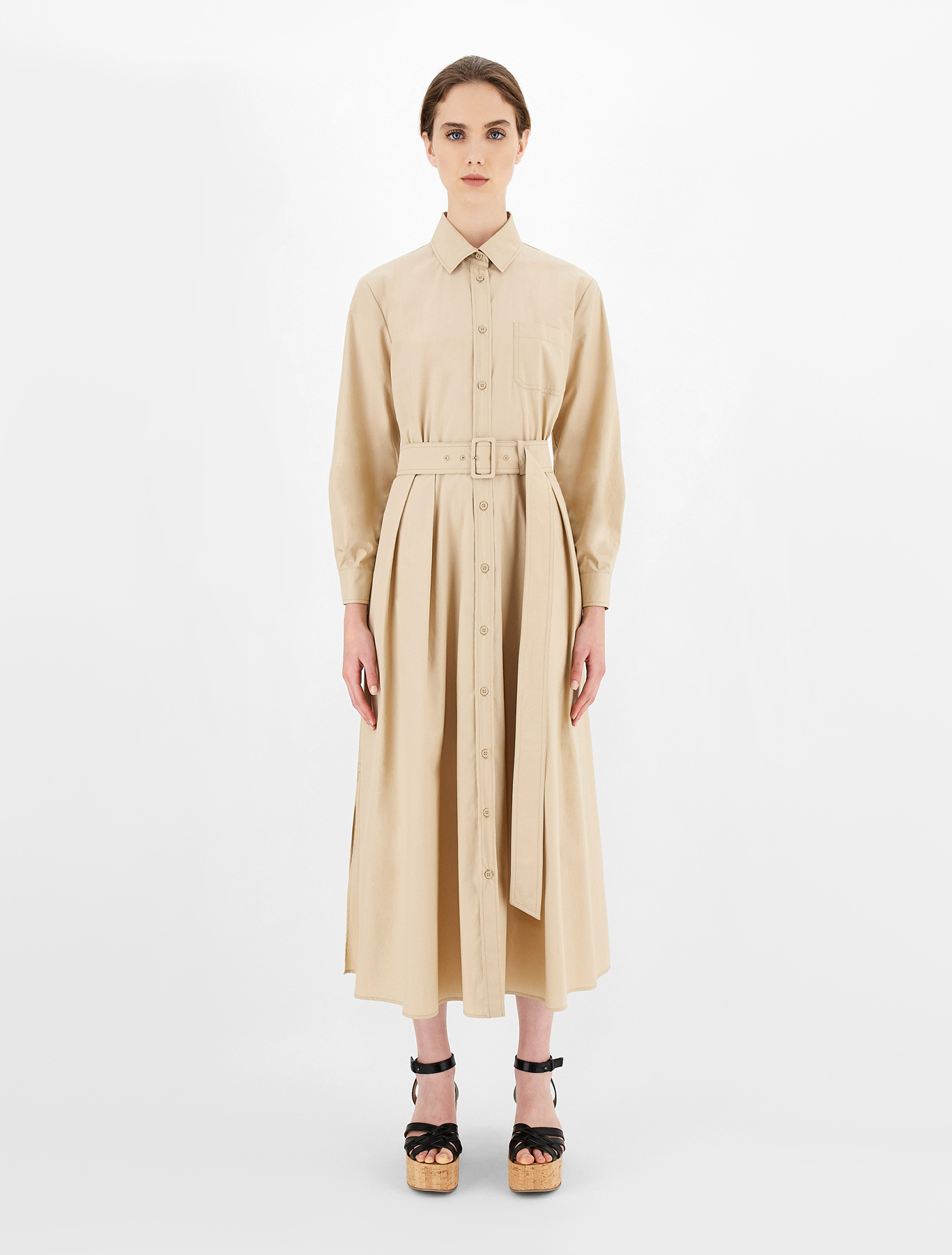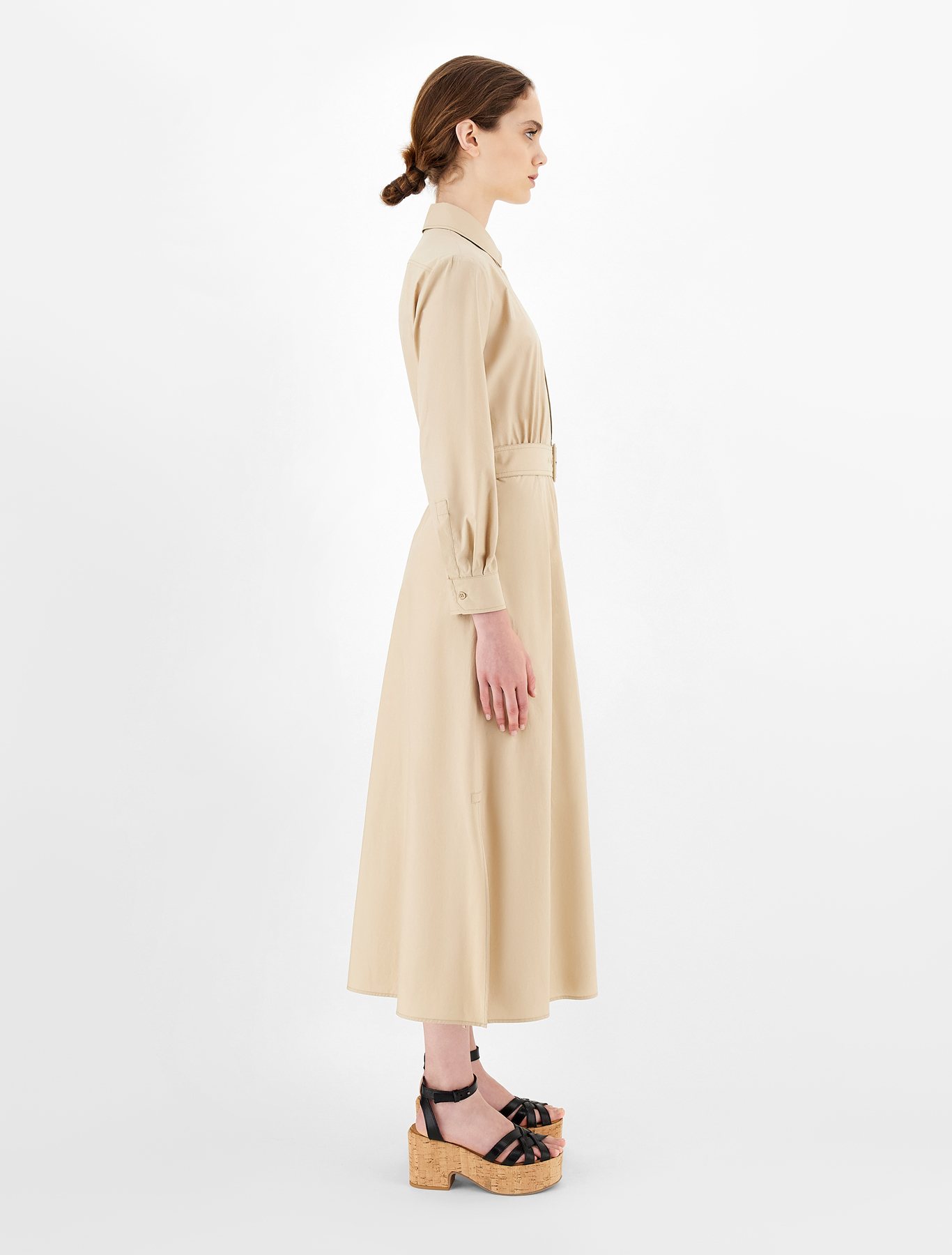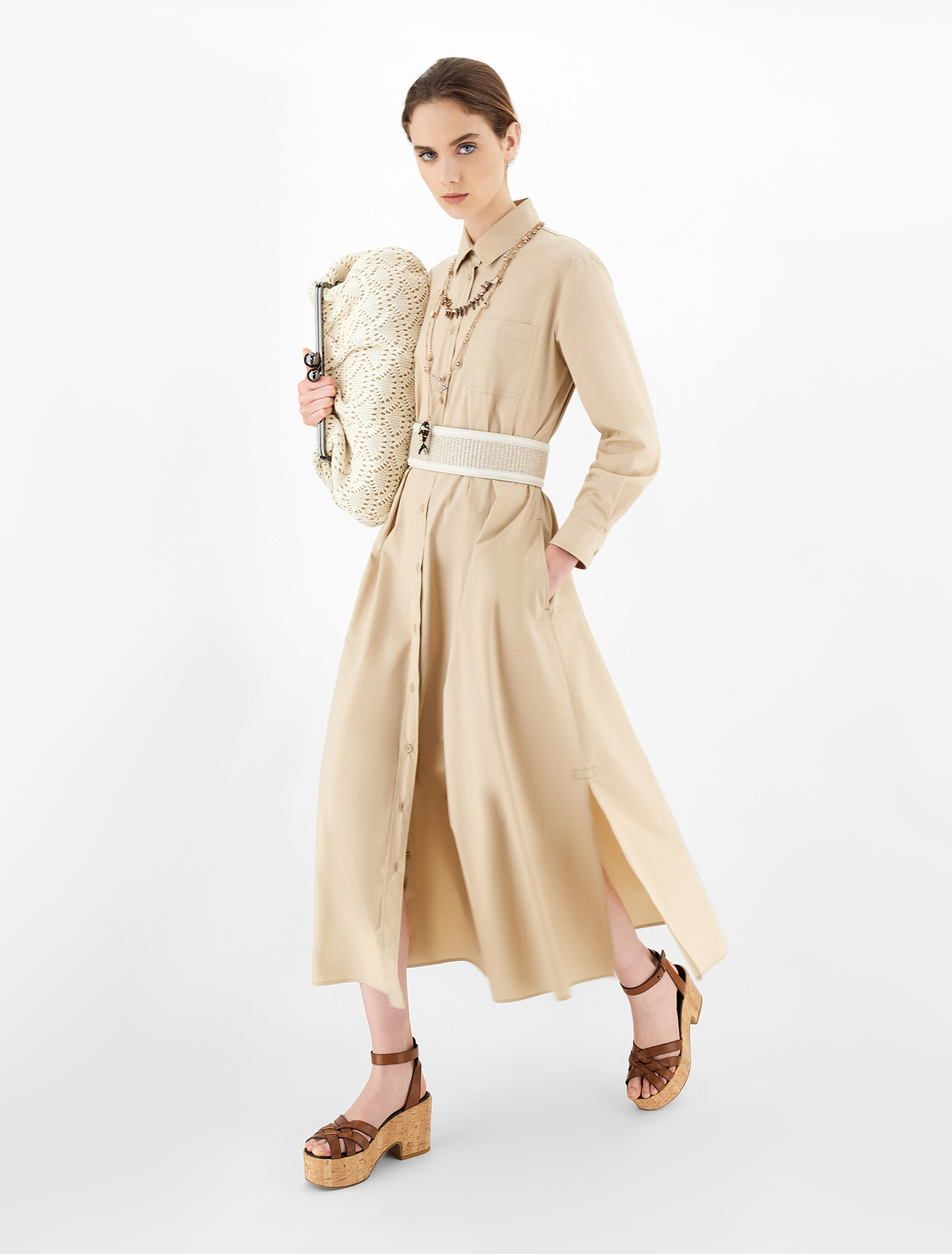 Довга сукня прямого крою, виготовлена з шовкового крепу, з вирізом човником, короткими рукавами і широкими бічними розрізами по подолу. Капляста застібка на маленький гудзик ззаду.