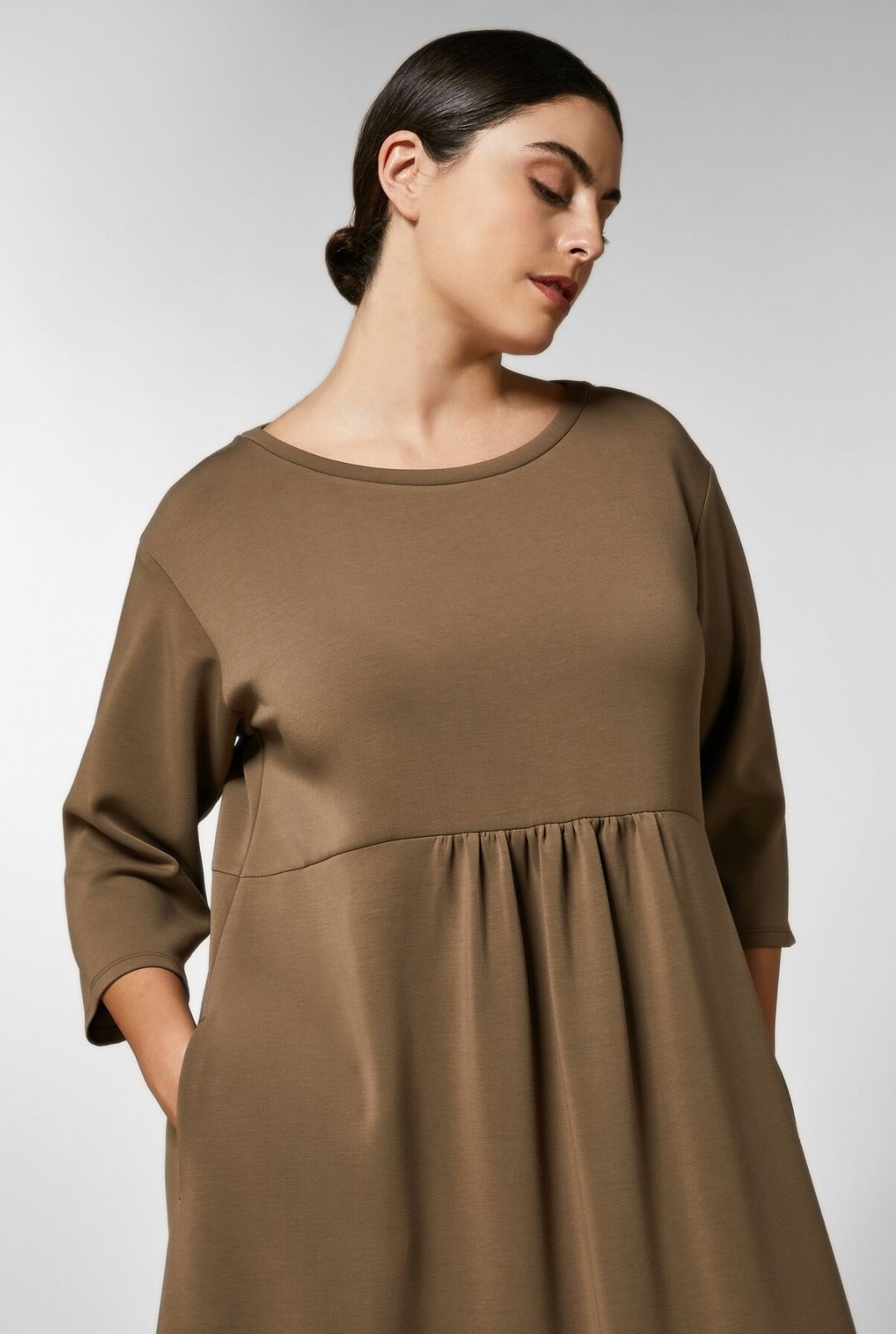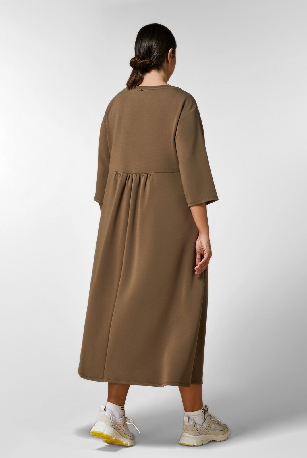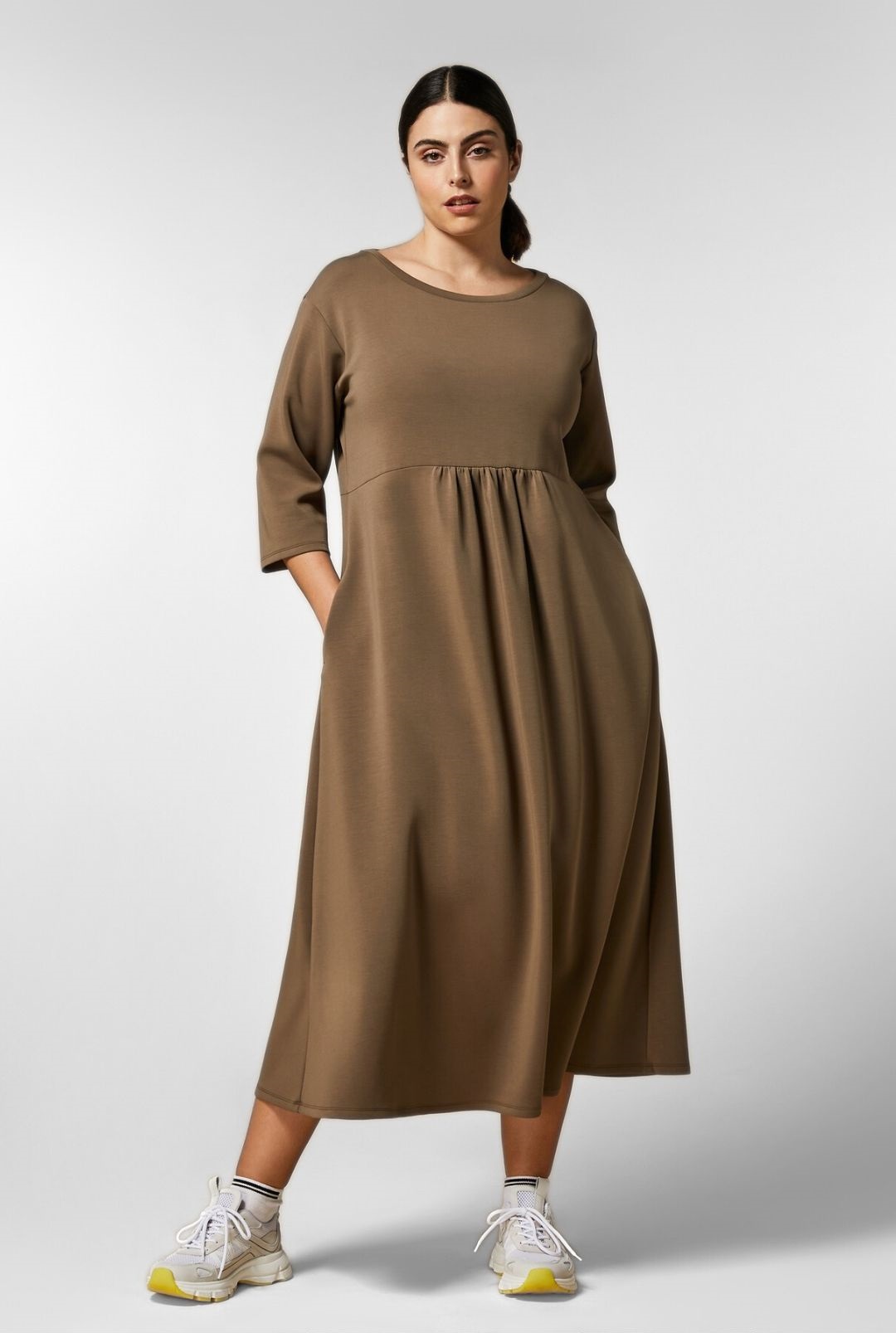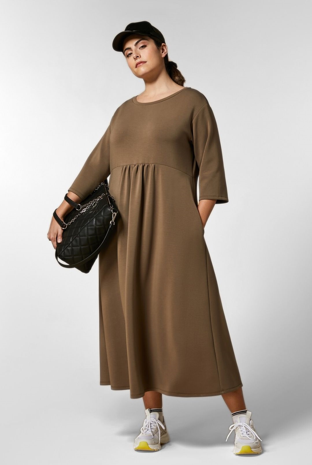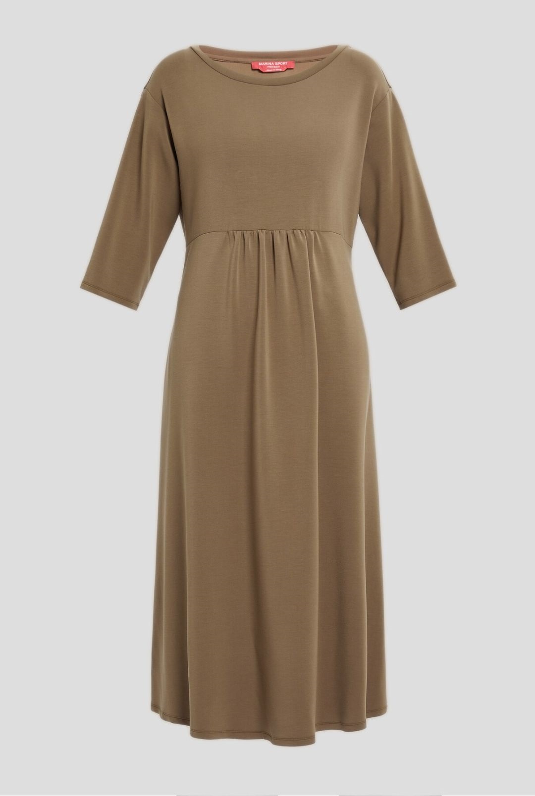 Довга сукня оливкового кольору зі змішаного трикотажу. Розкльошена модель, відрізна під грудьми з круглим вирізом і призбираними складками під грудьми, рукавом три чверті, а також бічними кишенями на швах. Ця модель надасть жіночності повсякденним випадкам.